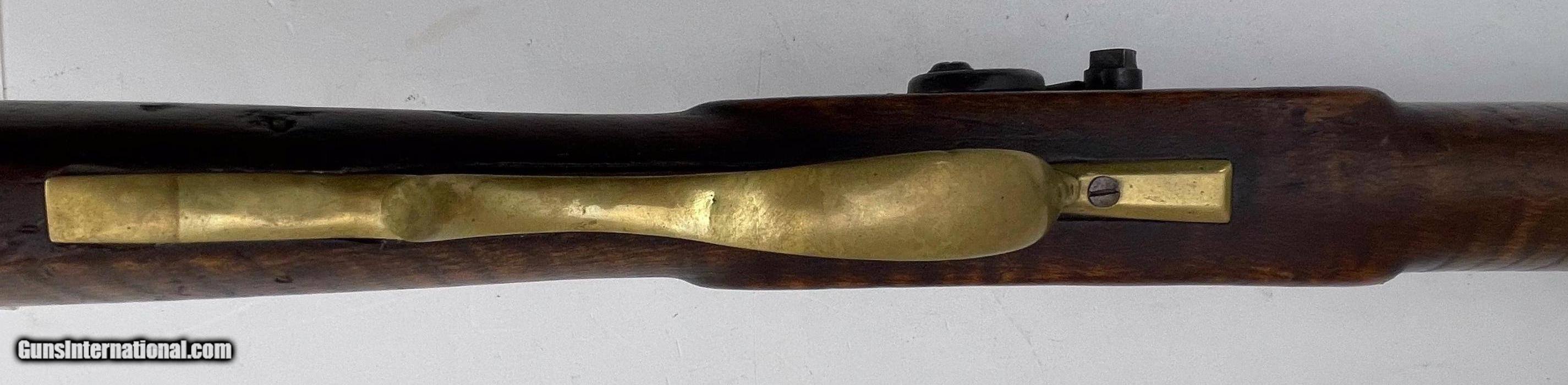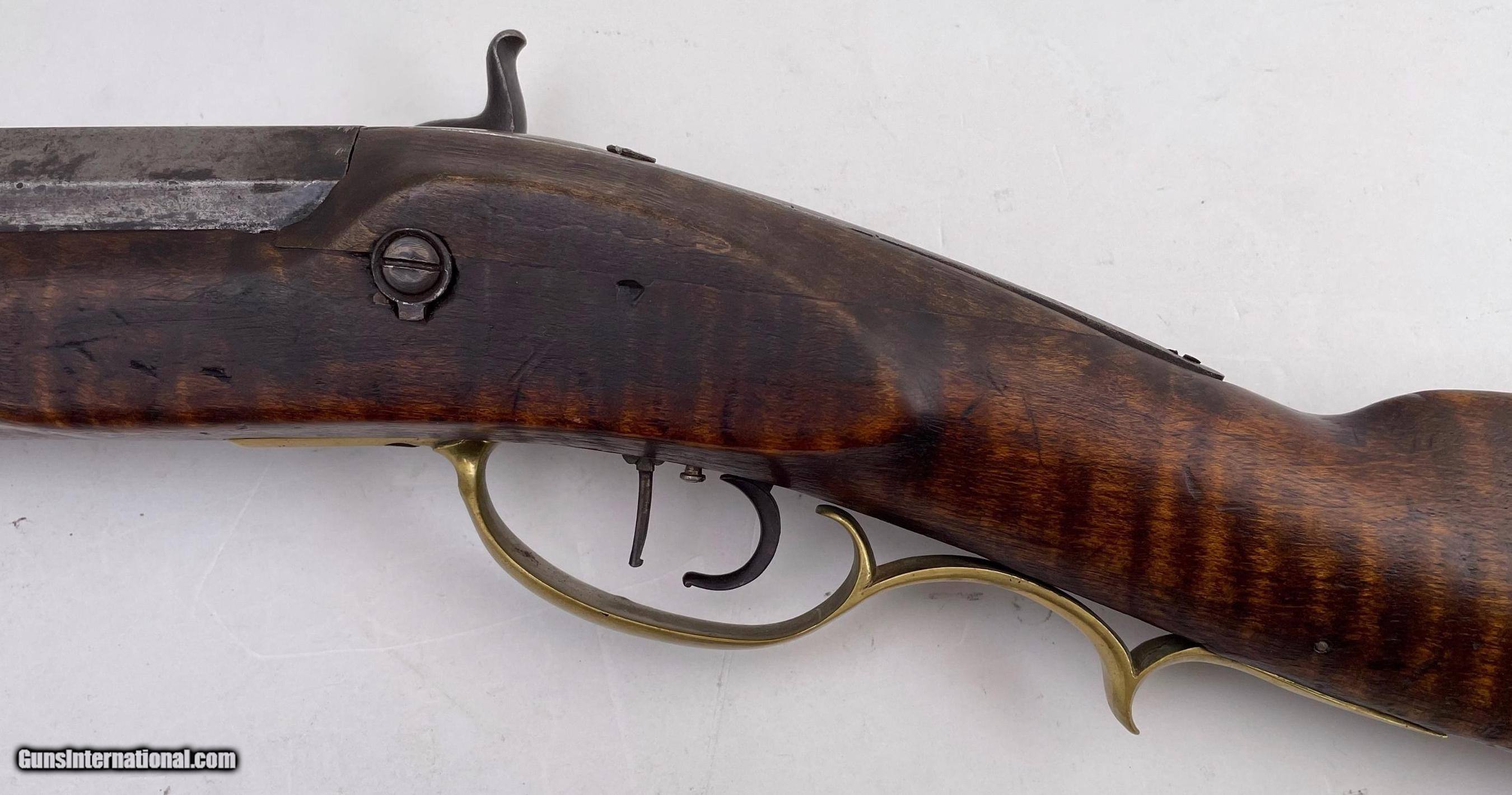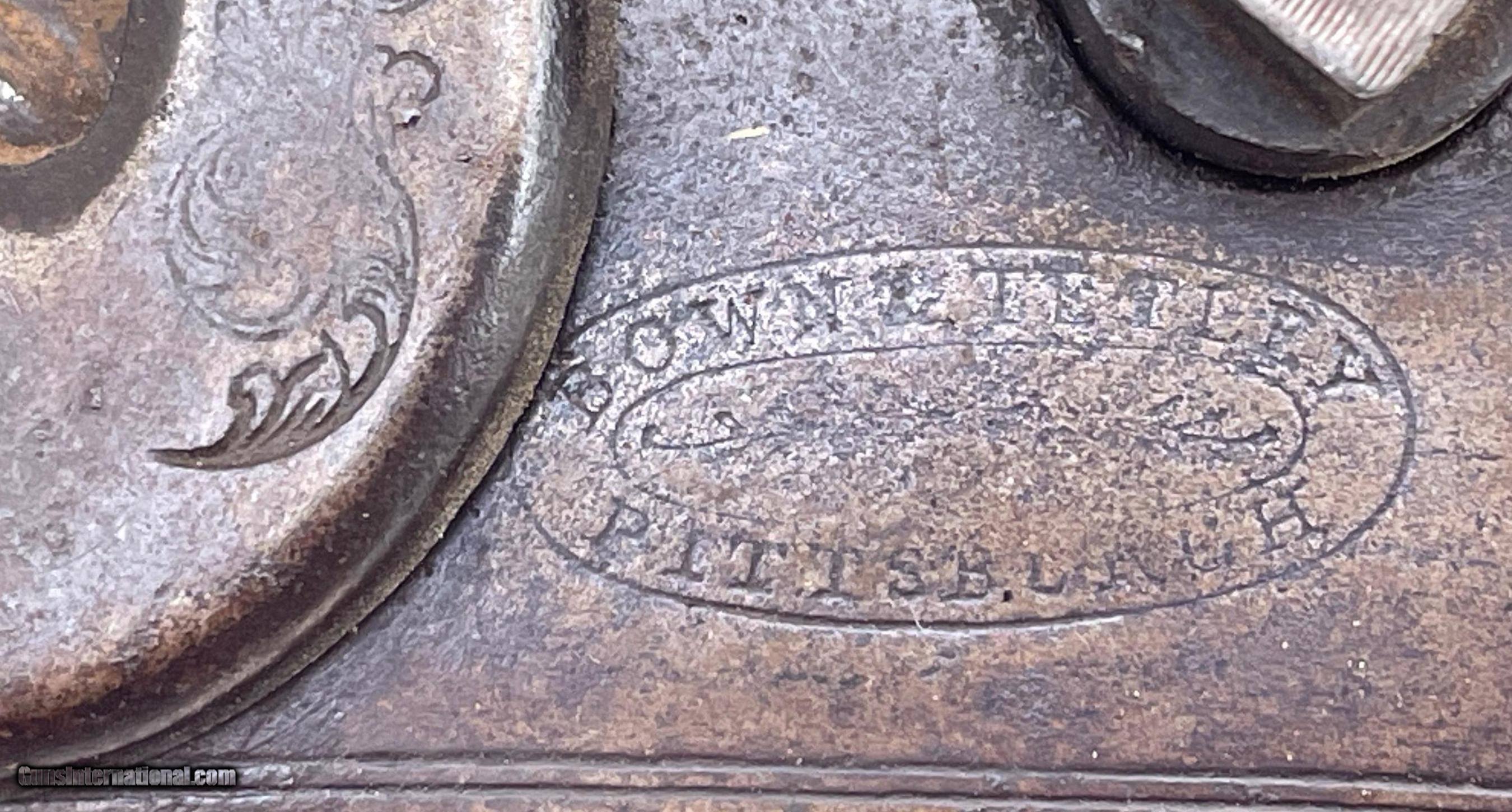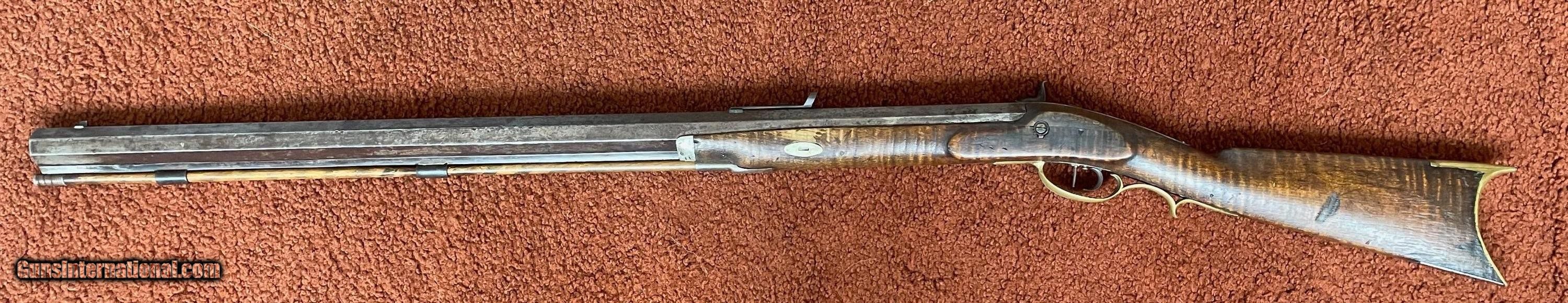 Description: The lockplate is marked "Bown & Tetley Pittsburgh The weight is over 14 1/2 Pounds. Barrel measures 1.30" across the flats at the muzzle. The bore measures .58" The rifling is a very fast twist and the bore is somewhat dark but the lands and grooves are strong. See photos for condition. SOLD Antique: Yes Manufacturer: J.C. Johnson Barrel Length: 34 |