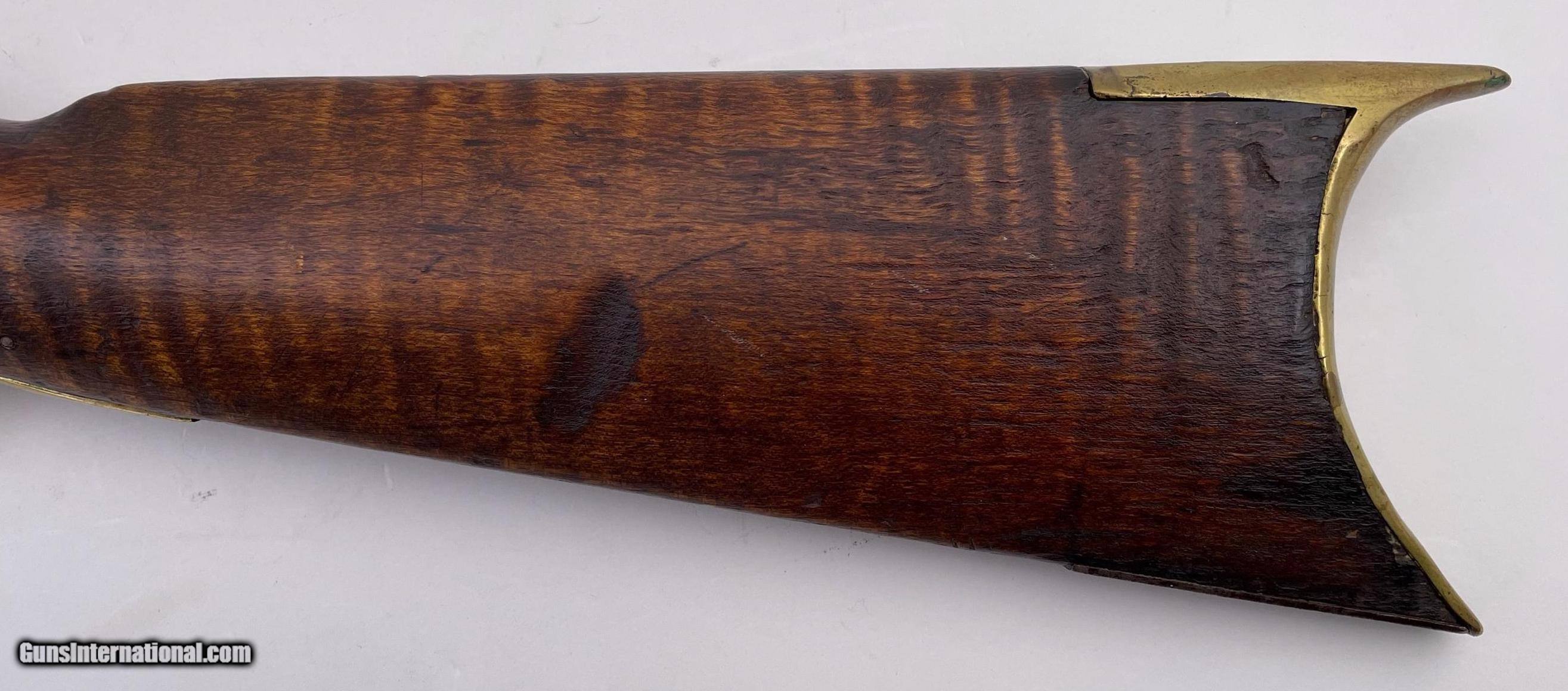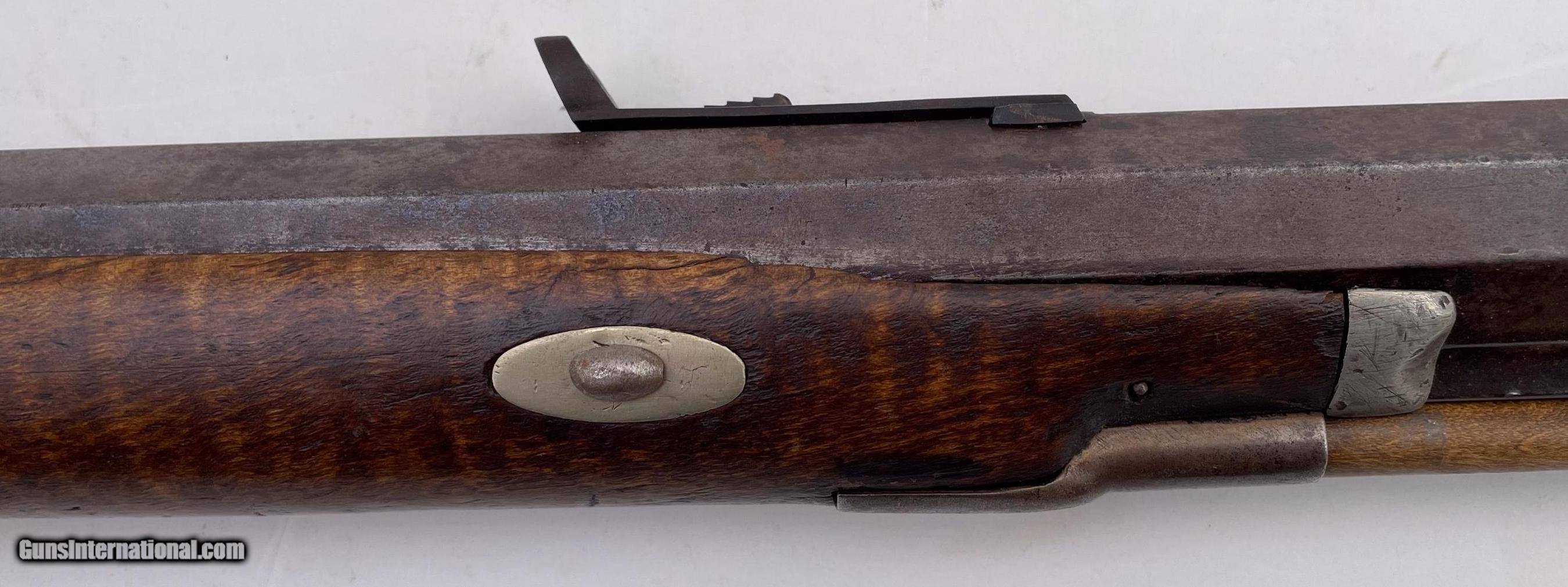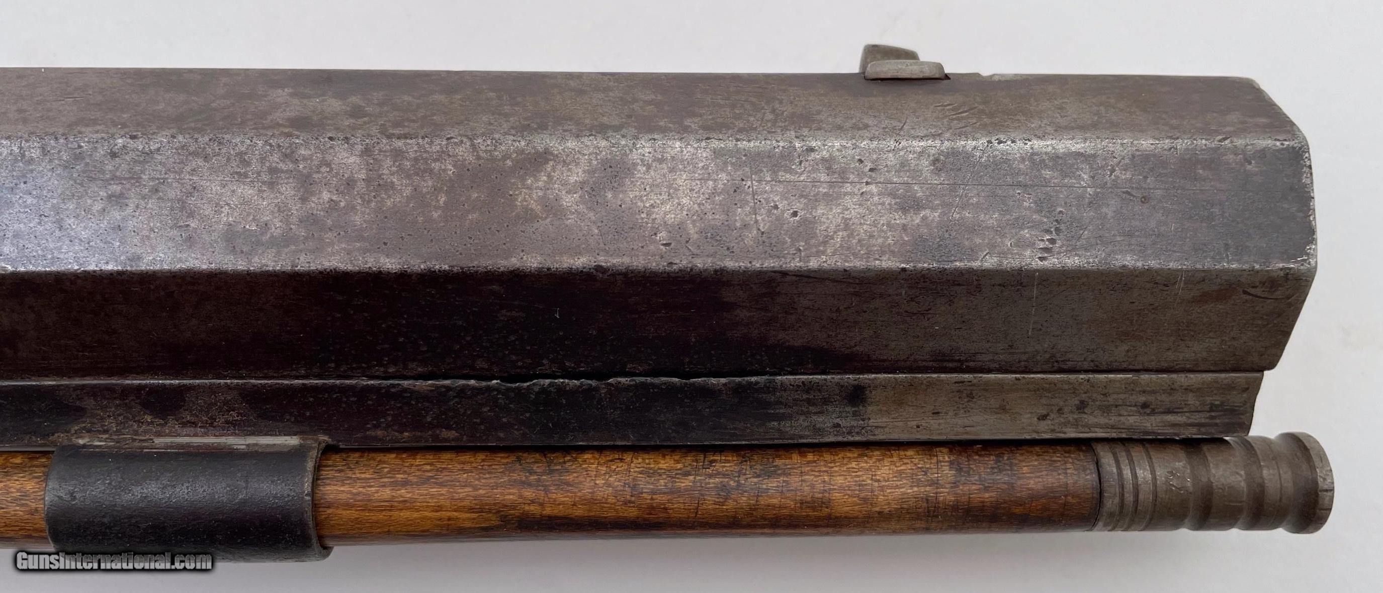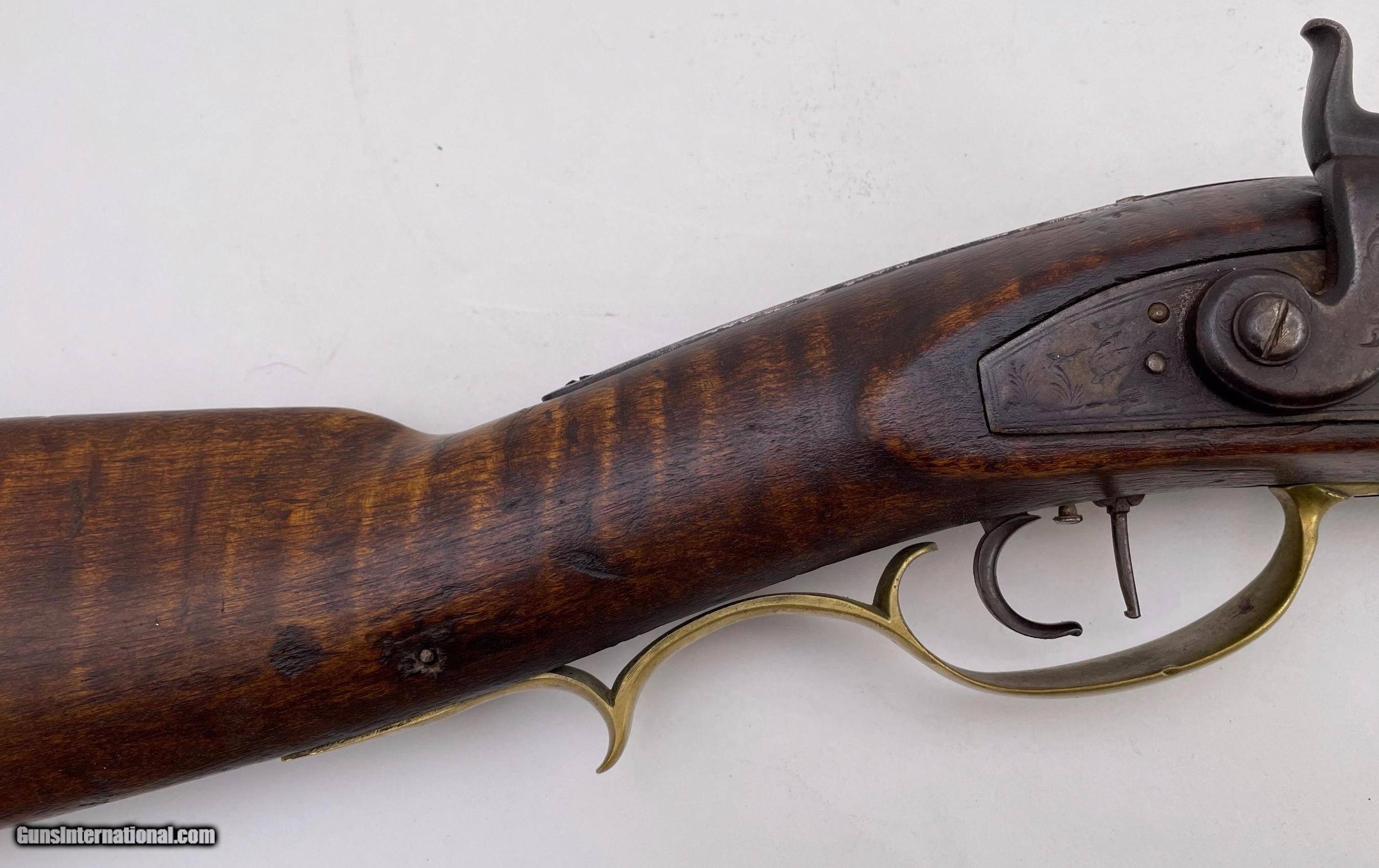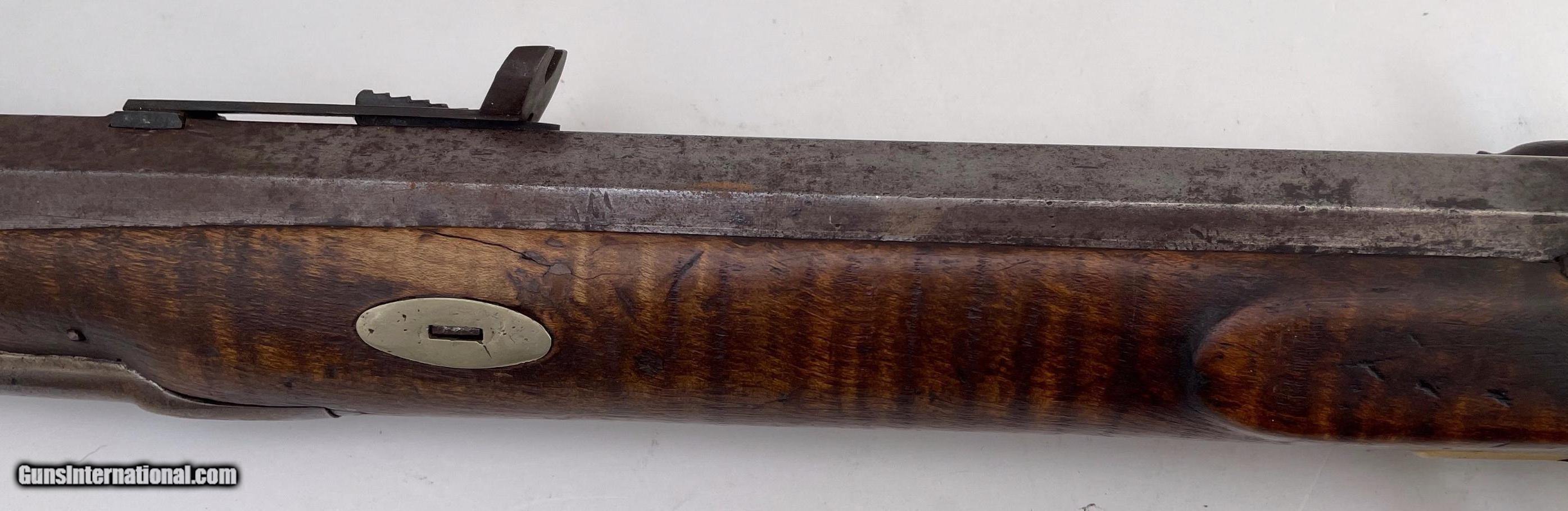 Description: The lockplate is marked "Bown & Tetley Pittsburgh The weight is over 14 1/2 Pounds. Barrel measures 1.30" across the flats at the muzzle. The bore measures .58" The rifling is a very fast twist and the bore is somewhat dark but the lands and grooves are strong. See photos for condition. SOLD Antique: Yes Manufacturer: J.C. Johnson Barrel Length: 34 |
