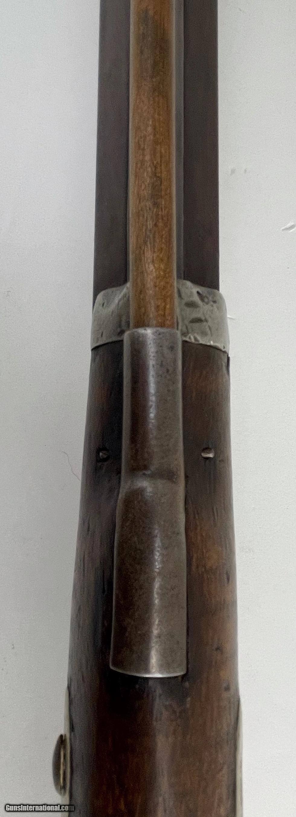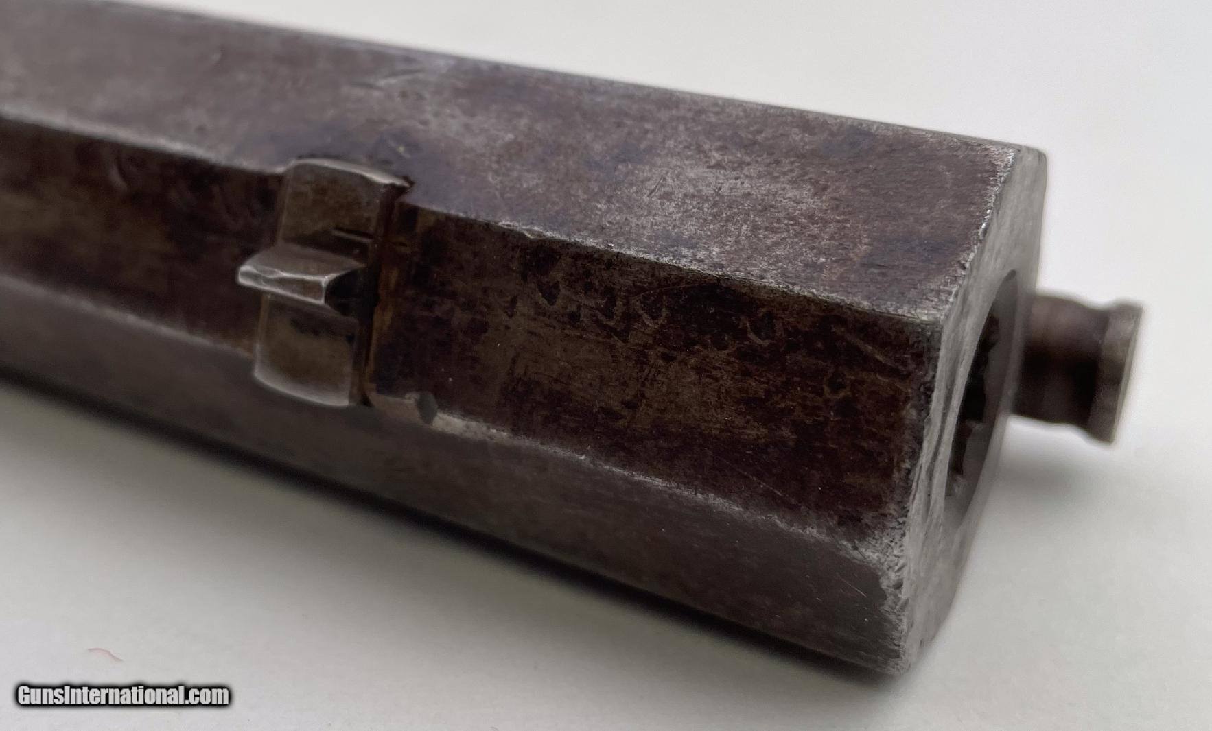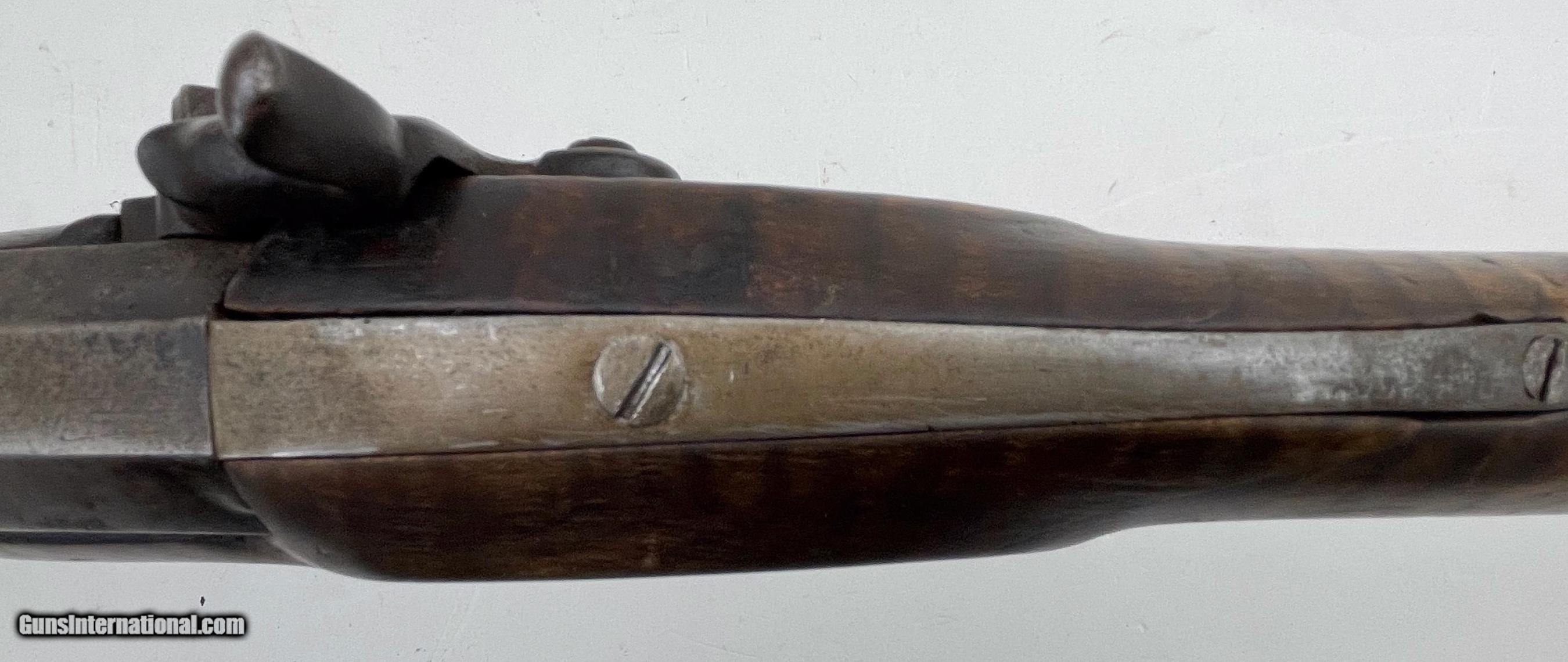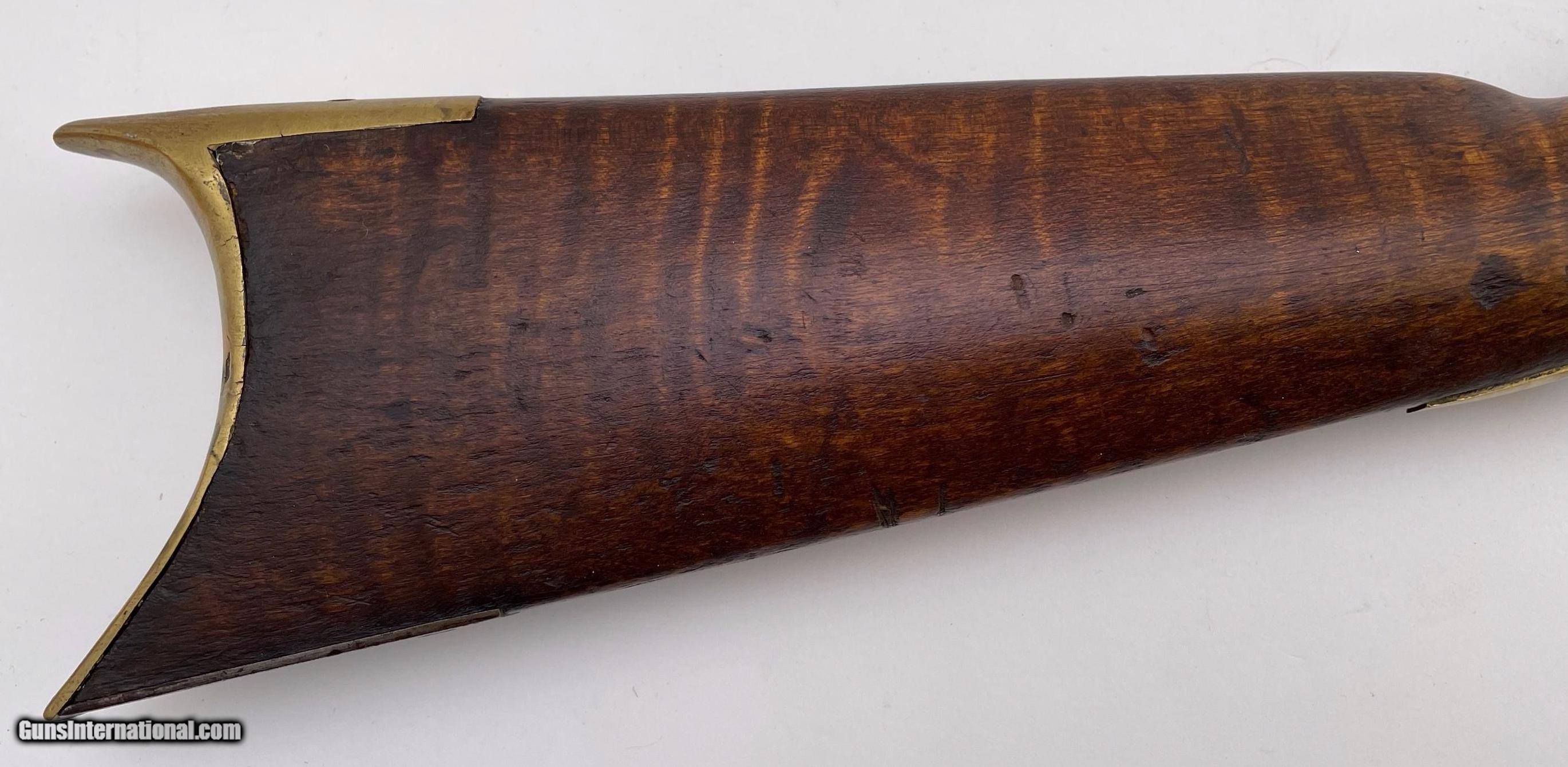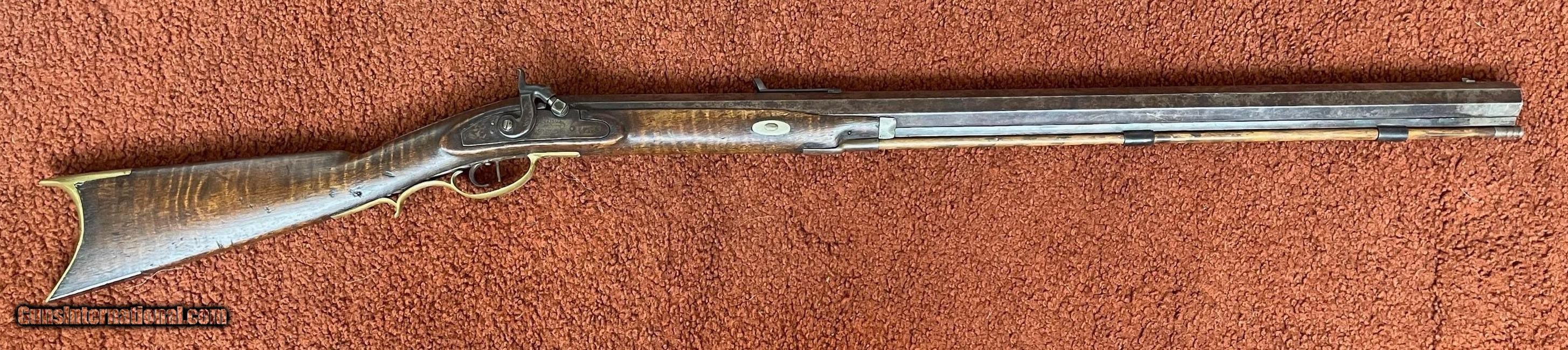 Description: The lockplate is marked "Bown & Tetley Pittsburgh The weight is over 14 1/2 Pounds. Barrel measures 1.30" across the flats at the muzzle. The bore measures .58" The rifling is a very fast twist and the bore is somewhat dark but the lands and grooves are strong. See photos for condition. SOLD Antique: Yes Manufacturer: J.C. Johnson Barrel Length: 34 |