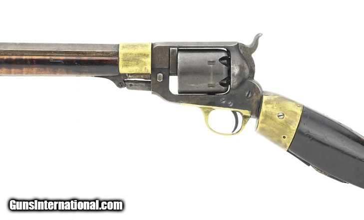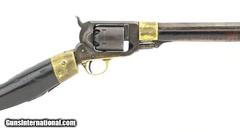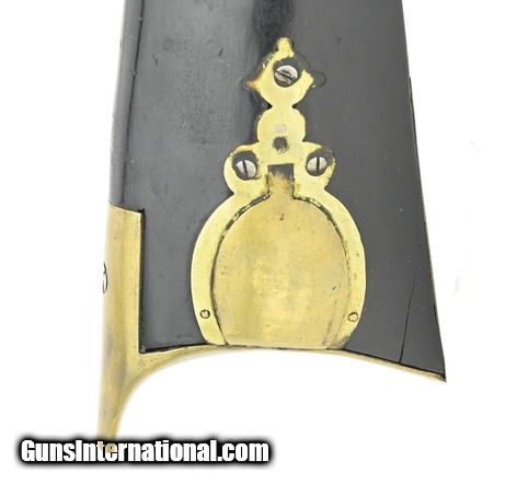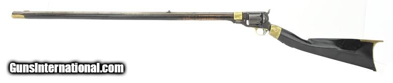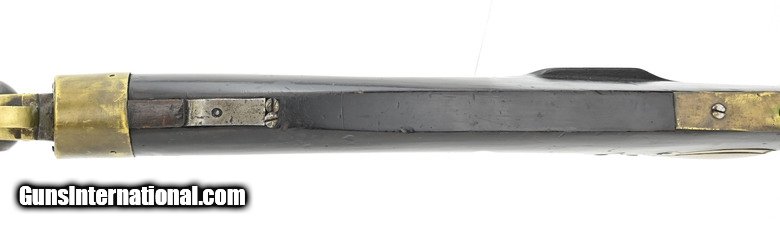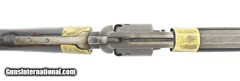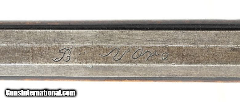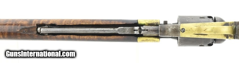Description: Very Unusual Revolving Percussion Rifle. Made from a Whitney Navy revolver. The overall length is approximately 51”. The 33½” octagon .36 caliber barrel has a good bore with strong rifling. All metal has a brown patina. The butt stock and forearm are very good with minor handling dings. The base of this rifle is a second model, fourth type Whitney Navy revolver. The action functions but the cylinder does not rotate (but you won’t shoot it anyway)! The top of the barrel is engraved “B Vore”. Benjamin F. Vore (1814-1889) operated in Somerset, PA, and New Paris, PA. If you’re into oddities, then this Vore revolving rifle fits the bill. It may well be unique, have you ever seen another revolving Kentucky? SOLD Antique: Yes |