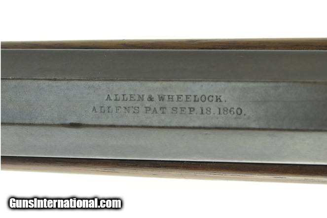 Allen Drop Breech .42 Rimfire caliber rifle. Large frame with barrel marked “Allen & Wheelock /Allen’s Pat Sept 18 1860”. Metal has a pleasing patina. Bore has strong rifling with light pitting. Action works perfectly. Wood is very good with a small age crack by the lower tang. Very good overall condition.
