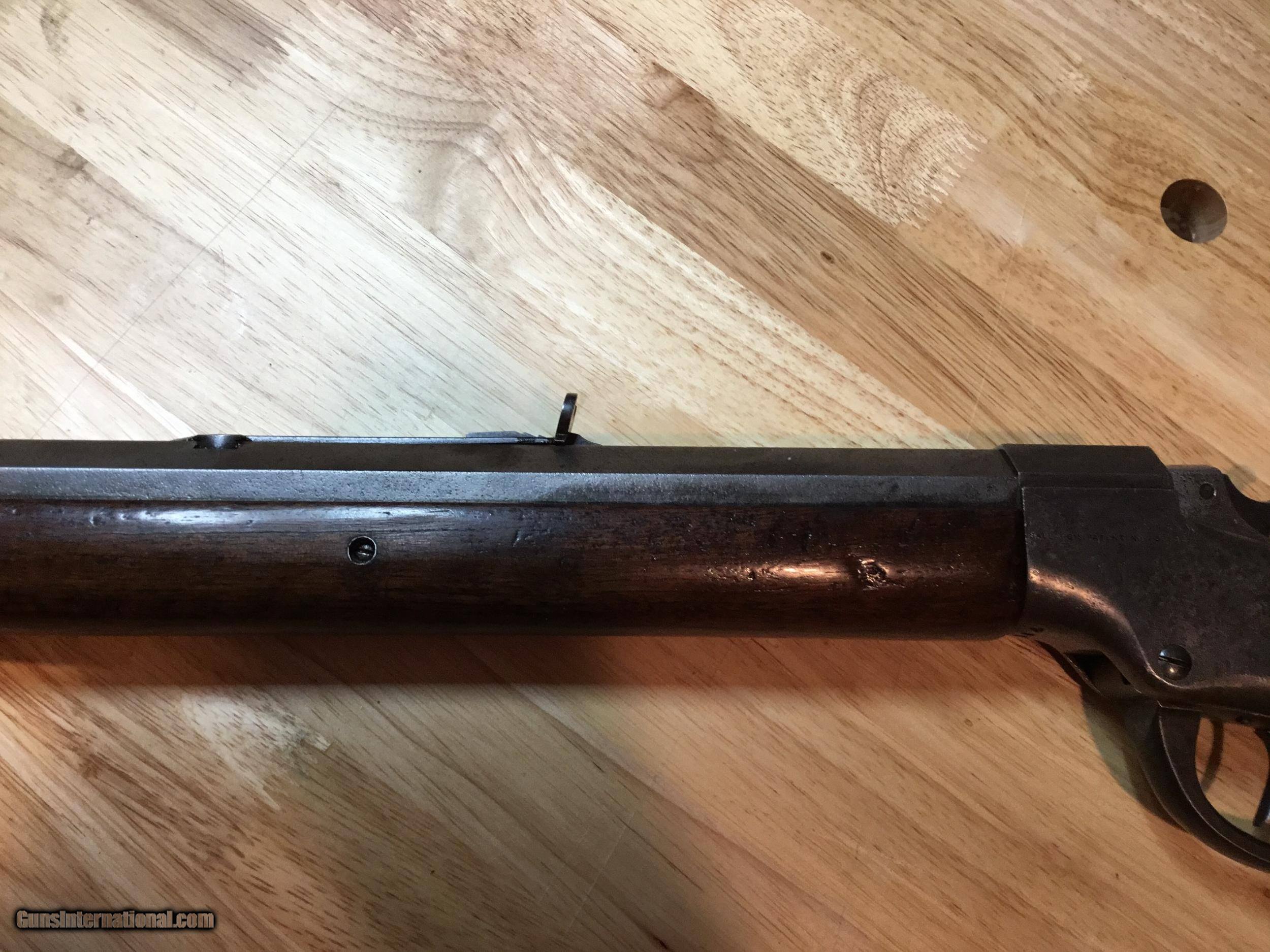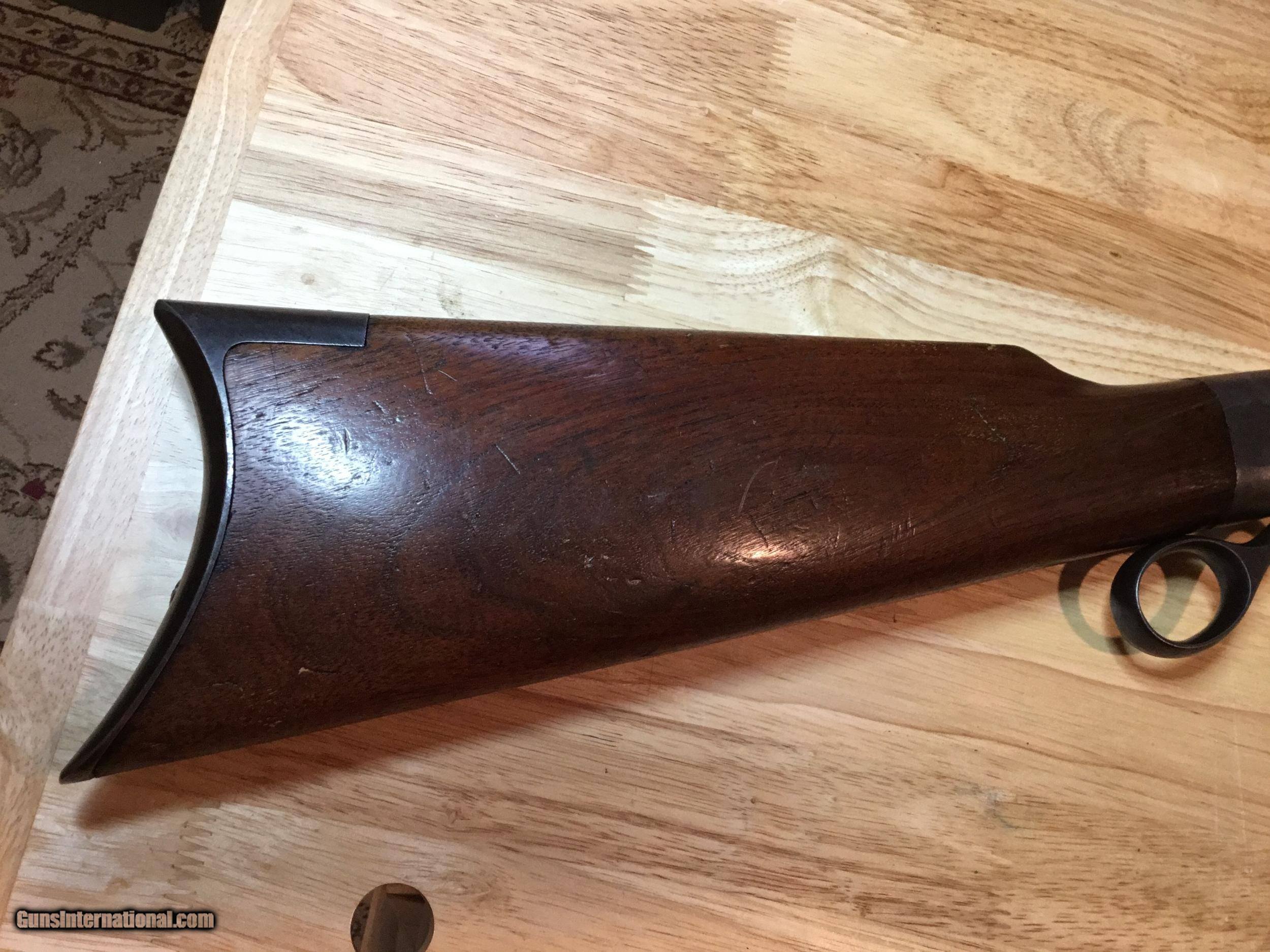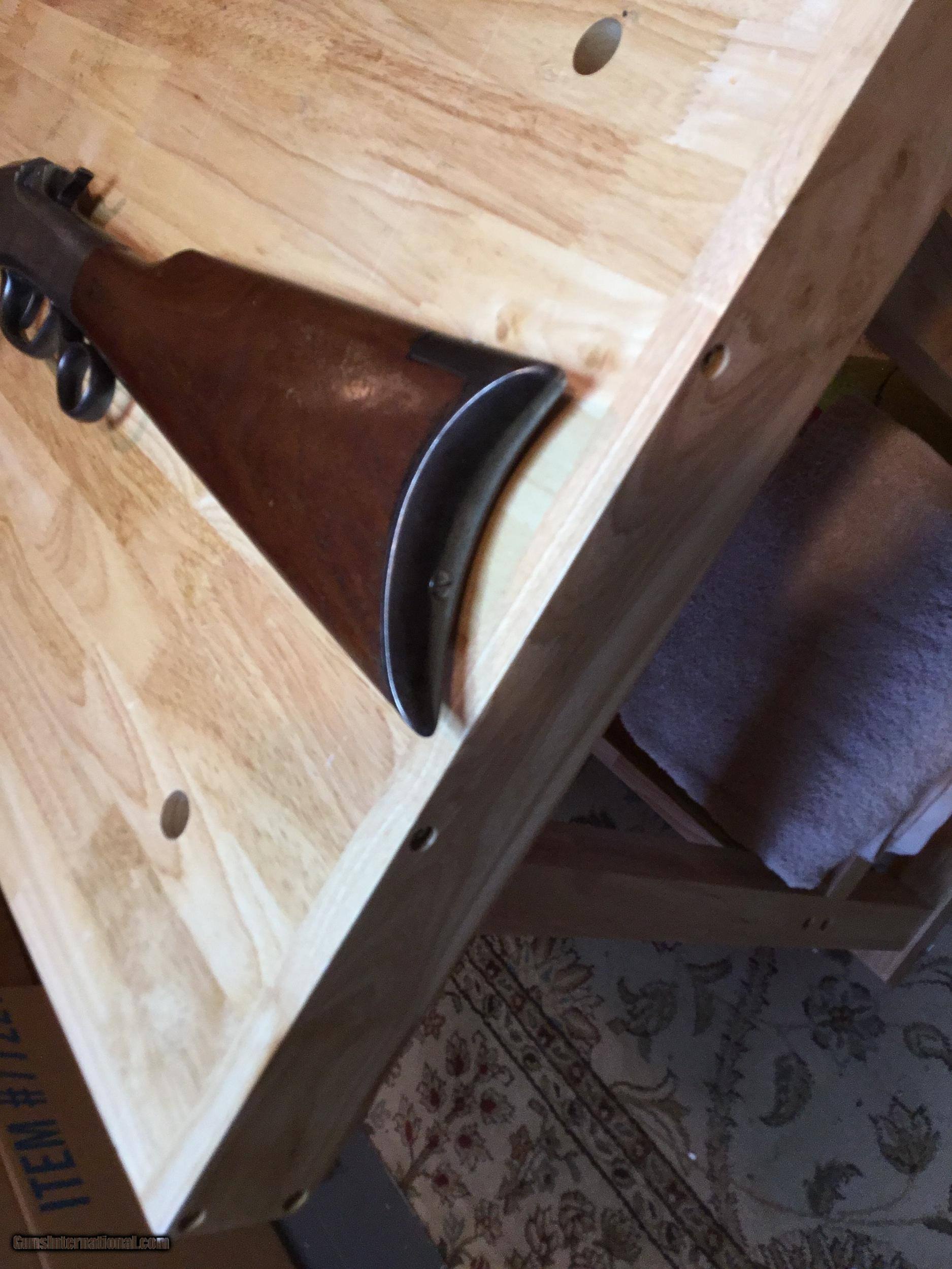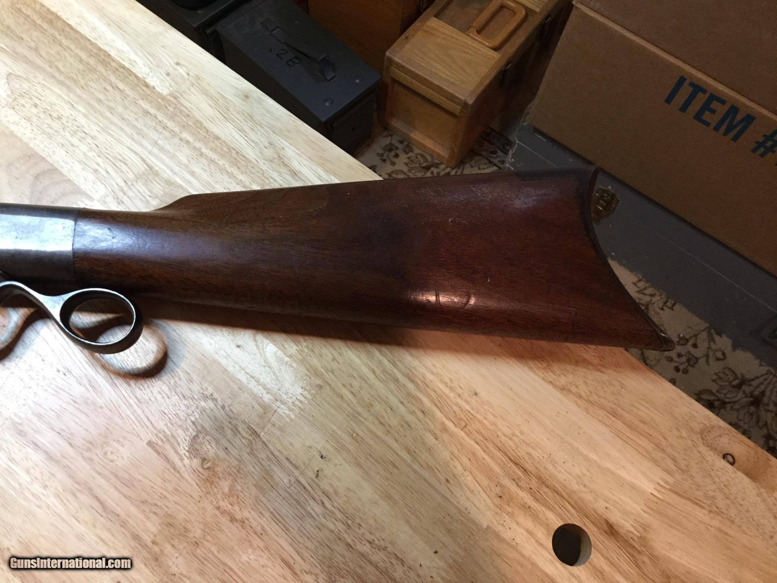 Description: A Ballard #5 in .45 Govt. 30 inch octagonal barrel. Measures 1.04 inches at the muzzle and 1.15 inches at the breech. The lever closes with a crisp "snap" and the triggers work as expected of a Marlin Ballard. They are great. The wood is good showing some signs of 130+ years of use. The forearm has been professionally strengthened with pins. The metal surely was blued at one time, but I can find no proof of that. The cleaning rod is a replacement as is the rear sight. Probably so with the front also, but both sights look good. The bore attests to its use in the black powder era. It's rough. Some years ago I tried it in an informal BPCR match. It wasn't competitive, however it showed good enough that it has taken two buffalo and a caribou during my ownership. REDUCED. SOLD SOLD Antique: Yes Rifle Caliber: .45-70 Government Manufacturer: Marlin Model: Pacific Barrel Length: 30 Condition: Good Metal Condition: Good Wood Condition: Good Bore Condition: Rough |