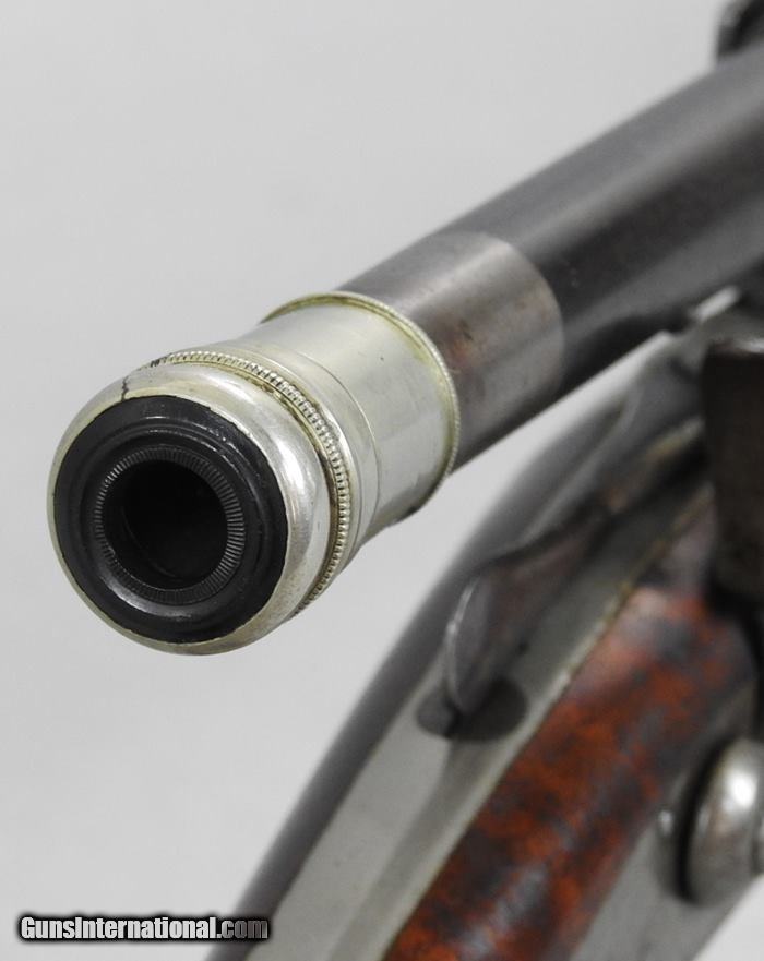 Description: Charles Slotterbek was a Lakeport, California gunmaker. He is listed in Larry Sheldon’s book on California Gunsmiths 1846-1900. This in a single shot breech loading 38-50 Ballard caliber rifle topped with a .695” telescopic site. The octagon barrel was .90” at the muzzle end and the breech was 1.085” wide. The barrel retains about 55% blue and the receiver retains 85% original nickel finish. The barrel has one of Slotterbek’s own design telescopic sights mounted on it. The wood is near excellent with sharp checkering on the fore end and the grip of the buttstock is very crisp as well. The butt has a crescent butt plate. This rifle has an adjustable set trigger. The bore is excellent bright and shiny and the mechanical function is very crisp and tight. The very similar rifle is on page 234 in Larry Sheldon’s Book. There are over 14 pages dedicated to Charles Slotterbek in this book. He was an exceptionally talented and quality gunmaker with a long gun making history. I would consider trades for pre 1899 ANTIQUE PISTOLS and rifles on any of my items.. WHAT DO YOU HAVE TO TRADE? Ask about our 30-90 day lay-away program. We accept Bank Check, Money order, Personal checks or wire transfer. SOLD Antique: Yes Manufacturer: Charles Slotterbek Model: Single Shot 38-50 Ballard Caliber |