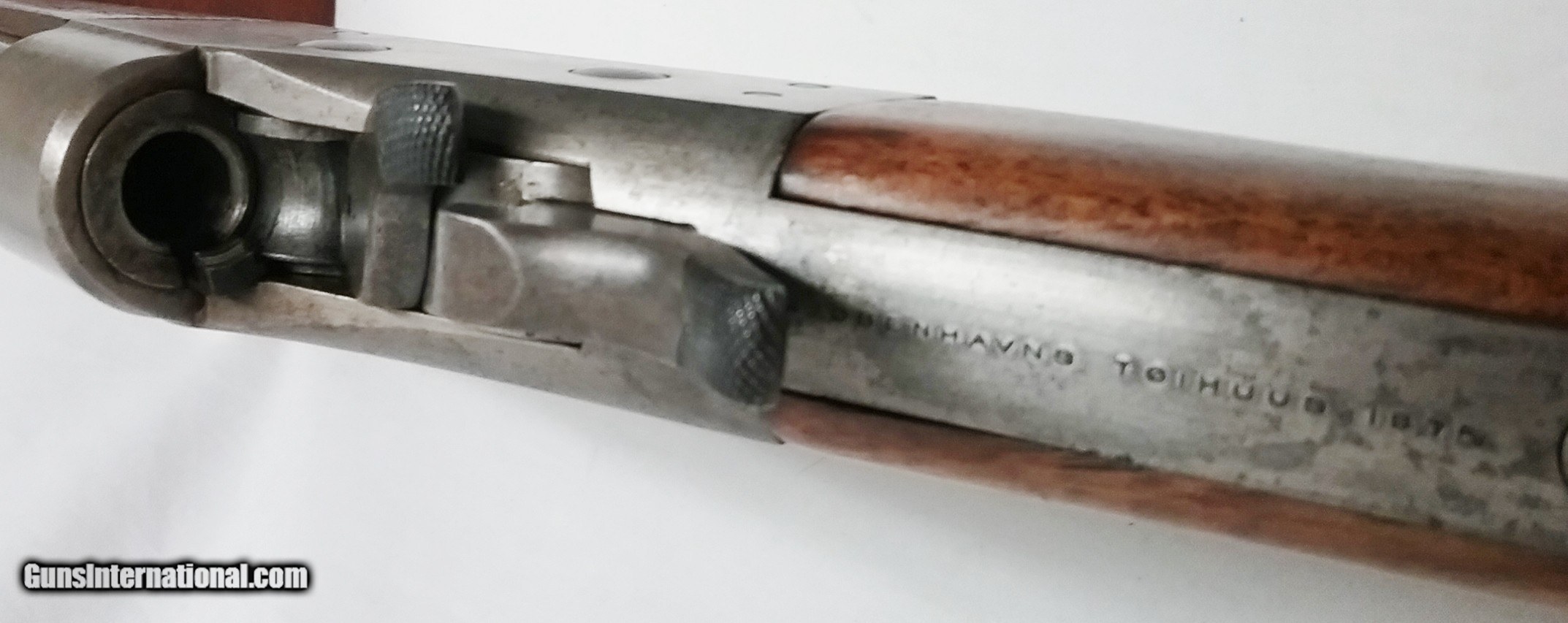 Description: C262 Danish Rolling Block –11.7 X51R - Stk #C262 This Danish Rolling Block rifle is chambered in 11.7 X 51R and features a 35-1/4” tapered round barrel that is in good condition with finish wear, minor sporadic pitting to the receiver, barrel, hammer, and block. The barrel is equipped with a bayonet lug. The barrel is mounted with a fixed front sight and a ladder style elevation adjustable rear sight. The bore is in very good condition with clean rifling. This rifle has a two piece European Walnut stock with a receiver stamped with M-1867. The stock is in good condition with the exception of some handling marks and a stain near the butt plate. The stock has 2 sling swivels, the cleaning rod and a metallic butt plate. Length of pull is 12-3/4”, overall length is 50”, and weight is 8.2 lbs. Our stock number is #C262. Will ship anywhere in the United States, buyer pays freight and insurance. SOLD Curio/Relic: Yes Antique: Yes Model: 1851 Bore: Rifled Chambers: 1 Ejectors: Yes Condition: Good Metal Condition: Good Wood Condition: Good Bore Condition: Very Good Barrels: One Barrel Type: Tapered Round Action: Rolling Block Triggers: One Stock: European Walnut Fore End: European Walnut Butt Pad: Metal LOP: 12-3/4 Weight: 8.2 lbs Sights: Adjustable Item Location: OR - Oregon |