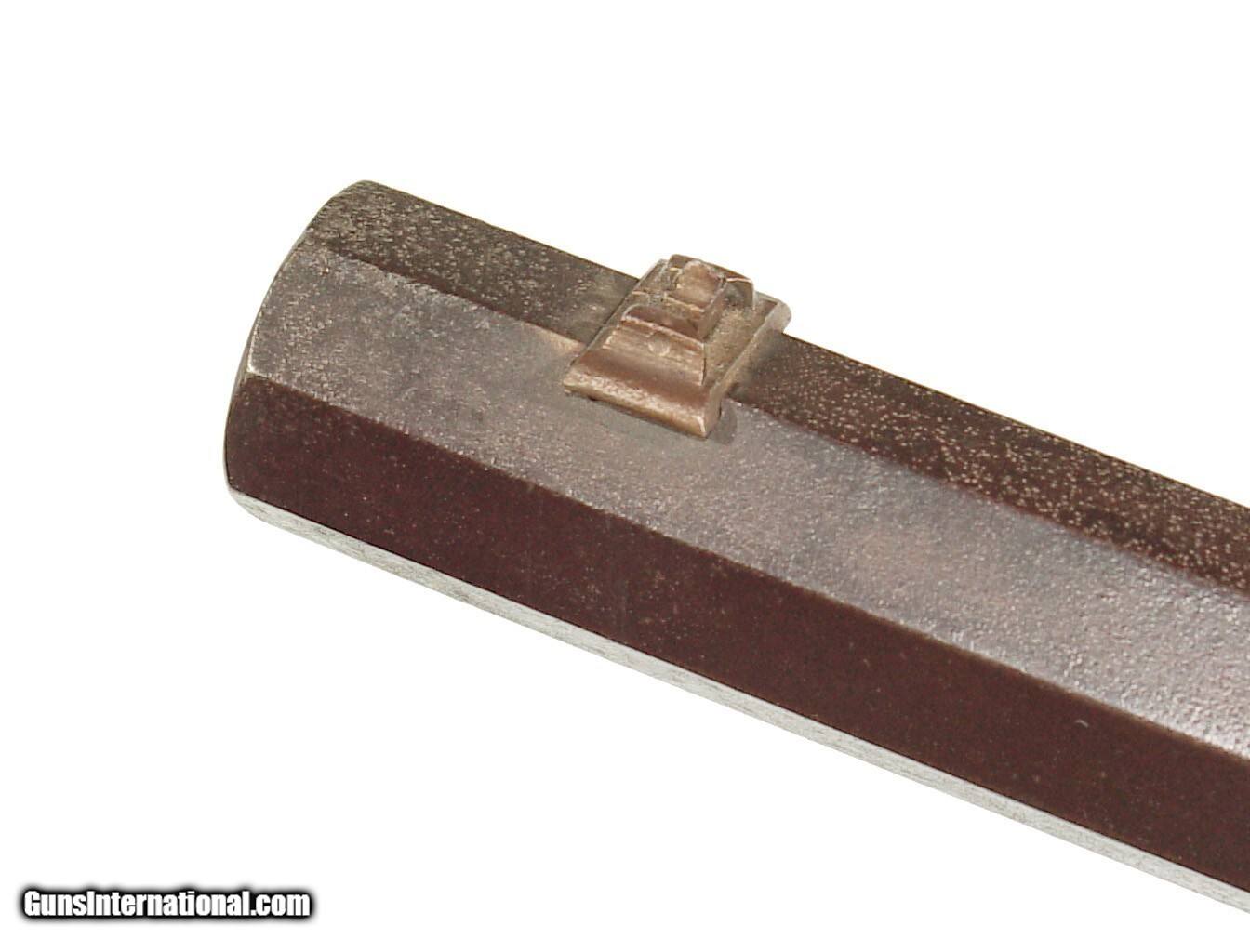 Description: .44-77 bottle neck ctg, 28" full octagon heavy barrel open front sight and folding ladder rear barrel sight. Casehardened rolling block action, plain uncheckered forend with casehardened steel forend cap. Straight buttstock ending with a steel buttplate. The barrel having blue mixing with plum brown patina and the early E. Remington legend is still easily read. The receiver, buttplate and forend cap a pleasing brown patina, remaining crisp with sharp edges. Very nice bright bore with sharp rifling. Weight 10 lbs 3 oz. SOLD Antique: Yes |