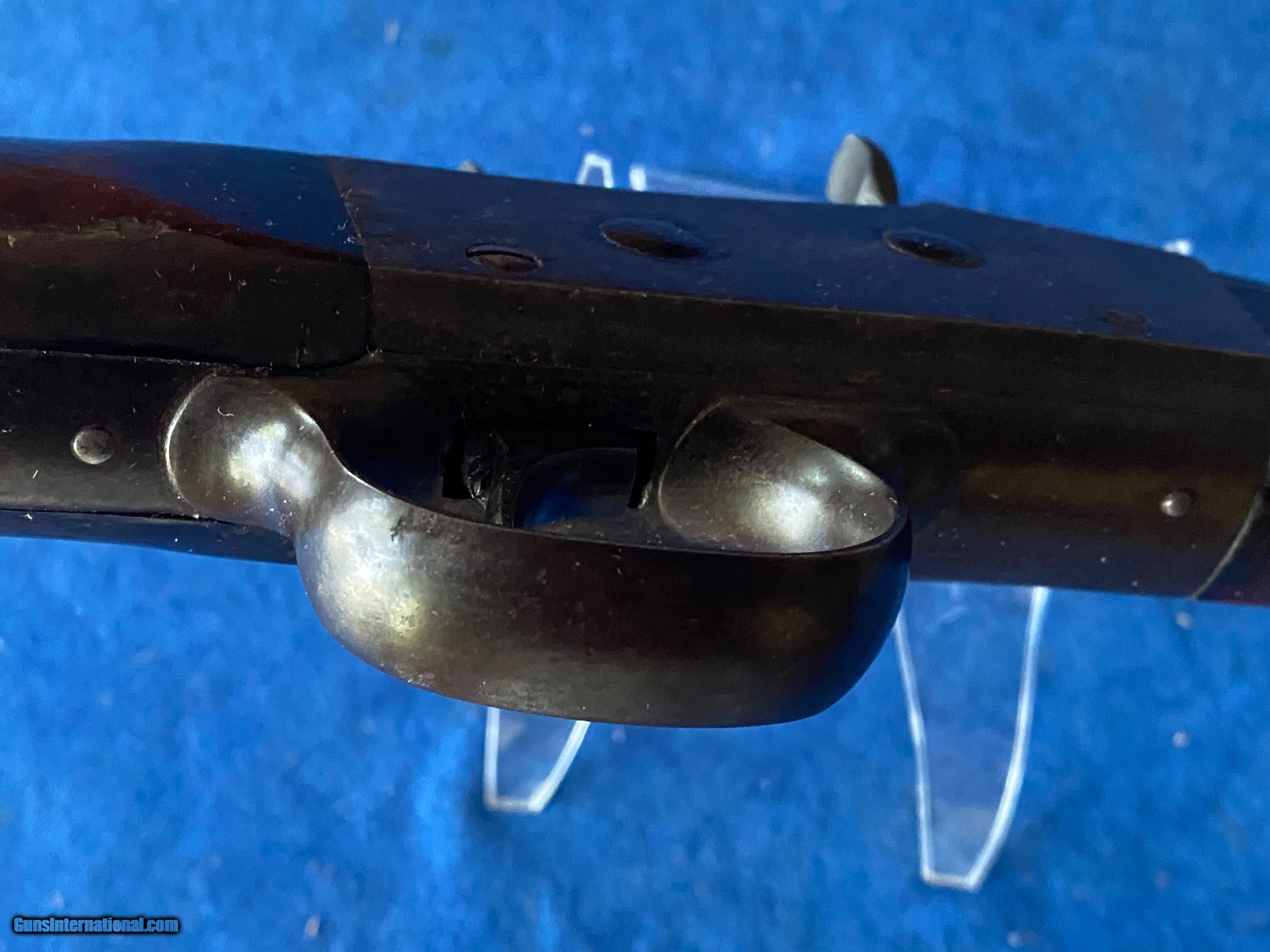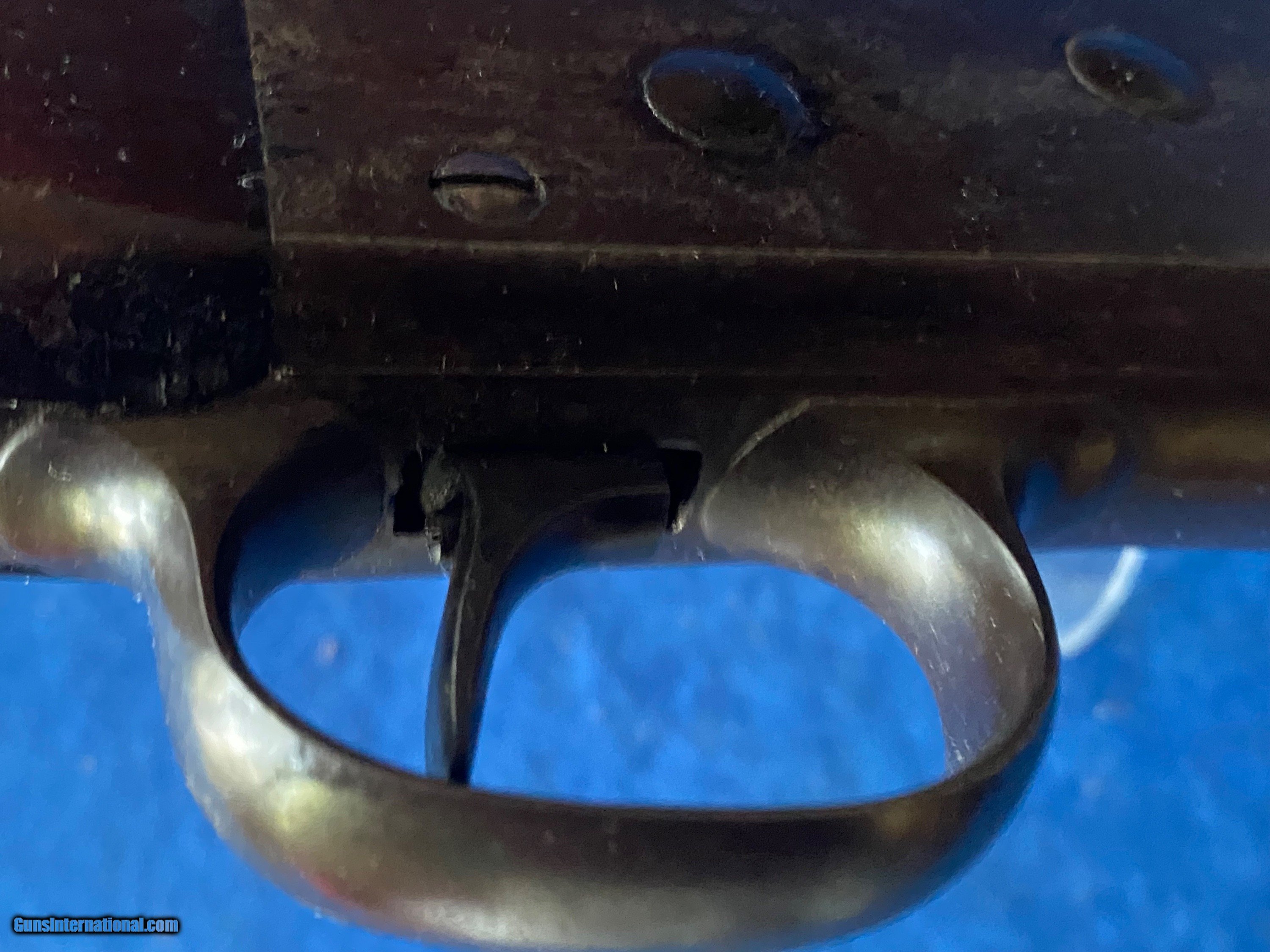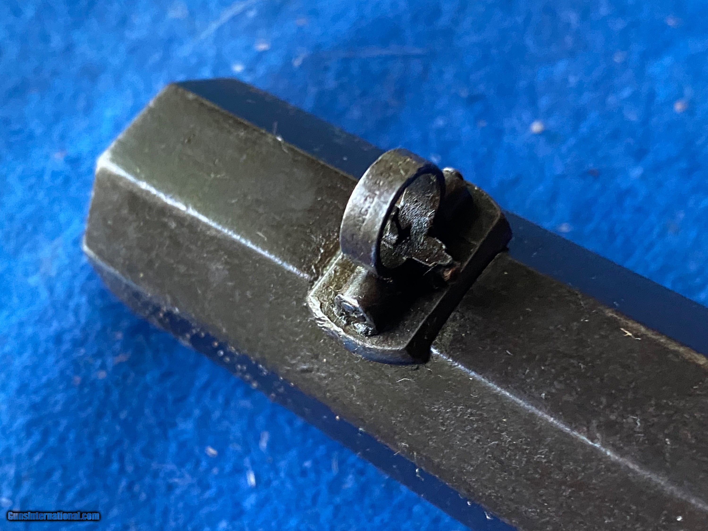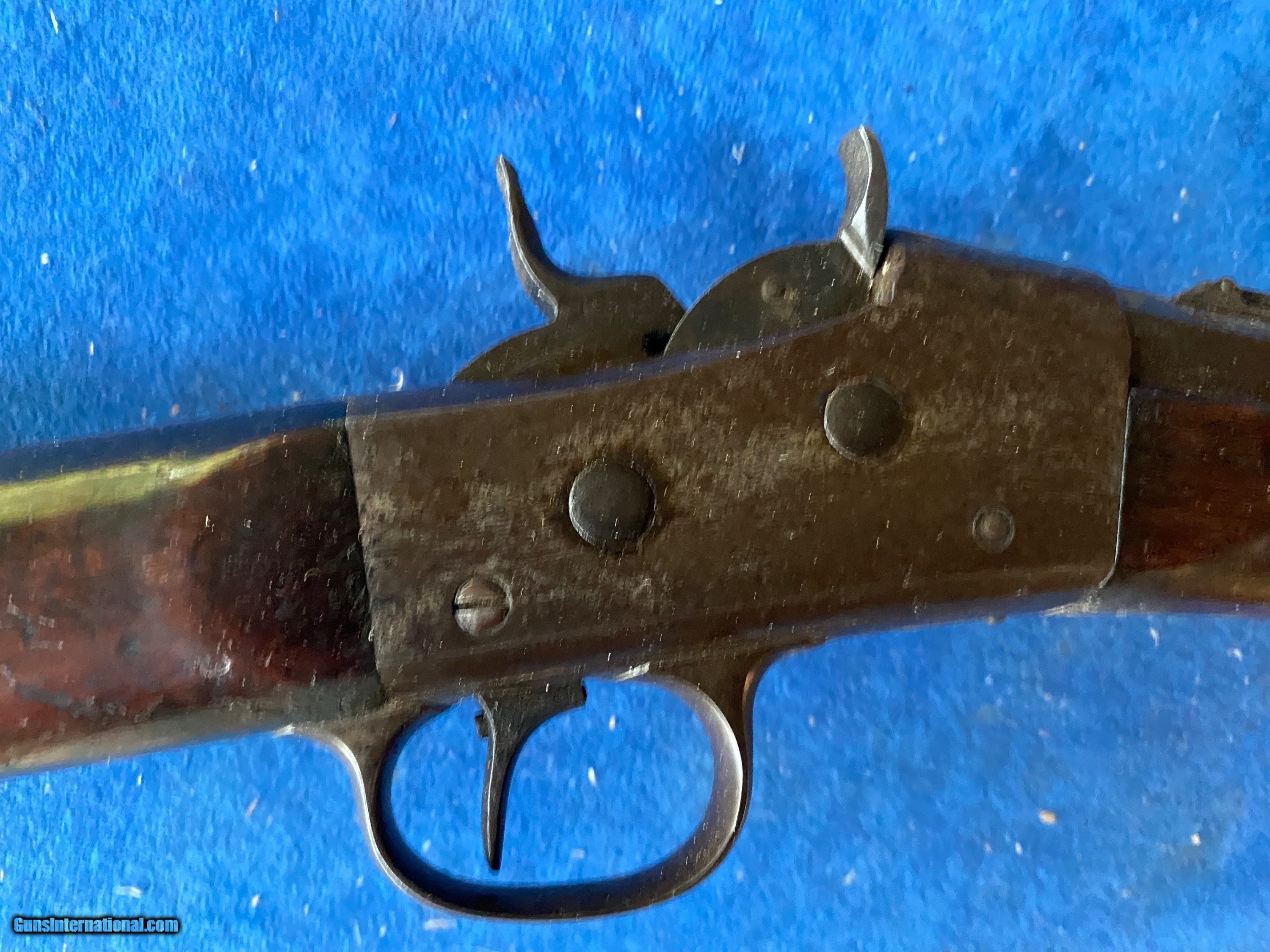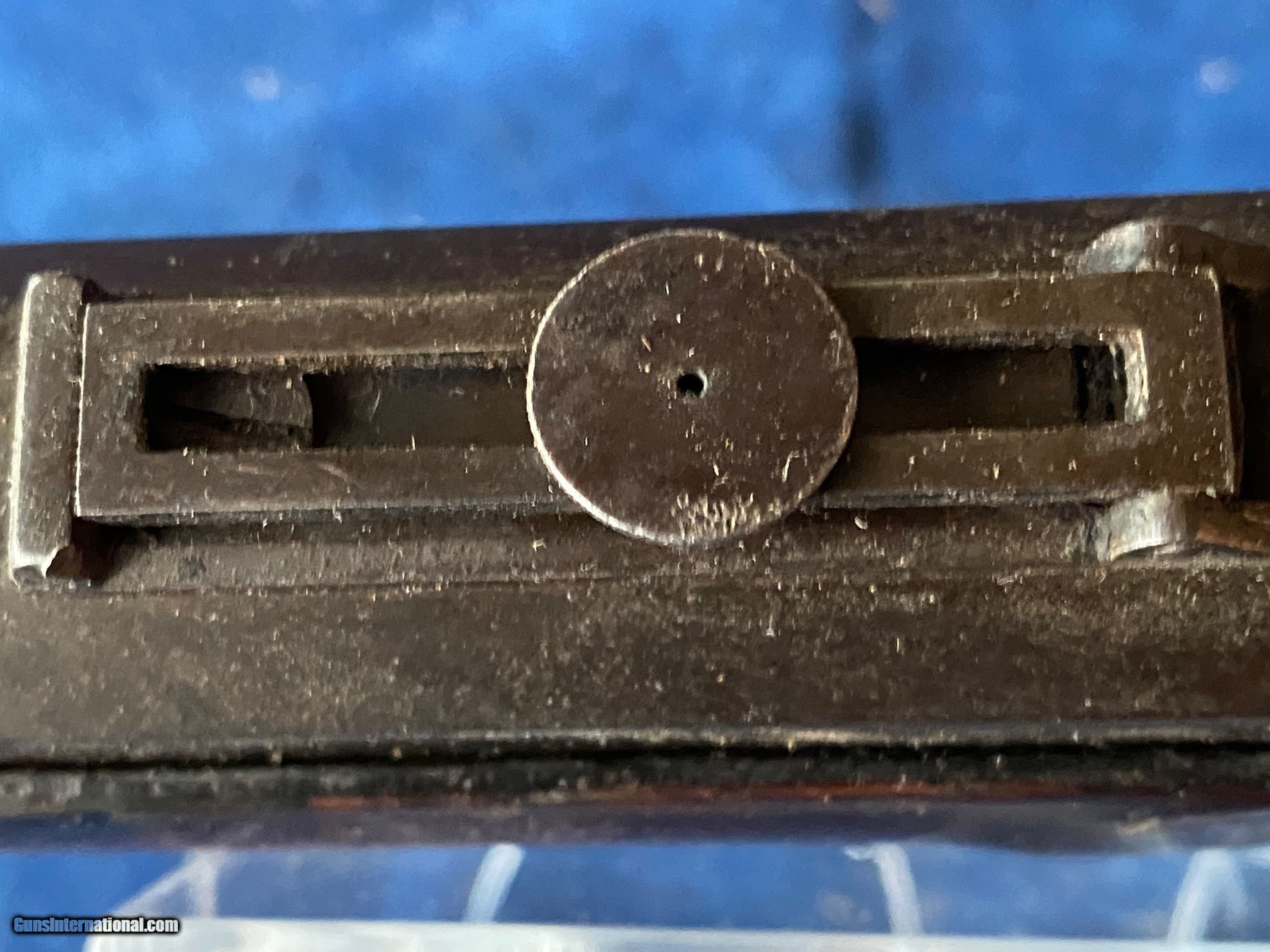 Description: EARLY Remington Rollingblock spoter with round top receiver.the front sight is a Beeches patent sight and the rear sight is the rare and desirable factory "ROUGH AND READY" adjustable ladder sight mounted behind a fixed mid barrel sight This fine old Remington has a twentyeight inch barrel with a fine bore and retains a large amount of original finish with patina.the early round top receiver is mostly bare metal with patina. The action is strong in both half and full cock with a working set trigger.The early style extractor sometimes sticks and probably needs some tlc I do not know the caliber ,the bottom of the barrel has a small 44 and the barrel indeed looks to be of that caliber.The stock and forearm are walnut and still have original finish and other than small dings and marks of one and a half centuries of use are in very good condition with no cracks or major defects.A well cared for veteran of the early frontier this gun in a rare configuration is a great collector piece as well as a shooter with proper black powder ammunition. Shipping and insurance is $85.00. This is a rare gun ,but I need to sell please feel free to call with any questions or offers,Thank you.Gil SOLD Antique: Yes |