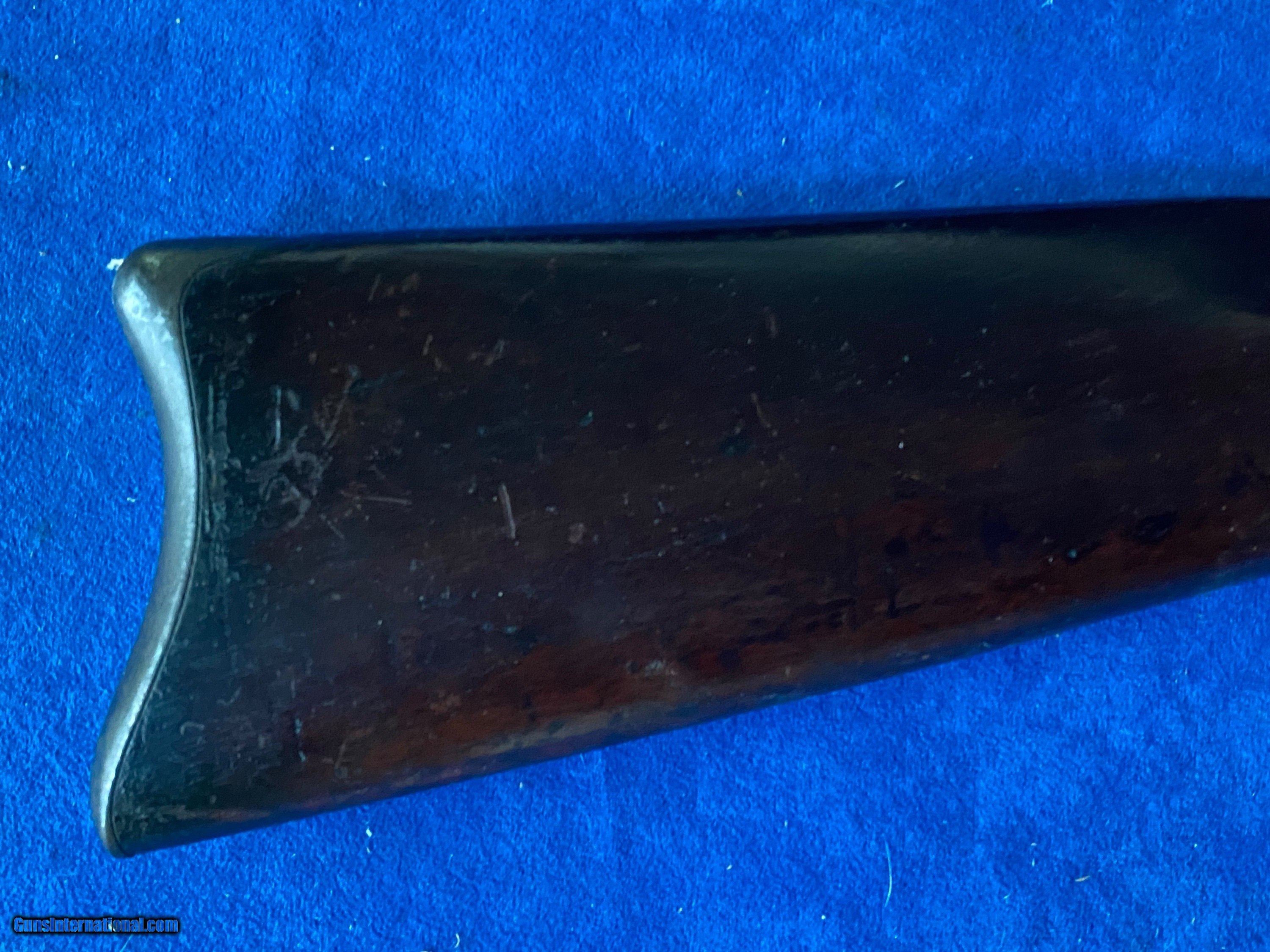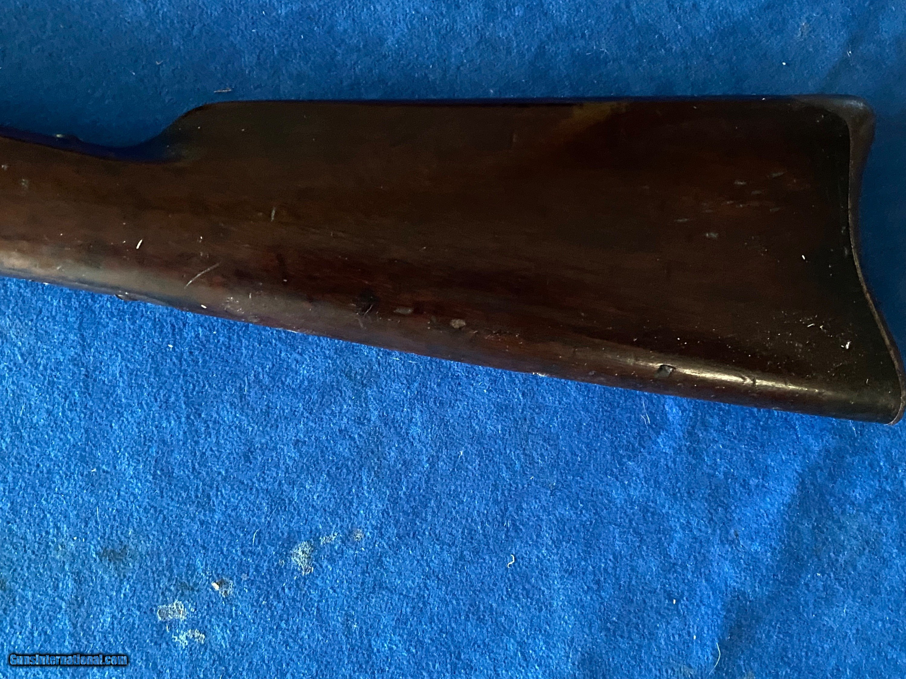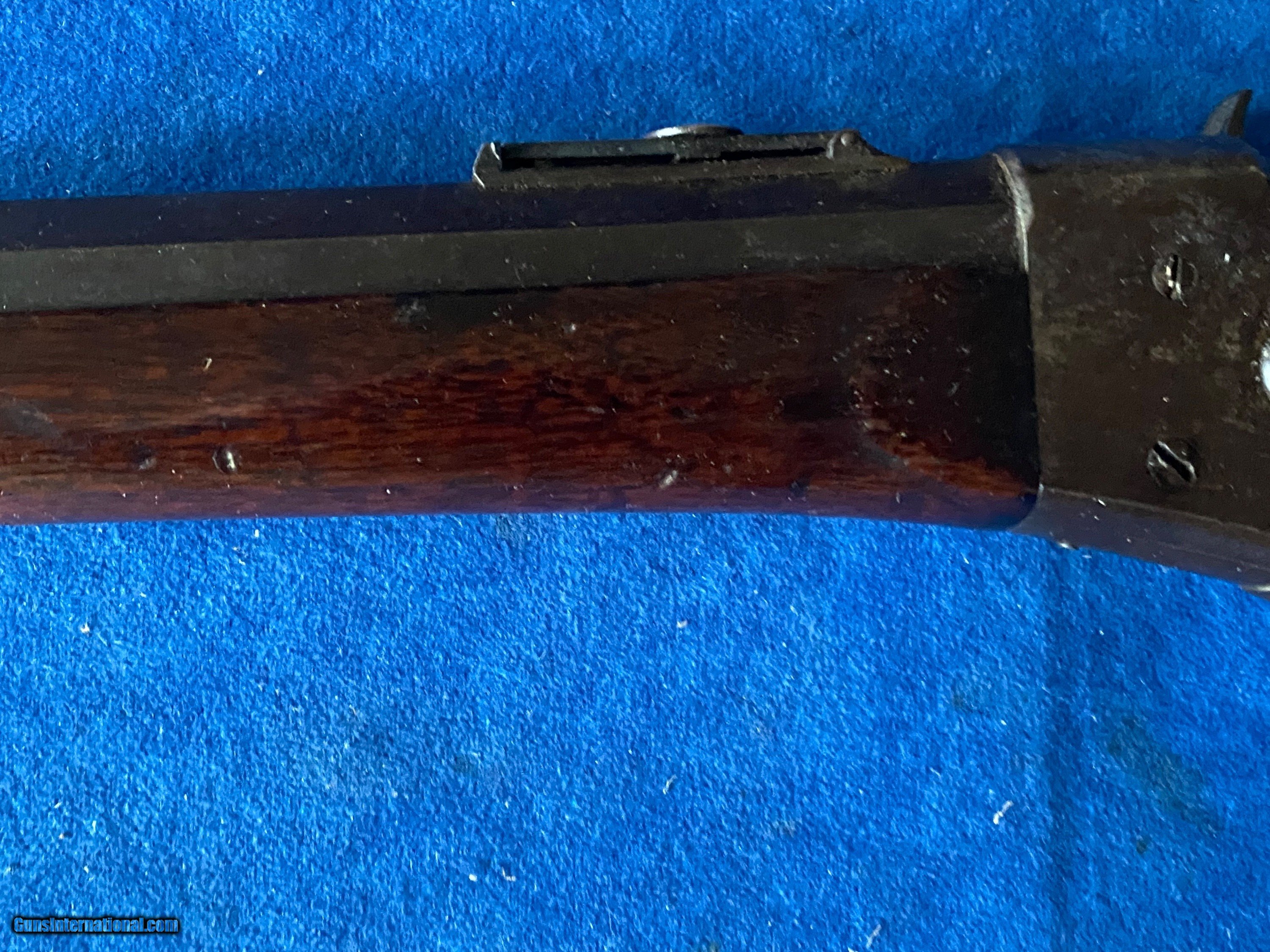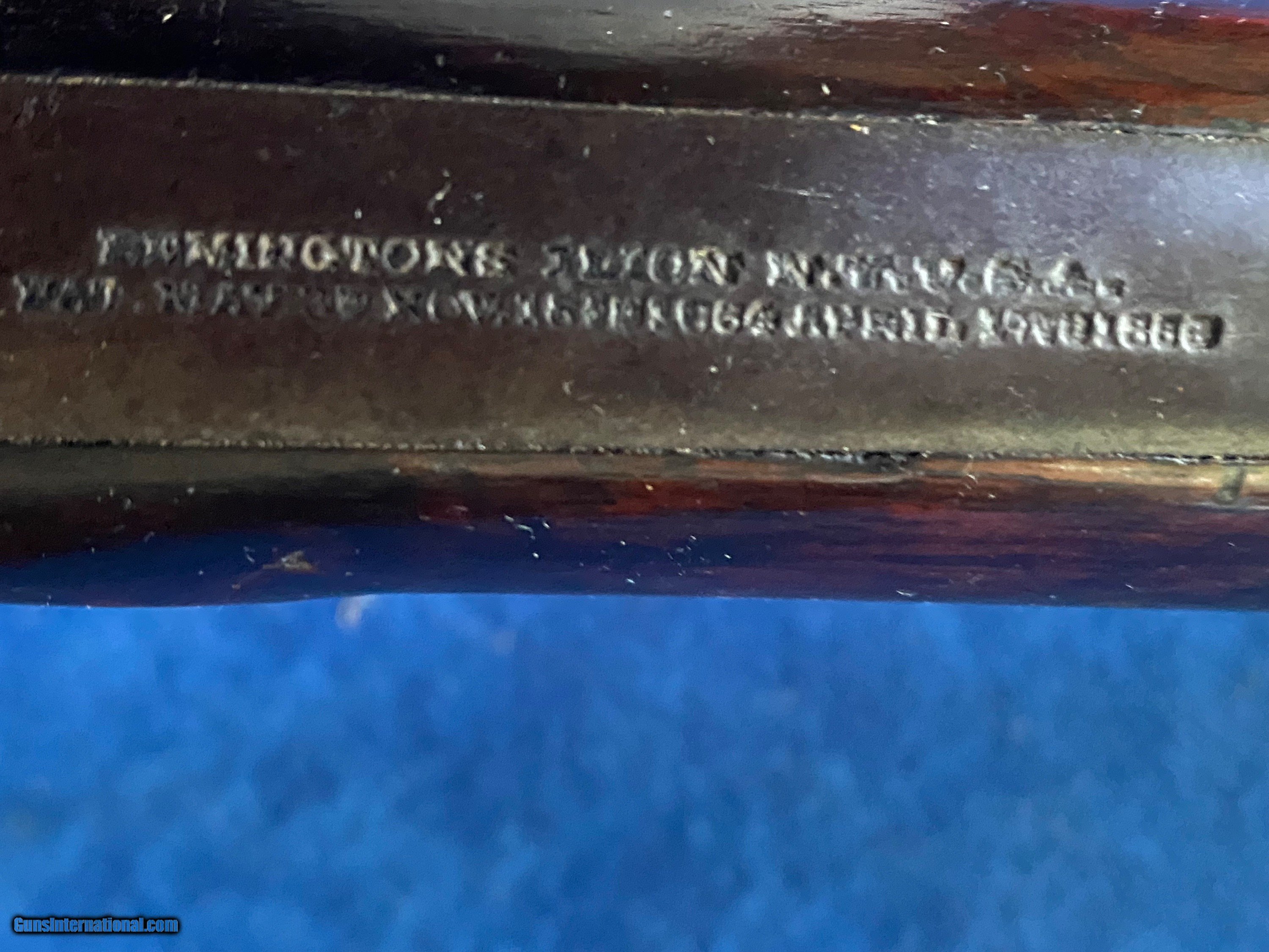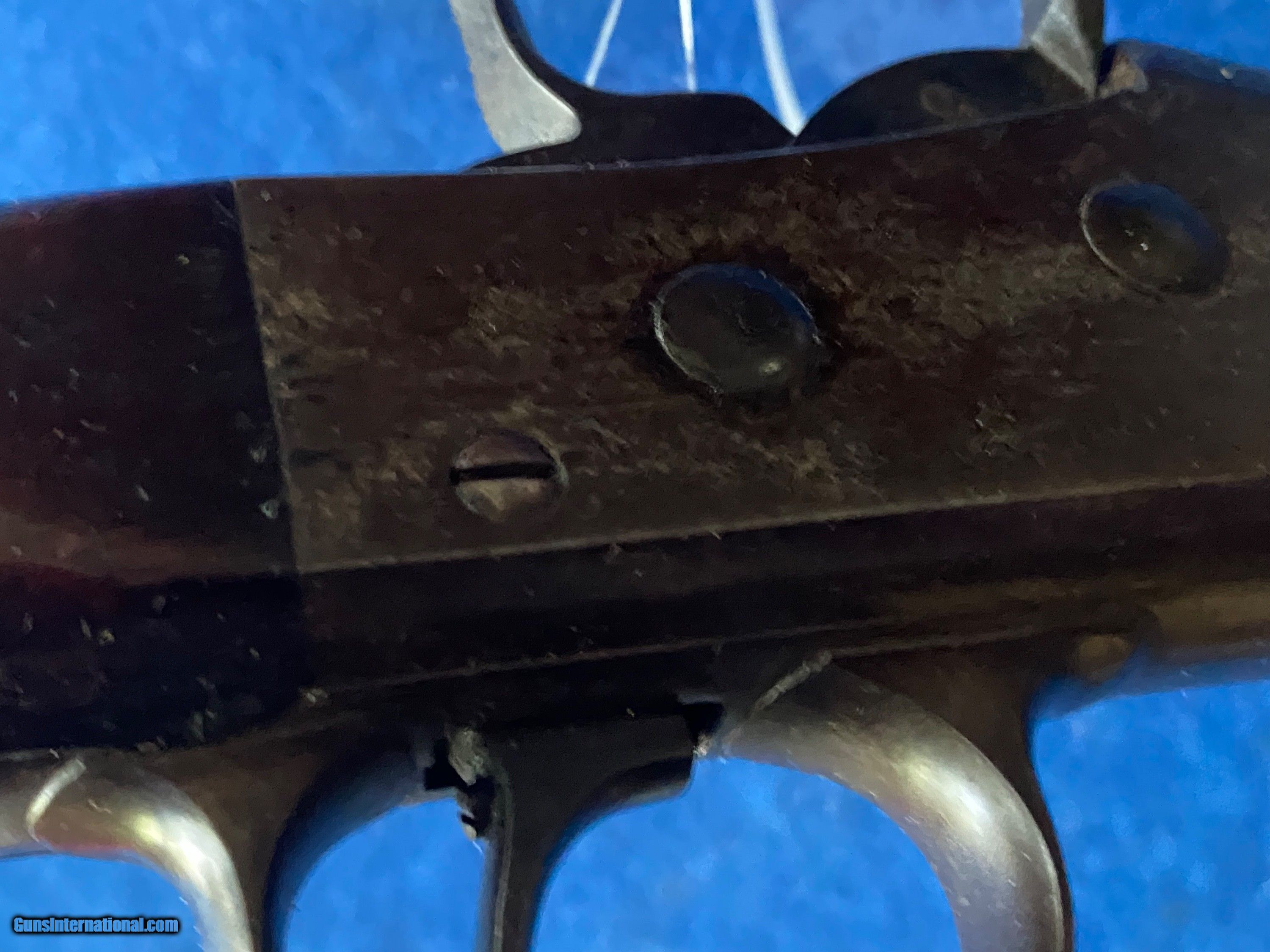 Description: EARLY Remington Rollingblock spoter with round top receiver.the front sight is a Beeches patent sight and the rear sight is the rare and desirable factory "ROUGH AND READY" adjustable ladder sight mounted behind a fixed mid barrel sight This fine old Remington has a twentyeight inch barrel with a fine bore and retains a large amount of original finish with patina.the early round top receiver is mostly bare metal with patina. The action is strong in both half and full cock with a working set trigger.The early style extractor sometimes sticks and probably needs some tlc I do not know the caliber ,the bottom of the barrel has a small 44 and the barrel indeed looks to be of that caliber.The stock and forearm are walnut and still have original finish and other than small dings and marks of one and a half centuries of use are in very good condition with no cracks or major defects.A well cared for veteran of the early frontier this gun in a rare configuration is a great collector piece as well as a shooter with proper black powder ammunition. Shipping and insurance is $85.00. This is a rare gun ,but I need to sell please feel free to call with any questions or offers,Thank you.Gil SOLD Antique: Yes |