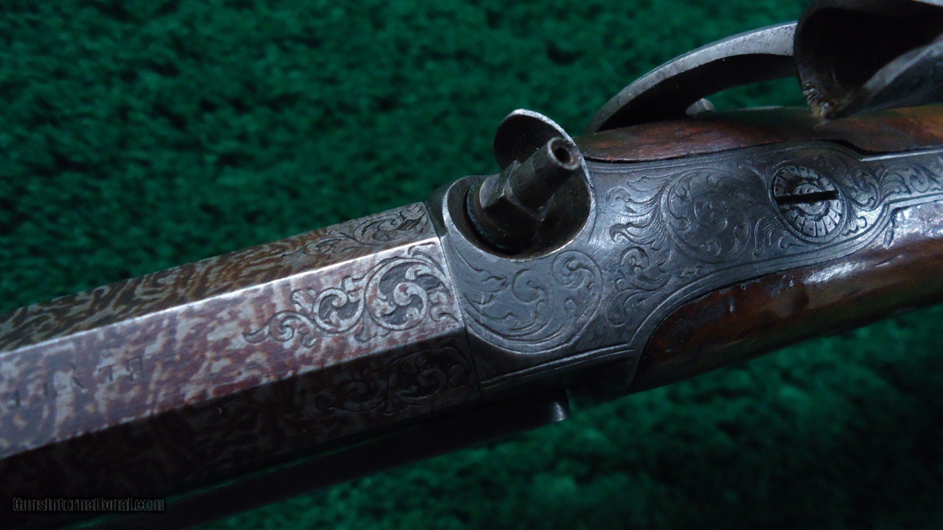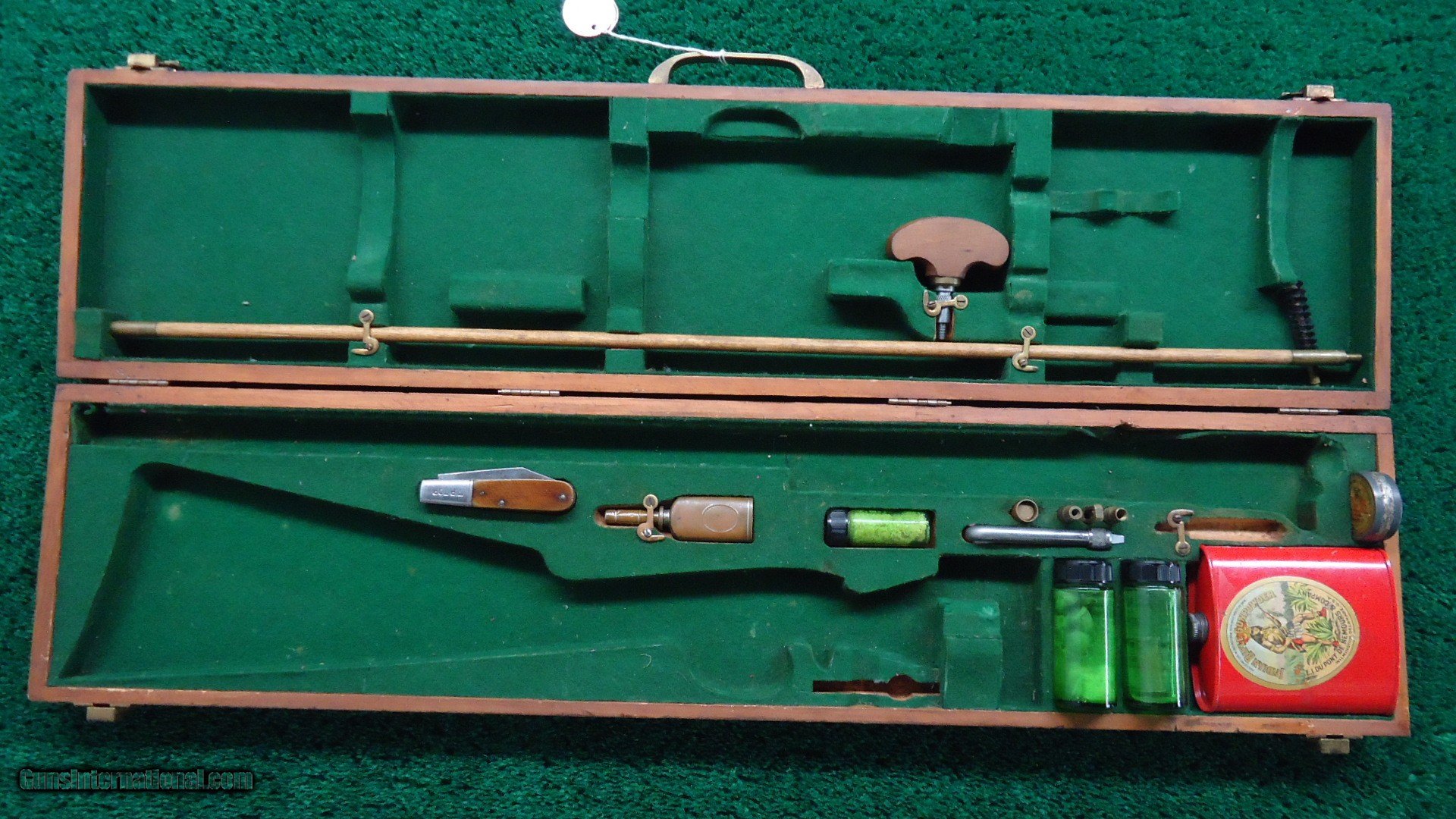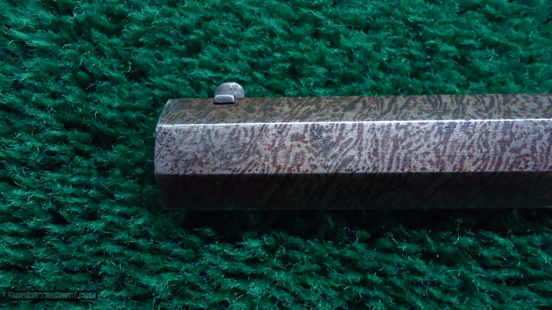Description: Percussion back action lock. Underneath the barrel is a lever that activates a mechanism that pushes the barrel forward. I haven't seen another like this. This gun is in beautiful condition with all the Damascus pattern on the barrel. It has a very small blade front sight and a 3-leaf rear sight. The engraved lock and hammer looks to have been left in the white. Steel buttplate. High grade wood with sharp checkering. Retains most all the original varnish. Nice functioning action. Gun comes complete with a case that has all the necessities to go out and shoot. Leroy Merz Antique Firearms specializes in antique and vintage Winchesters and other fine American firearms. Since 1965 Mr. Merz has taken part in the world of firearms and has been a contributor to many well known reference books. We have hundreds of additional guns in every price range at our home online. Search for Merz Antiques in google. SOLD Antique: Yes |