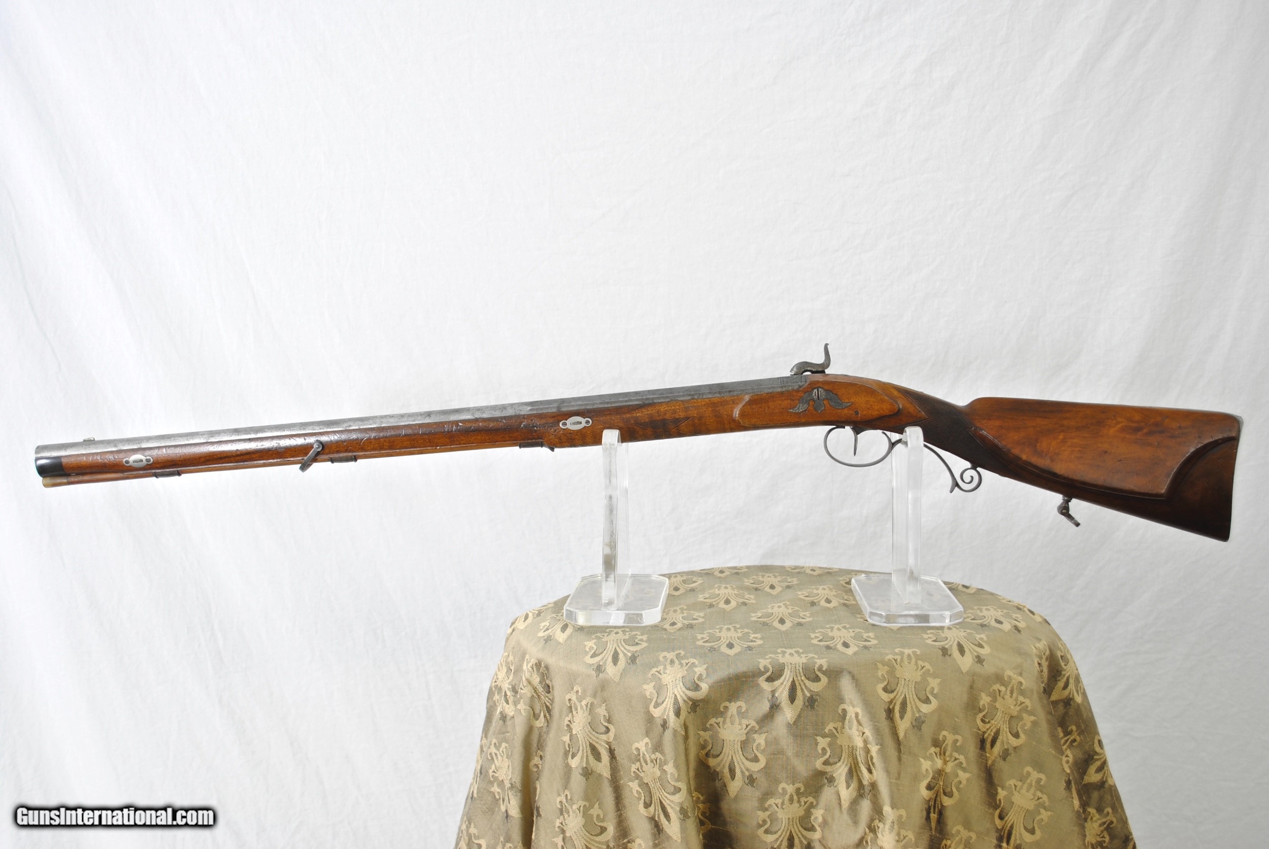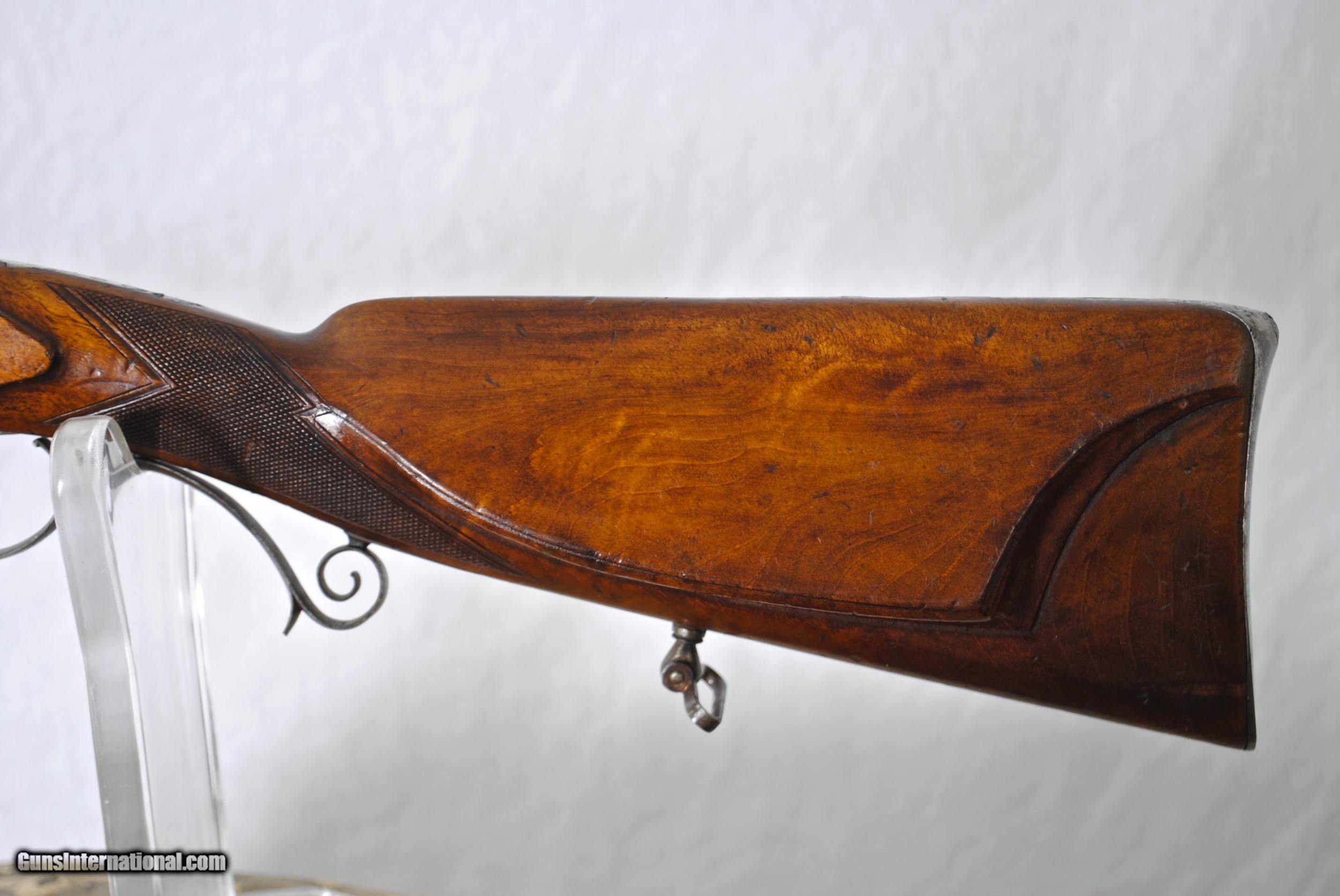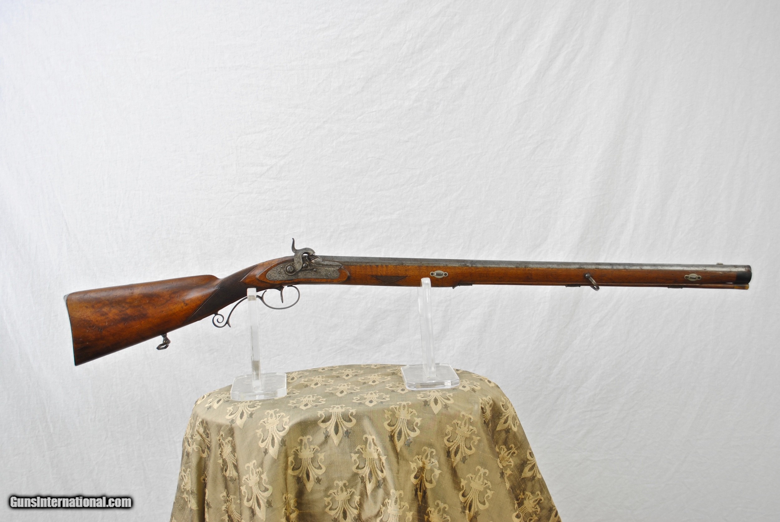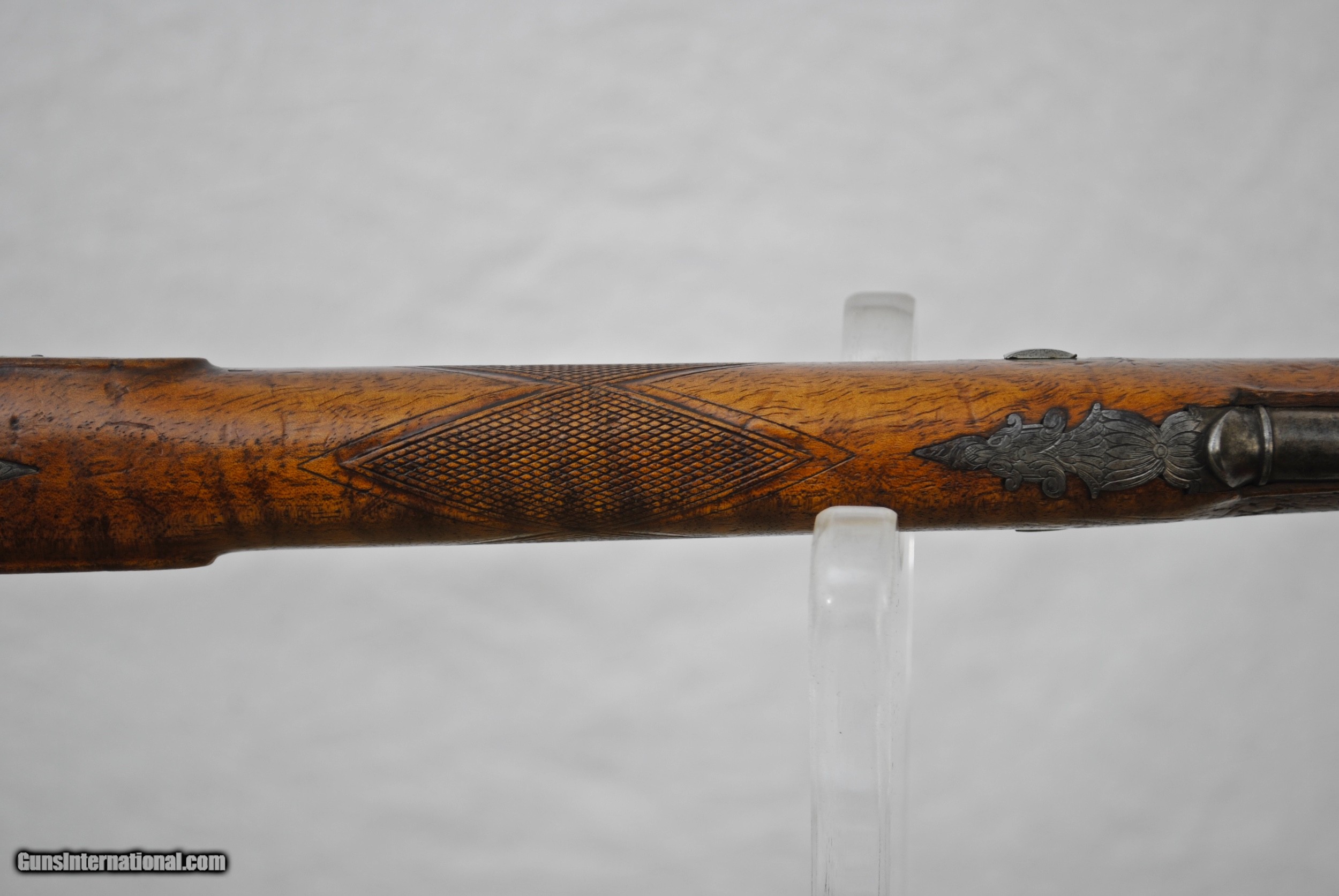 Description: Here is an German Antique Boys Ball Rifle most likely from the 1830 - 1850 time period. This single shot diminutive gun weighs a mere 3 LBS 2 OZ and has a 38" overall length. Barrel is 24 1/2" and measures about 54/1000. Lock functions perfectly and has a stalking safety at half cock. Full stock with a Bavarian cheek piece. LOP is 11 3/4". The maker Muller was located in Zella Mehlis Gun Making Region of Germany. Original condition throughout. Royal Crest located on top tang. The use of Royal Crests were highly regulated during this time period and you could not just add one by law. Most likely this gun was part of a Royal Armory on a hunting estate and was used by a young prince. As an antique this gun can be shipped directly unless local law prohibits (No NJ or NYC). Shipping is $75 and the gun will be shipped in a hard case for extra protection. SOLD Antique: Yes |