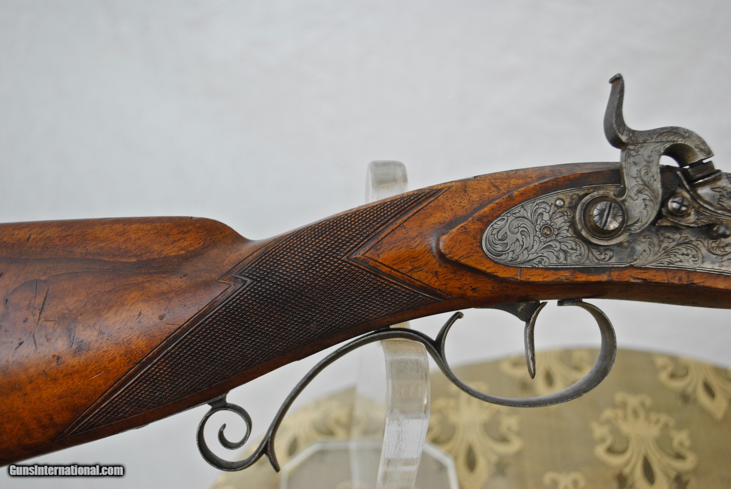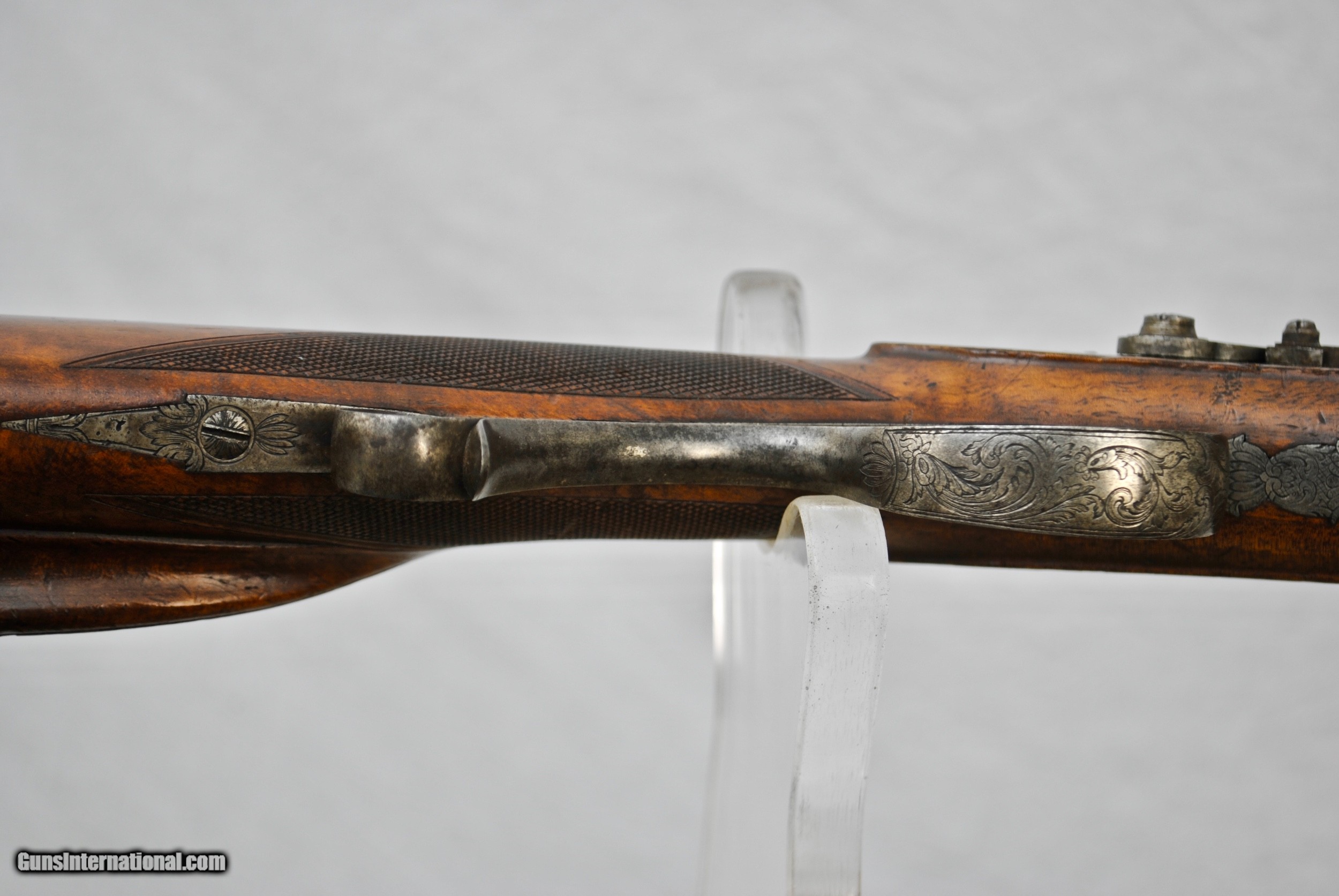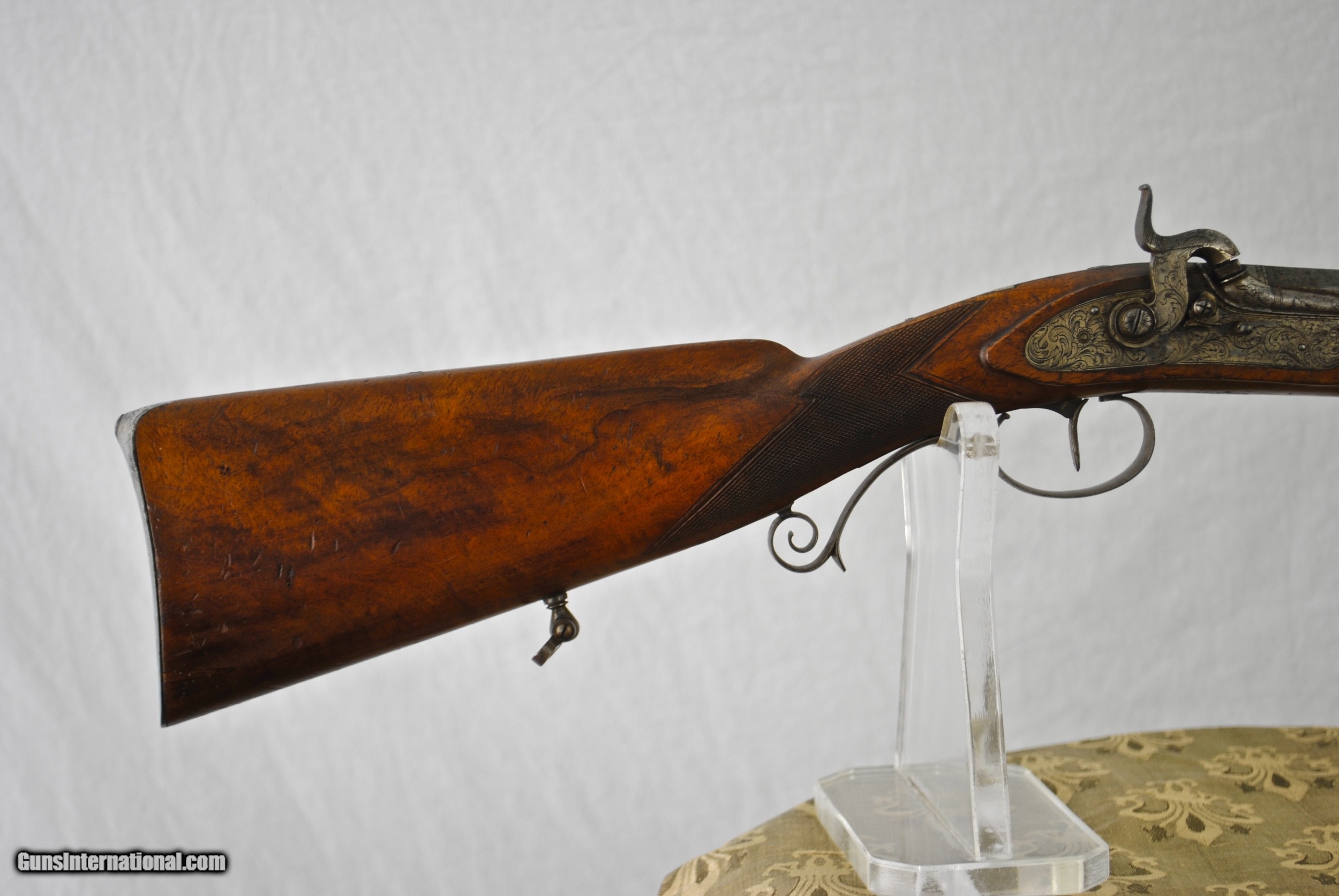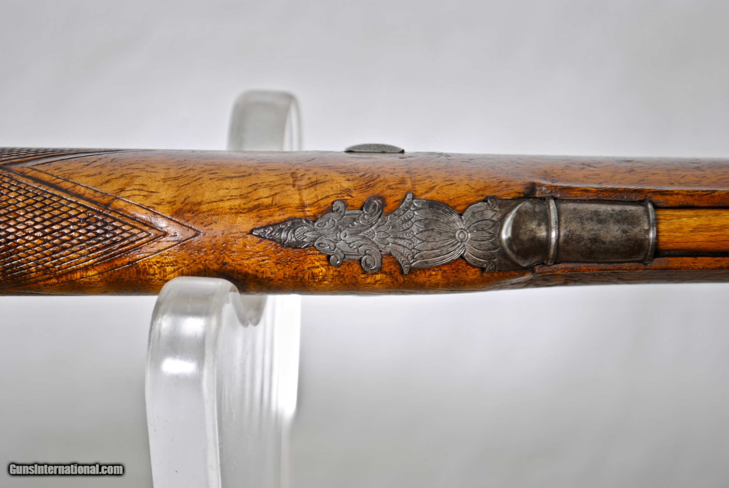 Description: Here is an German Antique Boys Ball Rifle most likely from the 1830 - 1850 time period. This single shot diminutive gun weighs a mere 3 LBS 2 OZ and has a 38" overall length. Barrel is 24 1/2" and measures about 54/1000. Lock functions perfectly and has a stalking safety at half cock. Full stock with a Bavarian cheek piece. LOP is 11 3/4". The maker Muller was located in Zella Mehlis Gun Making Region of Germany. Original condition throughout. Royal Crest located on top tang. The use of Royal Crests were highly regulated during this time period and you could not just add one by law. Most likely this gun was part of a Royal Armory on a hunting estate and was used by a young prince. As an antique this gun can be shipped directly unless local law prohibits (No NJ or NYC). Shipping is $75 and the gun will be shipped in a hard case for extra protection. SOLD Antique: Yes |