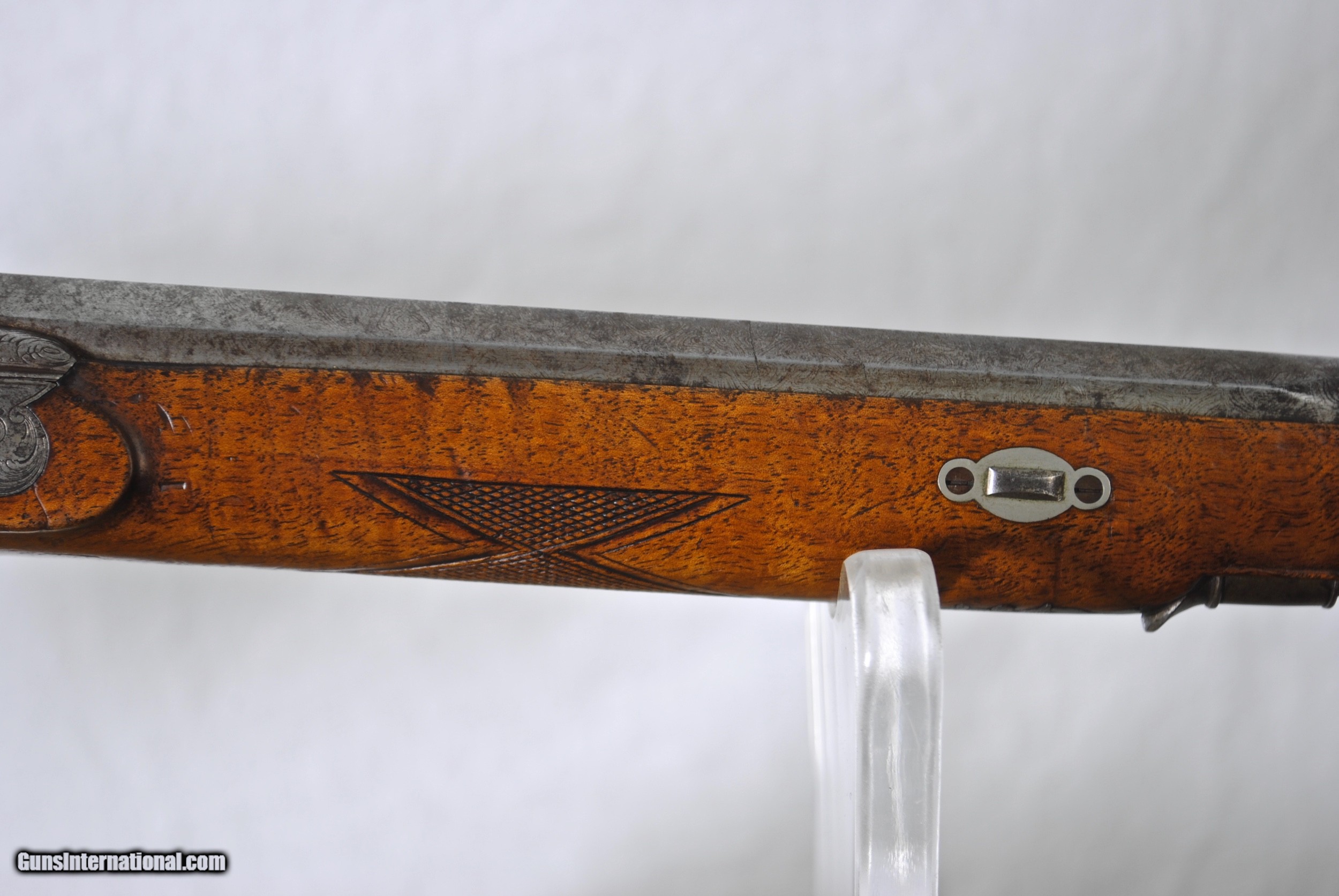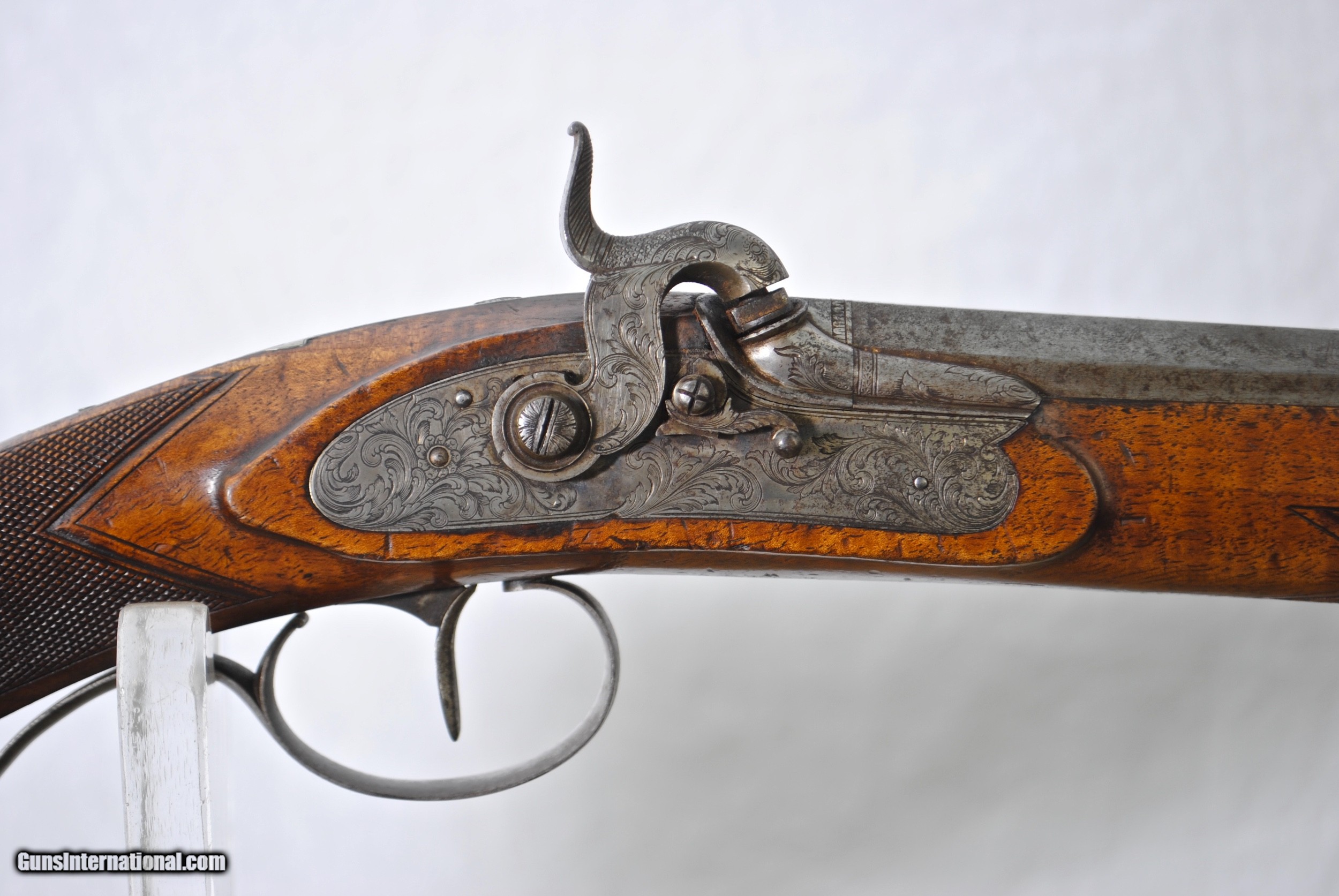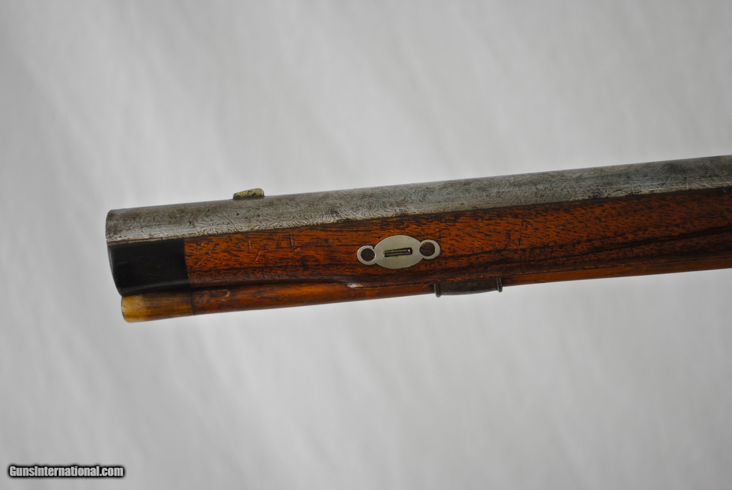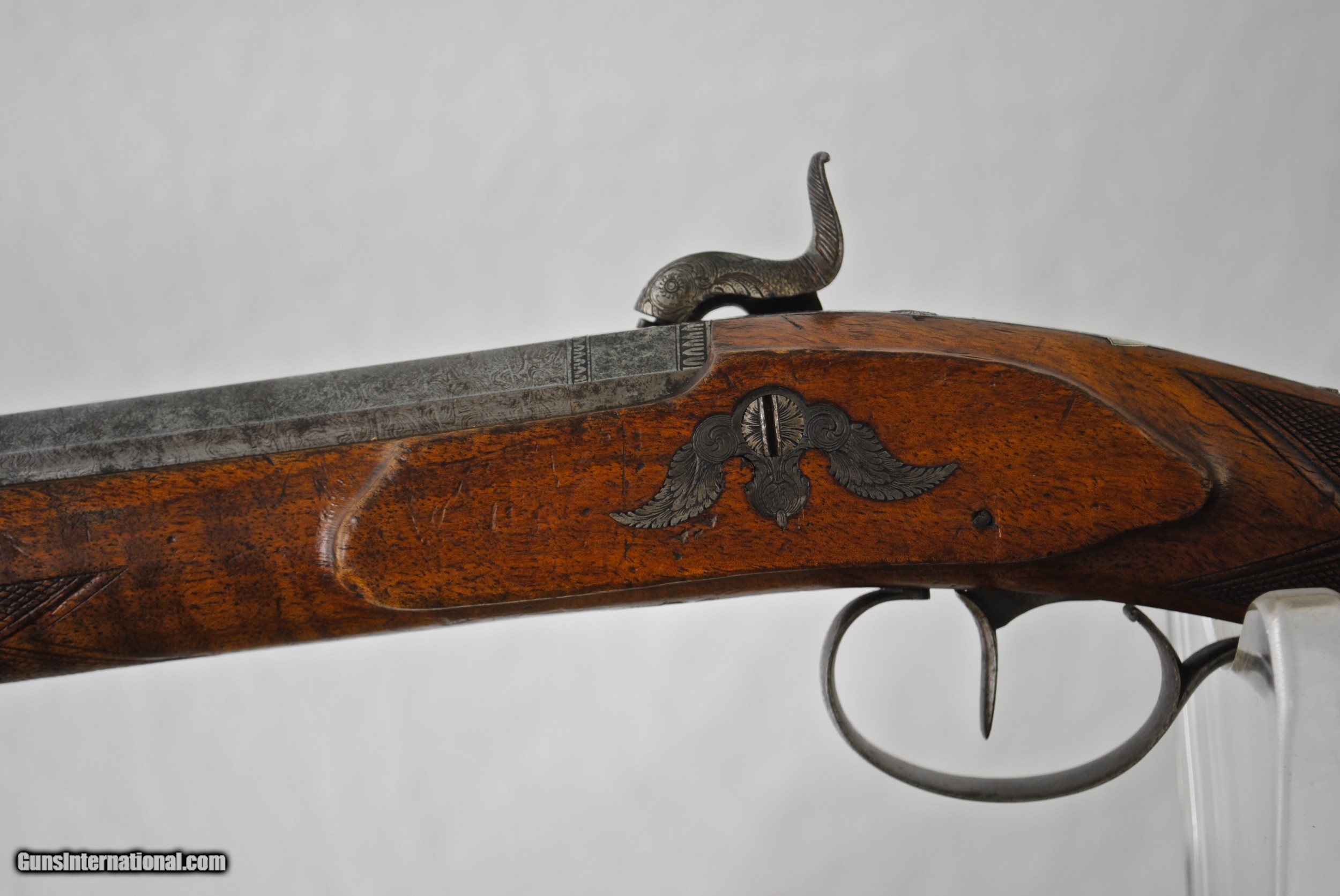 Description: Here is an German Antique Boys Ball Rifle most likely from the 1830 - 1850 time period. This single shot diminutive gun weighs a mere 3 LBS 2 OZ and has a 38" overall length. Barrel is 24 1/2" and measures about 54/1000. Lock functions perfectly and has a stalking safety at half cock. Full stock with a Bavarian cheek piece. LOP is 11 3/4". The maker Muller was located in Zella Mehlis Gun Making Region of Germany. Original condition throughout. Royal Crest located on top tang. The use of Royal Crests were highly regulated during this time period and you could not just add one by law. Most likely this gun was part of a Royal Armory on a hunting estate and was used by a young prince. As an antique this gun can be shipped directly unless local law prohibits (No NJ or NYC). Shipping is $75 and the gun will be shipped in a hard case for extra protection. SOLD Antique: Yes |