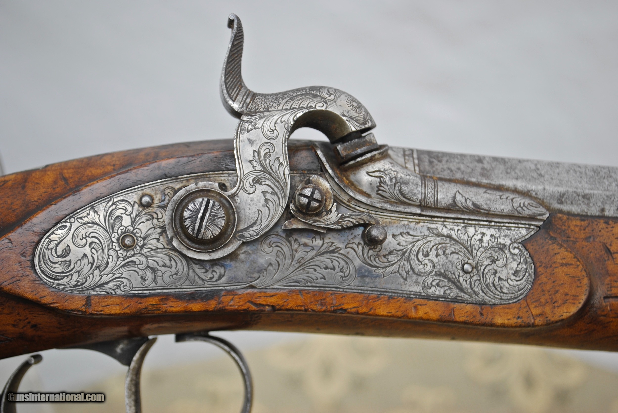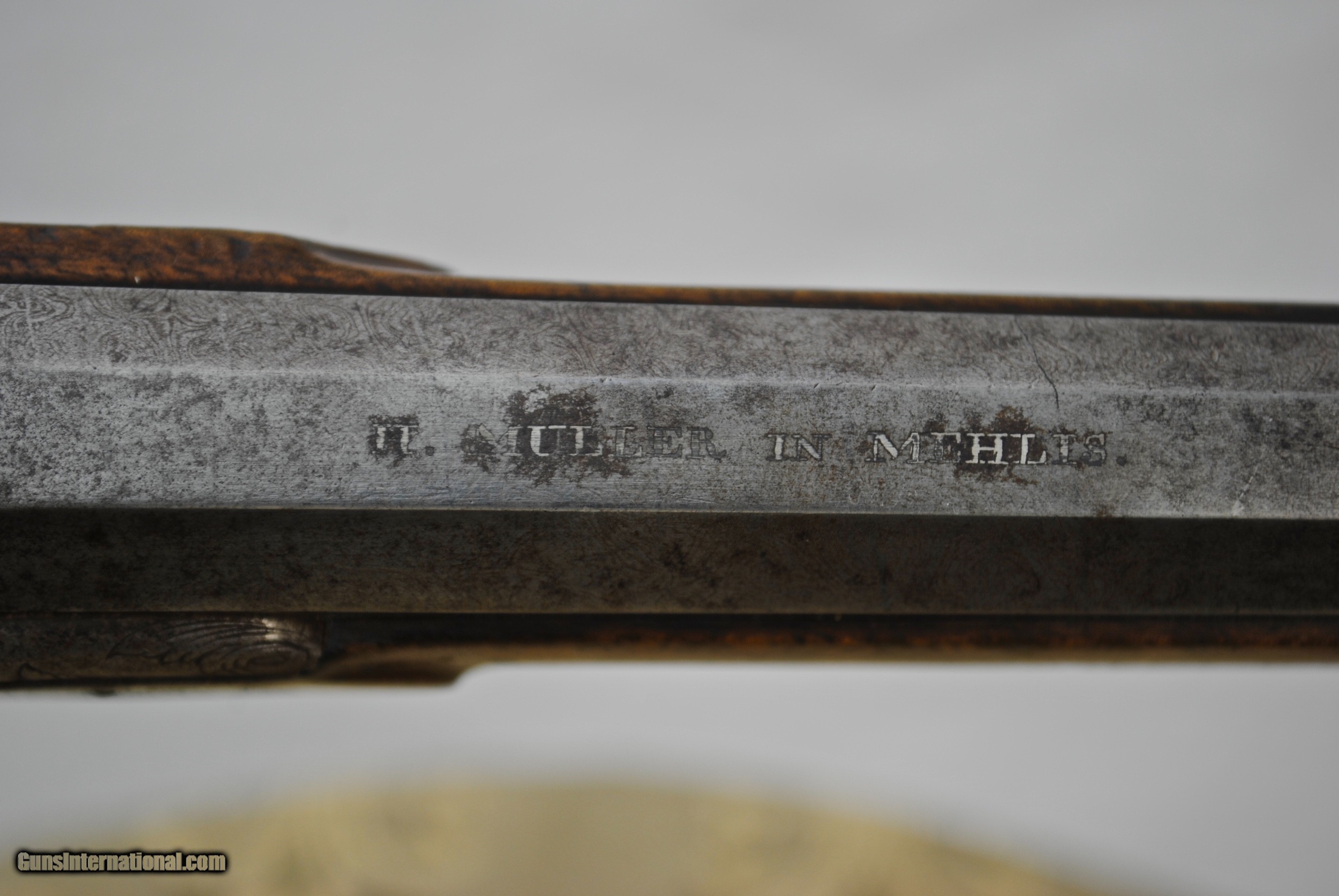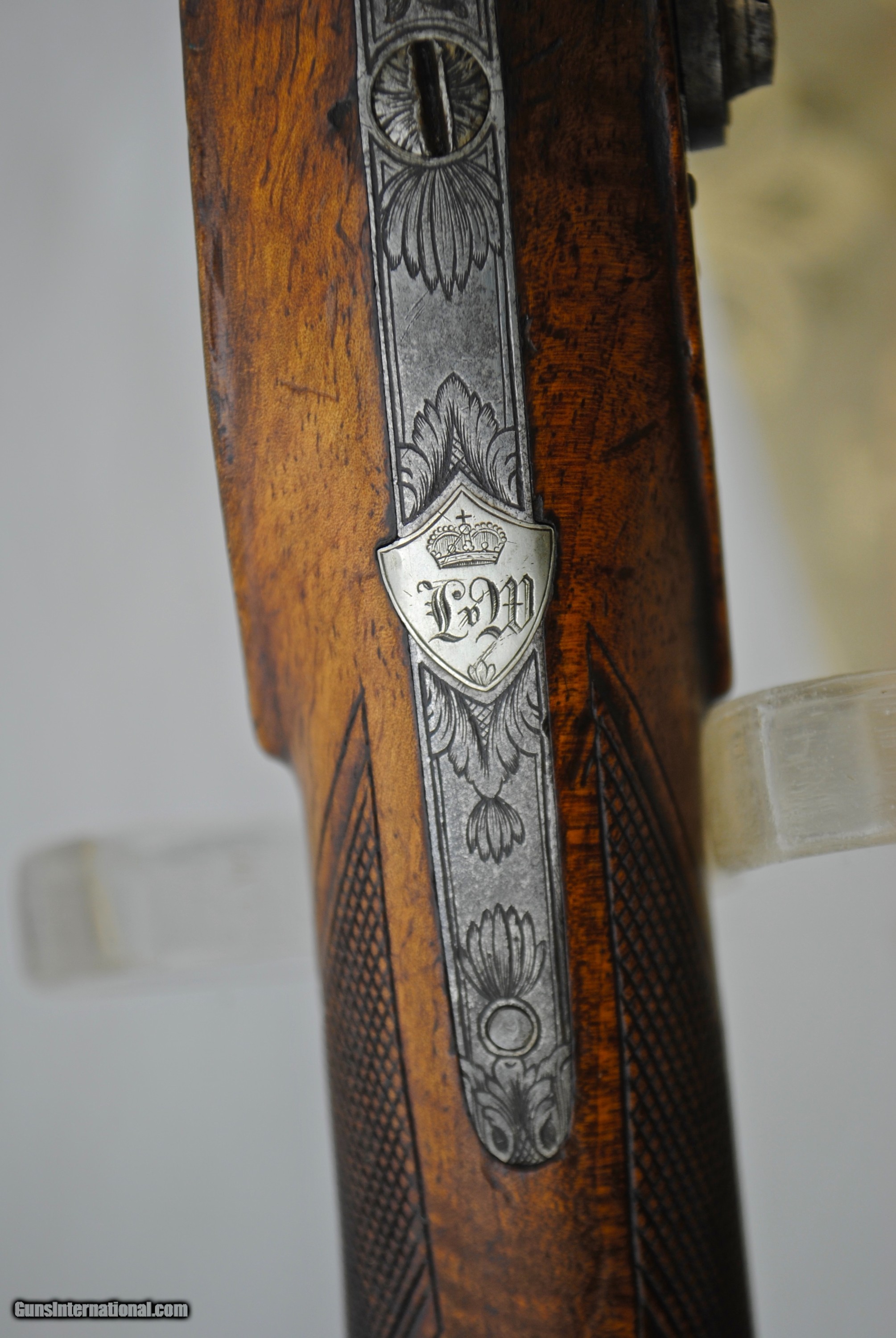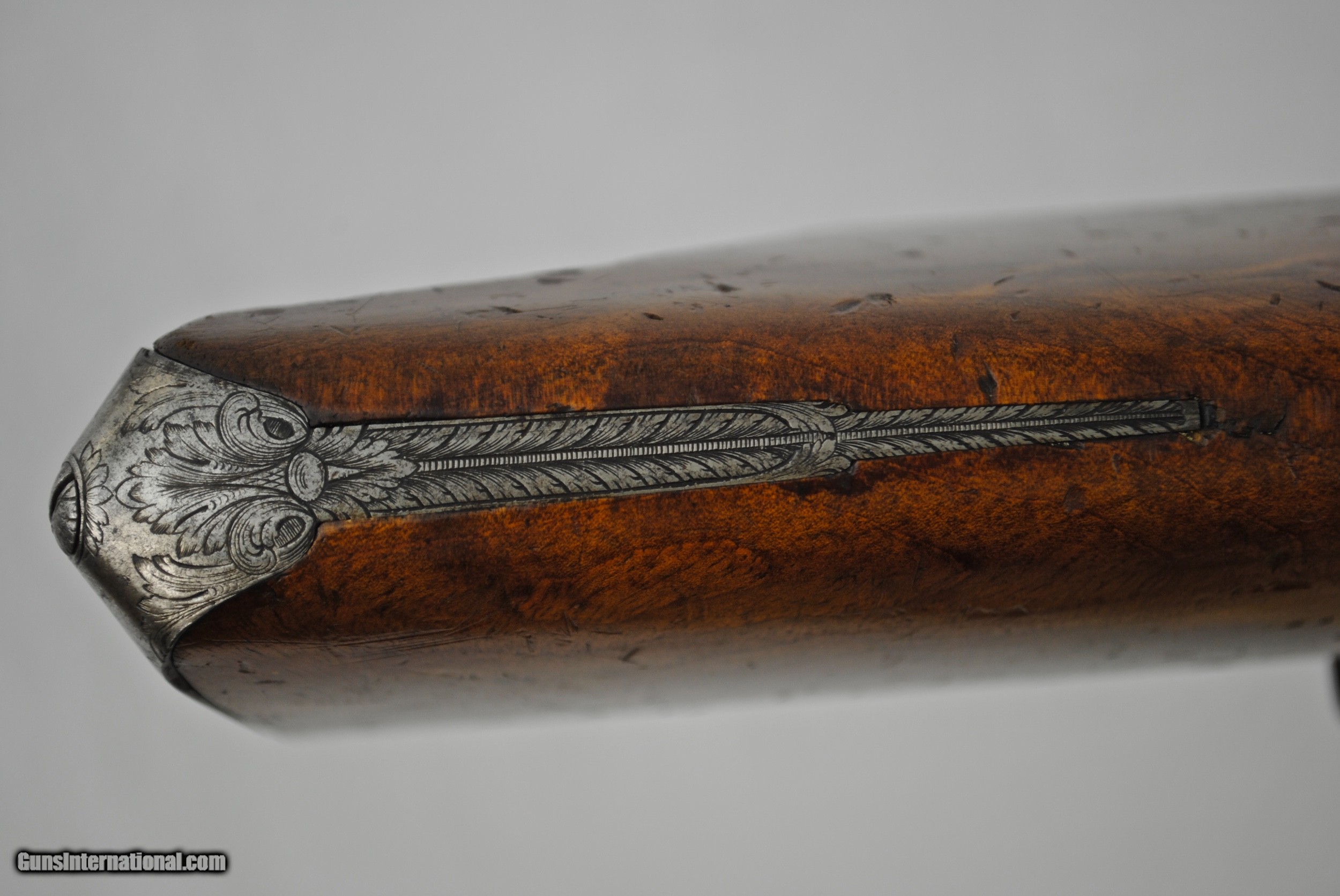 Description: Here is an German Antique Boys Ball Rifle most likely from the 1830 - 1850 time period. This single shot diminutive gun weighs a mere 3 LBS 2 OZ and has a 38" overall length. Barrel is 24 1/2" and measures about 54/1000. Lock functions perfectly and has a stalking safety at half cock. Full stock with a Bavarian cheek piece. LOP is 11 3/4". The maker Muller was located in Zella Mehlis Gun Making Region of Germany. Original condition throughout. Royal Crest located on top tang. The use of Royal Crests were highly regulated during this time period and you could not just add one by law. Most likely this gun was part of a Royal Armory on a hunting estate and was used by a young prince. As an antique this gun can be shipped directly unless local law prohibits (No NJ or NYC). Shipping is $75 and the gun will be shipped in a hard case for extra protection. SOLD Antique: Yes |