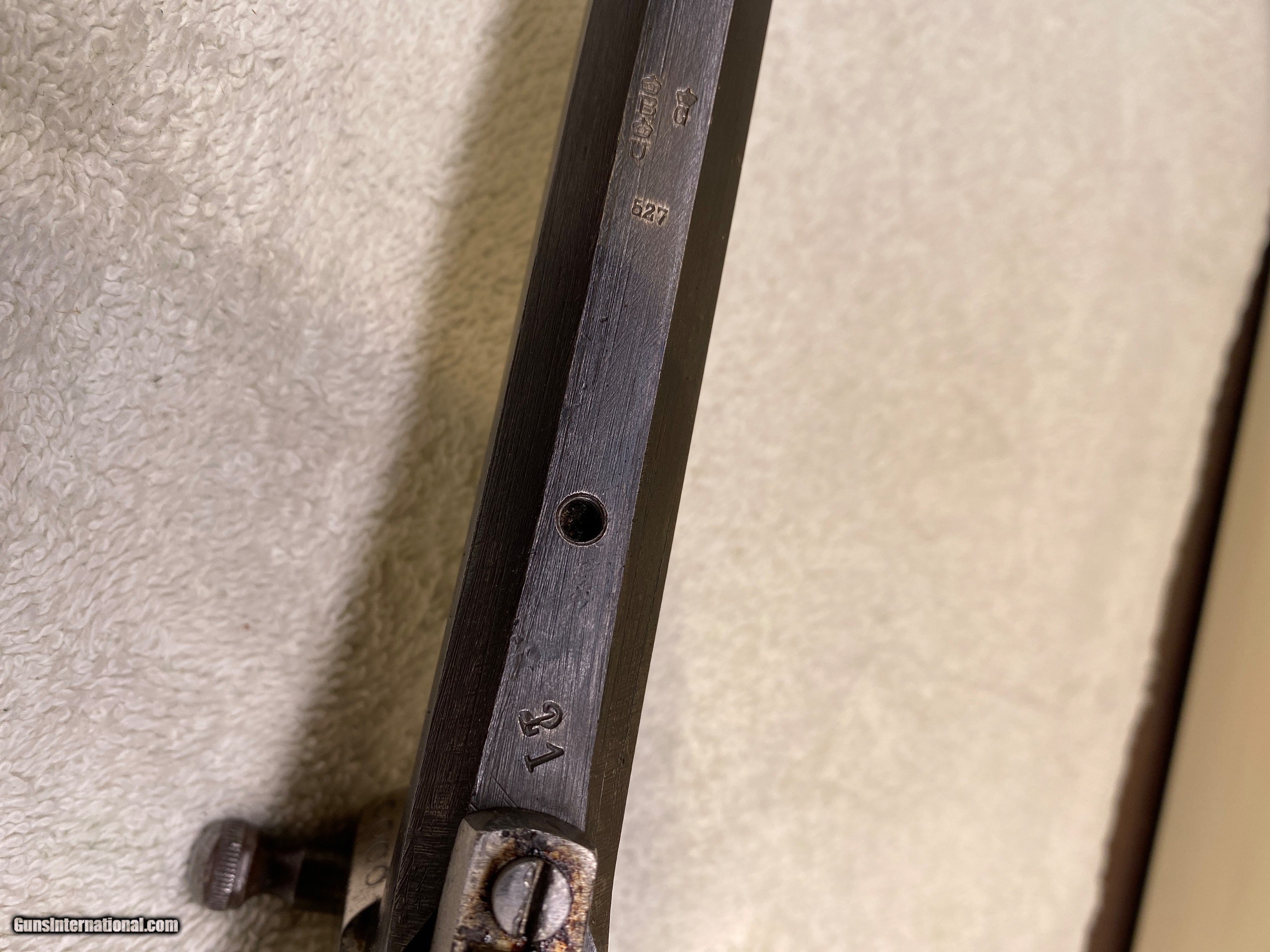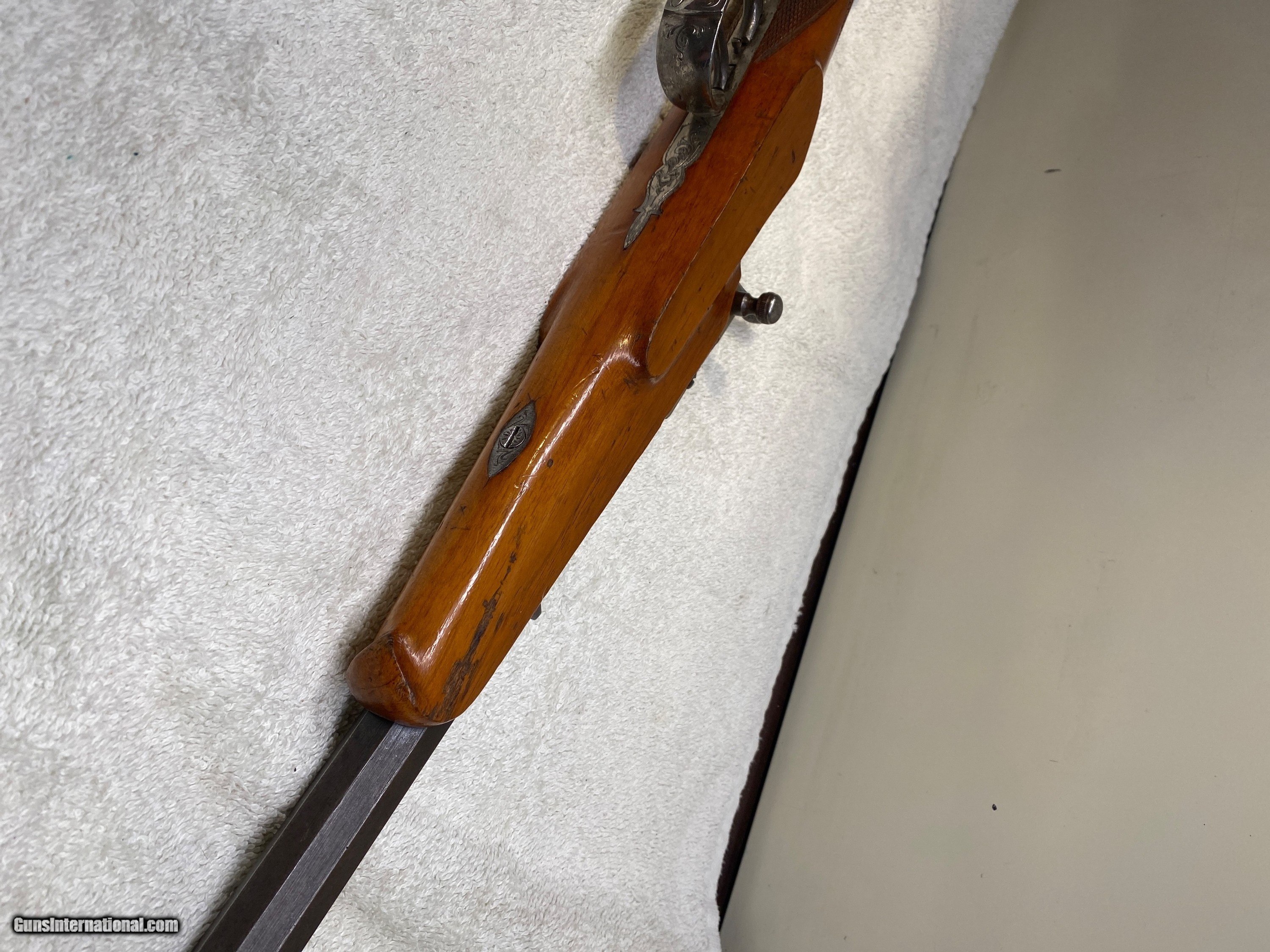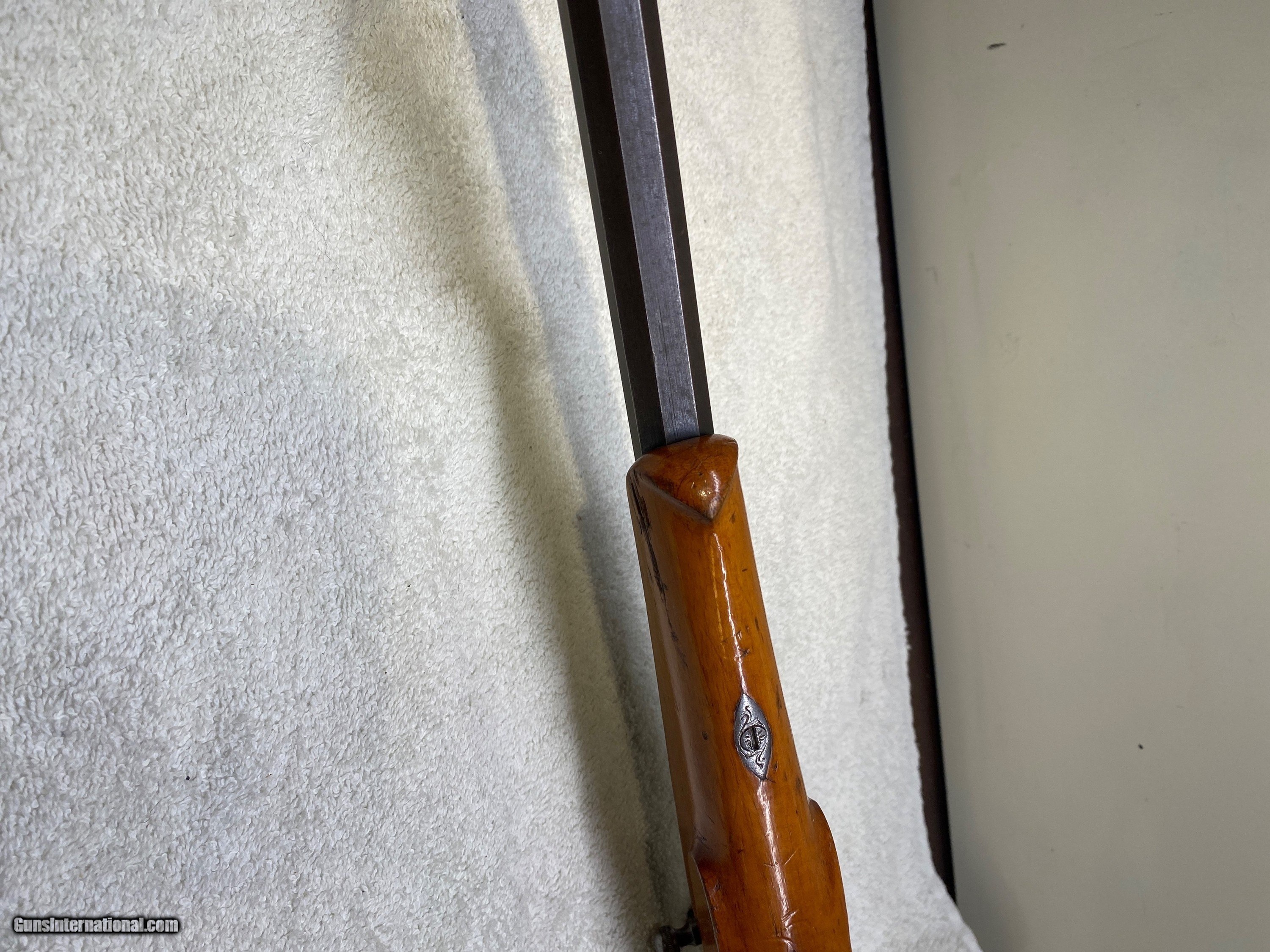 Description: SOLD Antique German parlor rifle. Before homes had televisions, and bars had pool tables and dart boards, Indoor target shooting was not an uncommon pastime. This is a beautifull example of a, fancier than usual, late 1800s Flobert action parlor rifle. Nice engraving, nice wood, no cracks or serious oxidation. Just the normal haldling dings you would expext for a 130+ year old rifle. 22 bb cap,(6mm flobert). 0.05 gr NGP m/71-1 gr on barrel German proof marks. $50.00 shipping, USPS money order preferred, personal checks ok, will ship when cleared. looks to be all original w/ near perfect bore. SOLD Antique: Yes Rifle Caliber: .22 BB Manufacturer: Germany Model: Flobert action Serial Number: 21 Barrel Length: 23 1/2 Condition: Good Metal Condition: Good Wood Condition: Good Bore Condition: Good Barrel Type: Octagon Action: Flobert Triggers: double set LOP: 13 3/4 Finish: original Weight: 4 1/2# Sights: original Manufacture Date: early 1890s Engraving: good Proof:Nitro: yes |