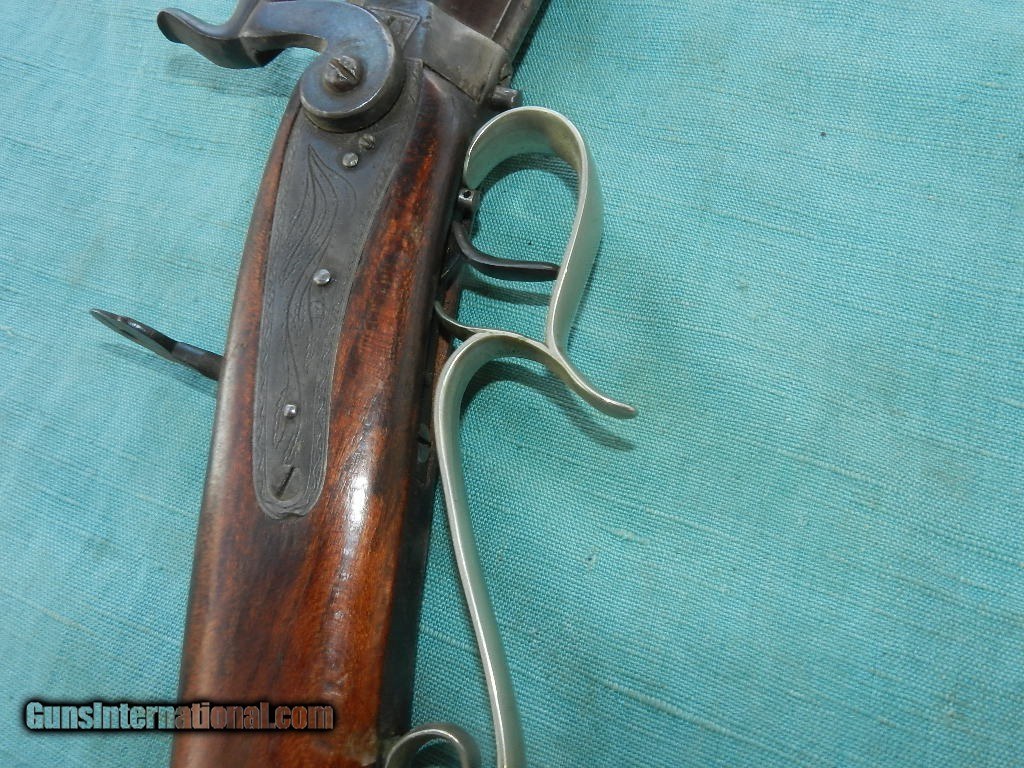 Description: A very fine .32 cal target rifle of the 19th century with a half round/octagonal 25" barrel with a rear rocky moiuntain type sight and a tang peep sight, The front dovetailed sight is missing,, but can be replaced. The exterior metal is smooth grey and clean.Bore is clean and has sharp rifling. Top of the barrel flat has clearly marked : the name and CAST STEEL. Appears to have an adjustable trigger with a rod in front of the trigger.The back action lock works well also. Comes with a hardwood ram-rod with a brass tip, The muzzle flat of the barrel has four holes drilled for a muzzle collar when loading. Furniture is high polish German silver. The American hardwood stock has a mottled finish and may have been refinished at some time. Overall a fancy, clean, quality 19th target .32cal rifle. When buying a gun always have it examined by a competent gunsmith before shooting. To buy a gun from me you must get a direct email for me, with details, and shipping cost. We don’t have a web site .I prefer money orders or a check. Item ships when funds come in. I try to keep guns affordable, which means I make less money than most dealers. You won’t get altitude sickness, or nose bleed, with my prices! I consistently have the best selection of older guns If you attempt to buy, you must still contact us for details . Best to email to buy. Sometimes a local person can stop buy and purchase before the gun is removed. Sometimes not home to get calls. Some guns are required shipment to a gun dealer near you for a transfer to you when it arrives. Otherwise many older or black powder guns ship to your door. With the widest selection of older guns at great prices, We don’t have a store, and sell on the internet only. I’m easy to get along with. Thank You SOLD Antique: Yes |