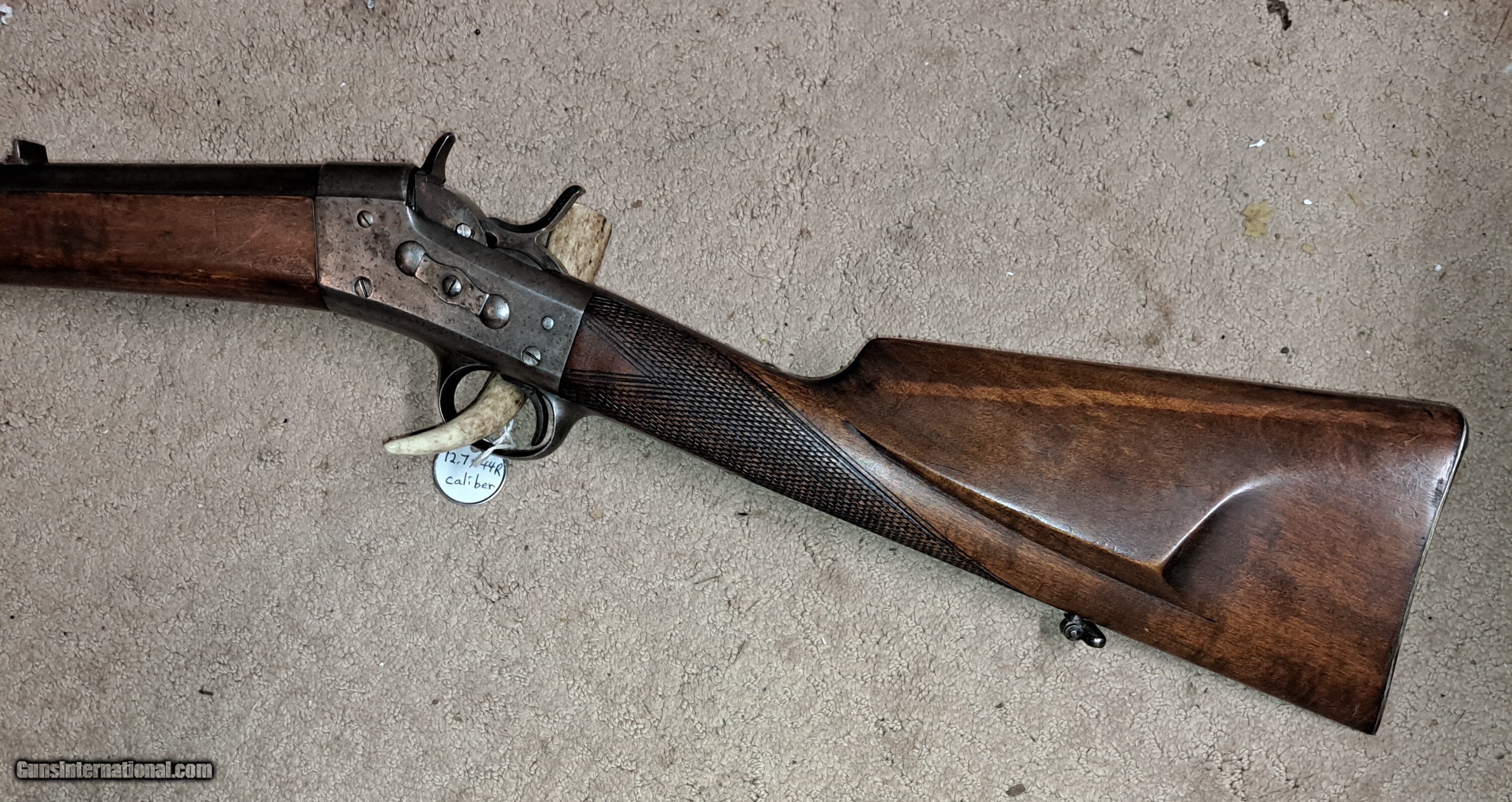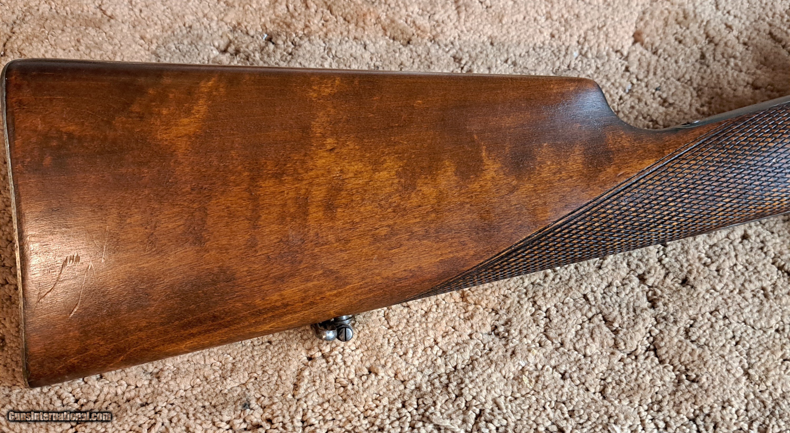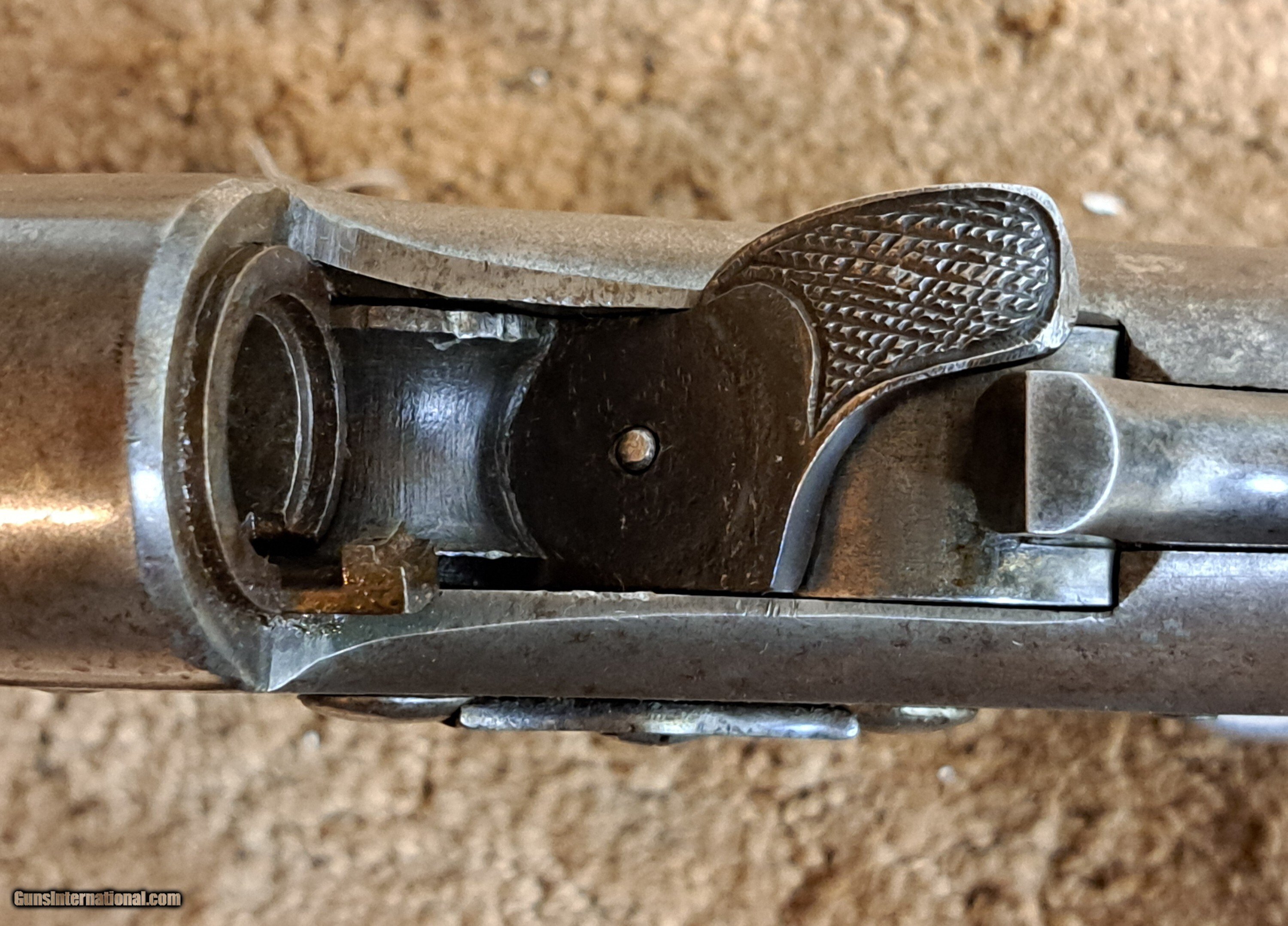 Description: In the Husqvarna catalog, this rifle is the No. 2. This should not be confused with Remington designations. It is a fullstocked commercial rifle in 12.7x44R (similar to .50-70). Cases easily made from shortened .50 Alaskan brass. You will need to slug bore or do a chamber cast to determine optimal length and bullet diameter. It has a 31.25" round barrel with excellent bore. Finish shows wear, but no rust. The rear sight has a broken leaf. Correct replacement included. Needs some minor file work to fit. I believe that the stock is Arctic Birch. Has some nice figure and is in very good plus condition. Horn nosecap. Has irs original cleaning rod with horn tip, which is rare. LOP is 13.75". Rifle weighs about 8.7 lbs. Very hard to find rifle in US. $1200 + Shipping. Price: $1,200.00 Contact Seller |