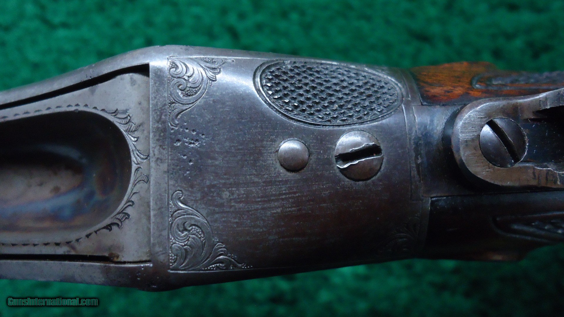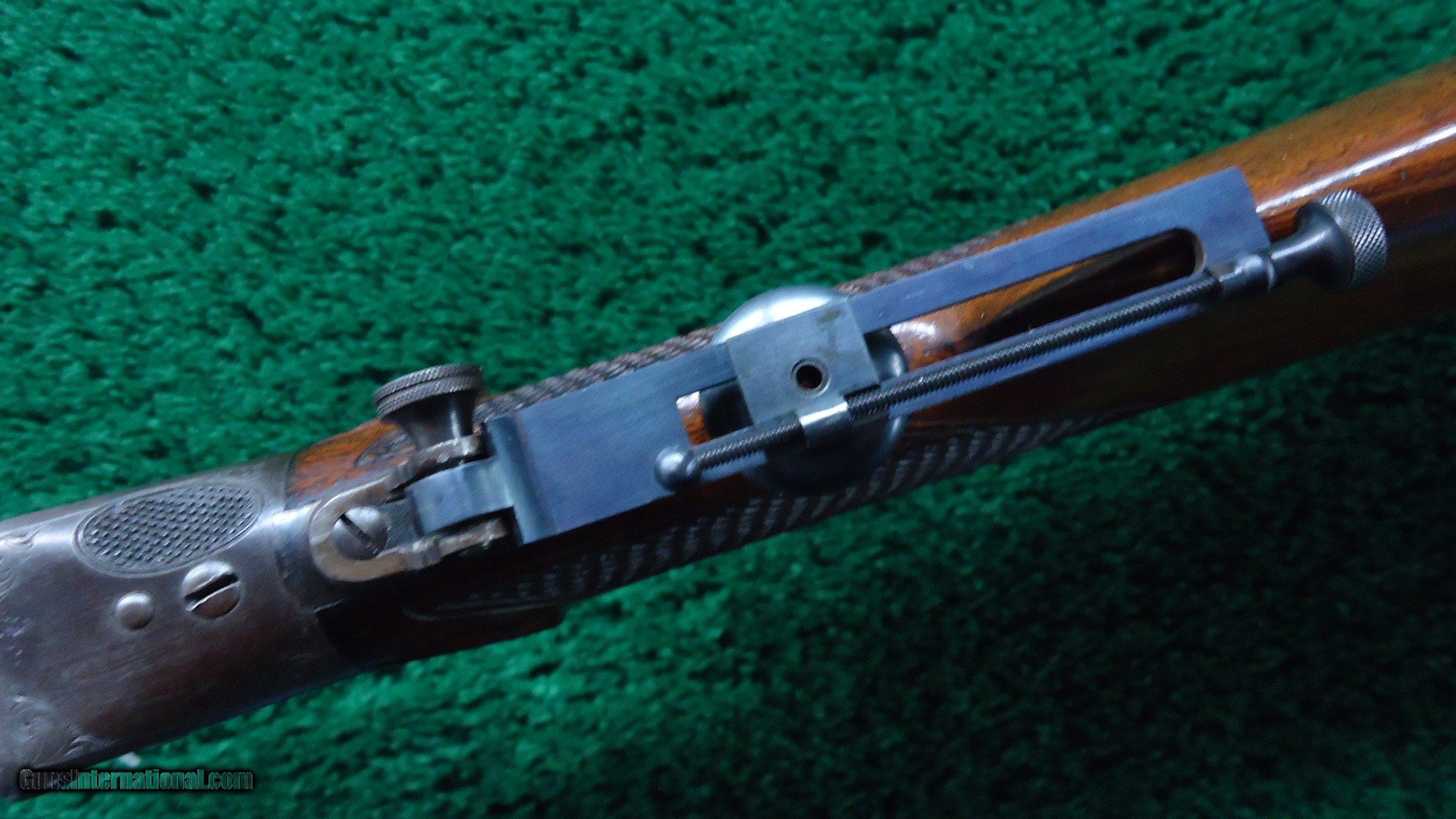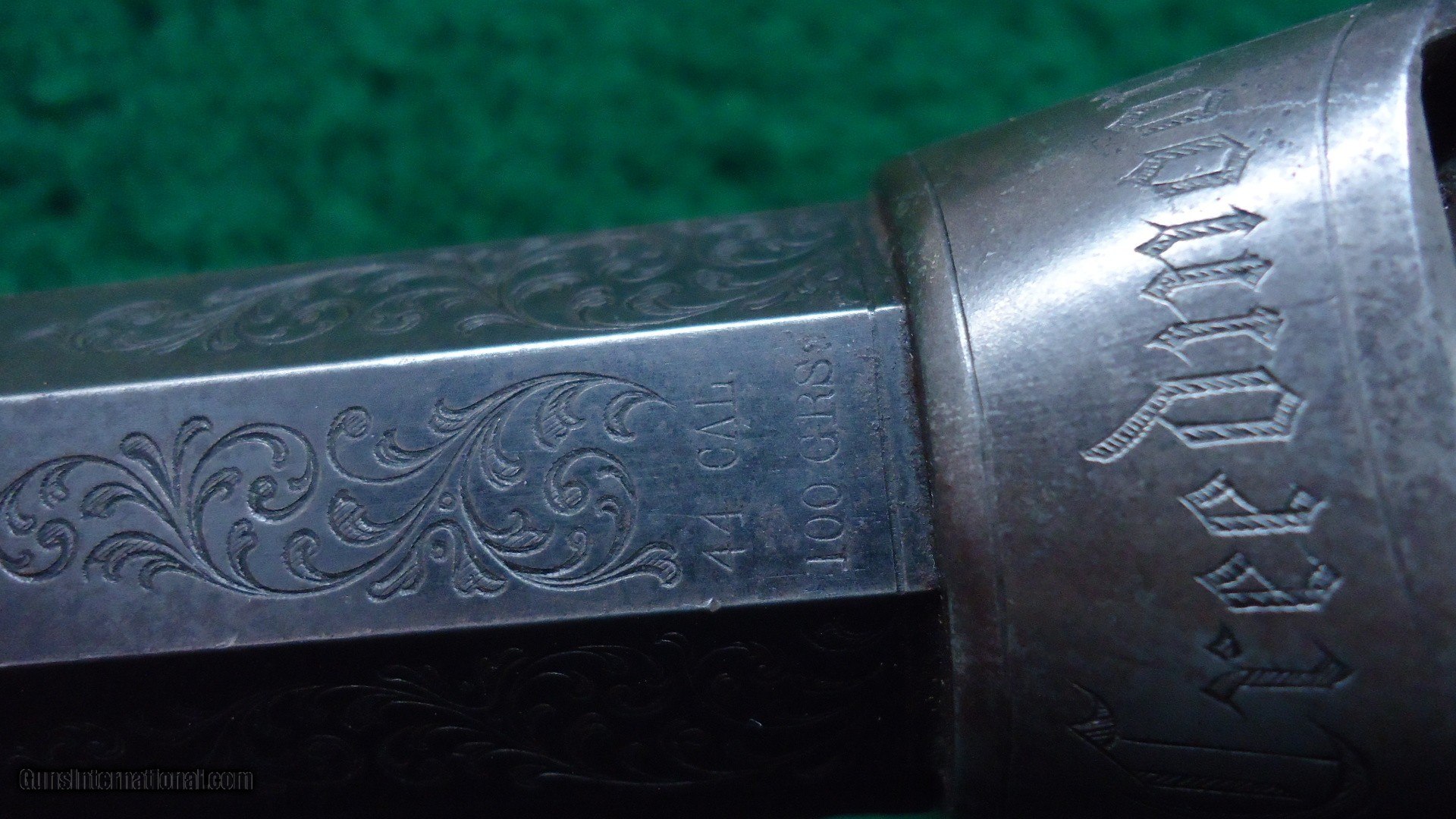 Description: 26-3/4 inch part round part octagon barrel chambered in the .44-100 Creedmoor caliber. Bright near excellent bore with crisp rifling throughout. Most all of the original thinning barrel blue remains. Just some slight edge wear on the octagon corners. Barrel was most likely shortened long ago. The finely engraved frame has good traces of original case color remaining in the protected areas with the balance dimming to a gray patina. The sides of the frame are finely engraved with detailed scrollwork and punch-dot shading that continues slightly onto the barrel flats. Each side shows a game scene flanked by parchment scroll. Right side with an eagle landing upon a rabbit and the left side feature a bull and cow Elk in forest scene. ''Creedmoor' is engraved on the top of the frame next to the barrel. Original rear sight base is present but the assembly appears to be a replacement and retains brilliant fire blue. Blade front sight. Checkered pistolgrip walnut stock and forend remain in fine condition retaining most original varnish and mostly crisp checkering. Although no longer in ''Creedmoor'' configuration with the shorter barrel, the rifle is now quite handy and features superb engraving! Leroy Merz Antique Firearms specializes in antique and vintage Winchesters and other fine American firearms. Since 1965 Mr. Merz has taken part in the world of firearms and has been a contributor to many well known reference books. We have hundreds of additional guns in every price range at our home online. Search for Merz Antiques in google. SOLD Antique: Yes |