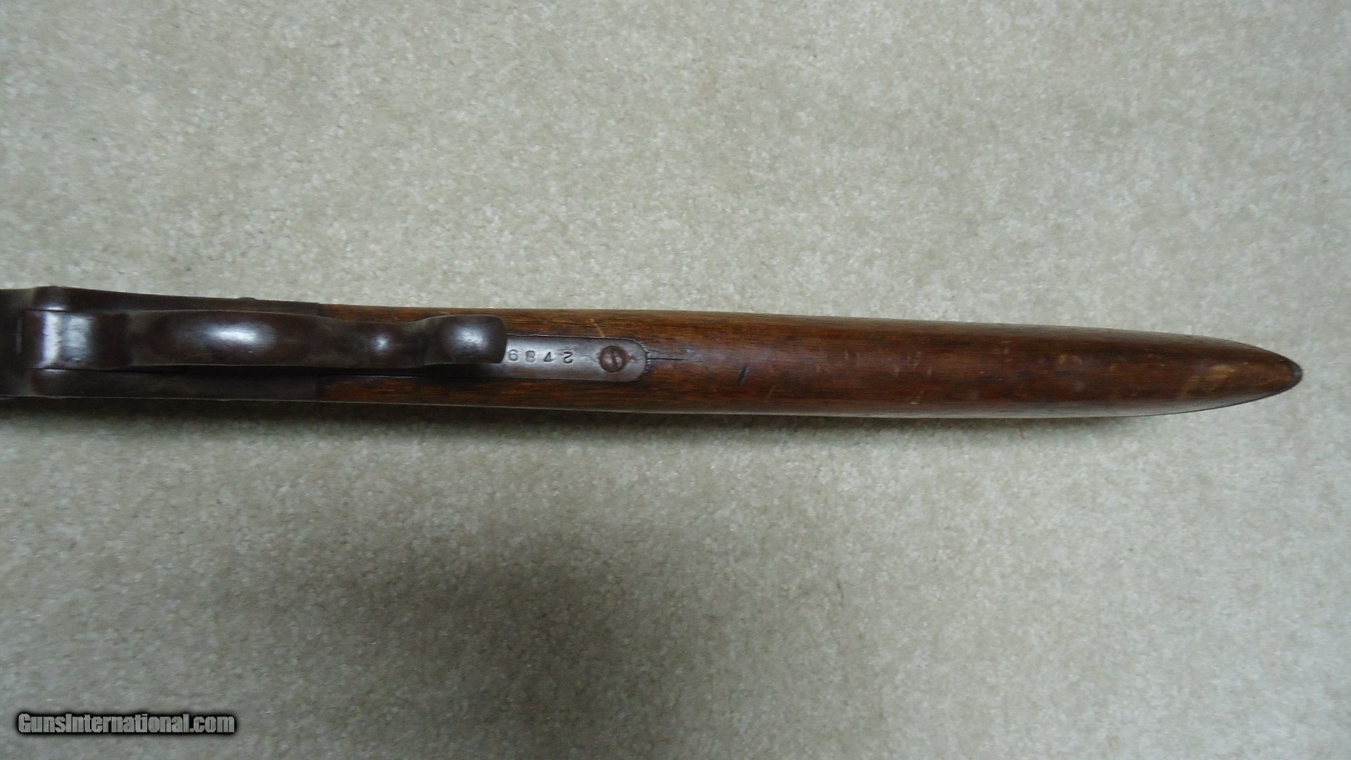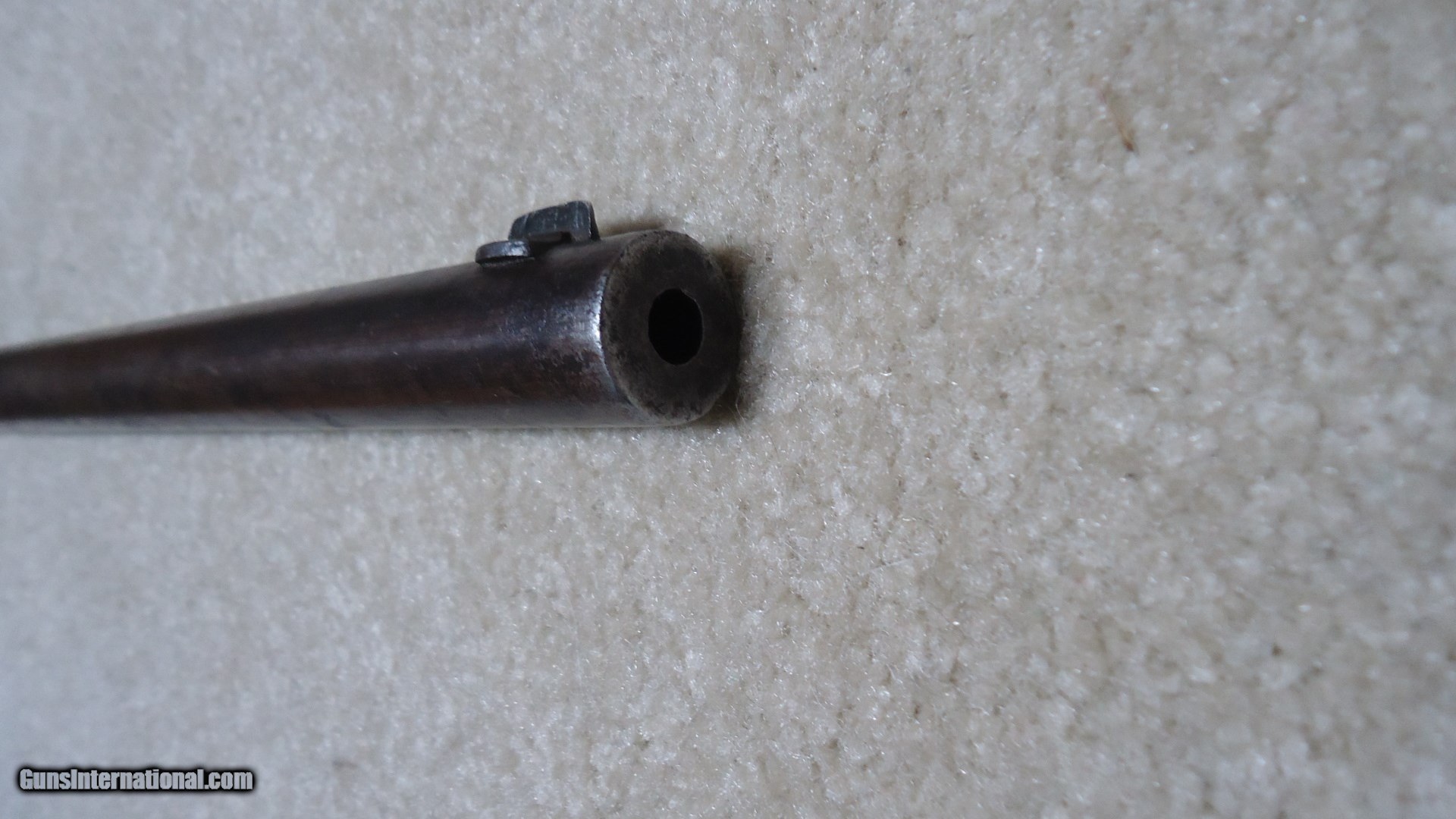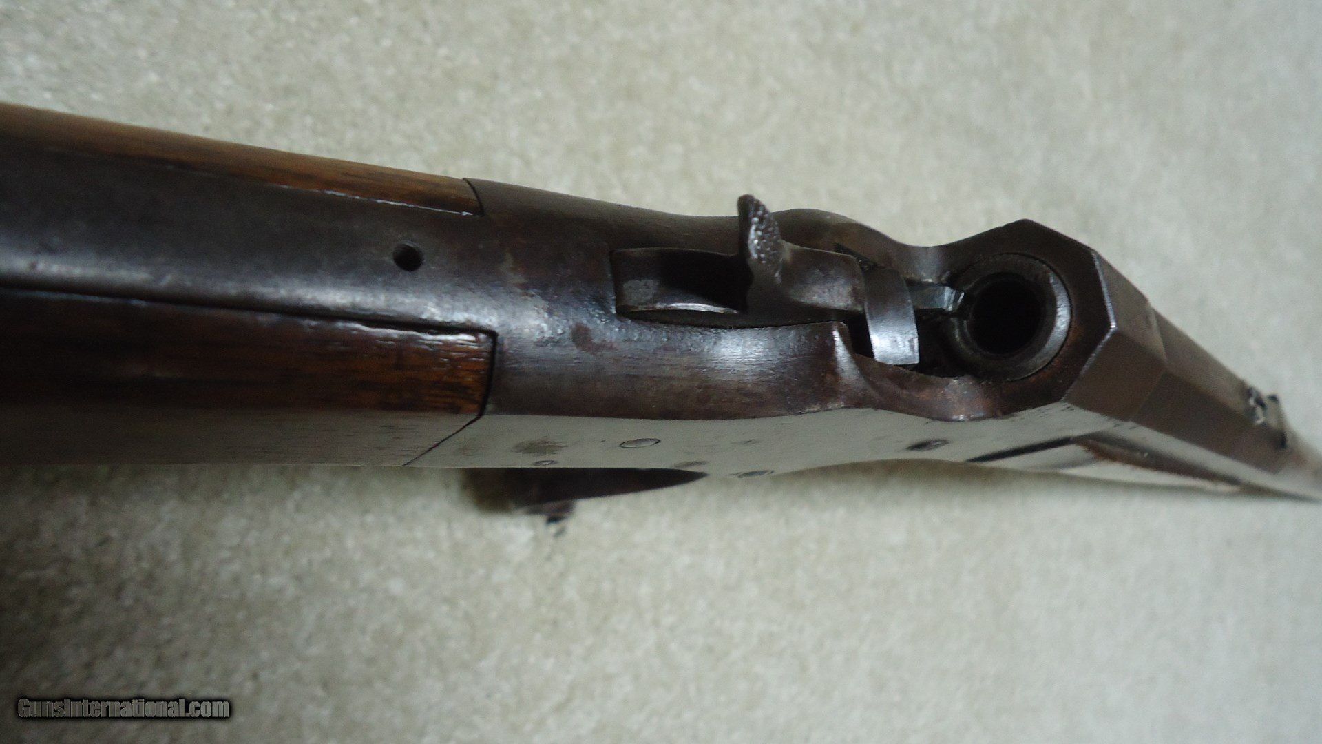 Description: SCARCE CALIBER STEVENS MODEL 44 SINGLE SHOT RIFLE IN .32-40. This is an earl rifle with serial number 6XXX. Aged blue/brown barrel with good markings shows some signs very light scattered rust that was wiped off. 26” half round barrel with matching number to the receiver. Receiver is an uncleaned smooth dark patina, fine action, fine bore is a little dark with good rifling throughout and ought to scrub out better. Any roughness is very light and surface. Fine butt stock with crescent butt plate, fine forearm with shallow sliver out of the upper left side. Buckhorn rear sight is broken off and should be easy to replace, blade front sight. Nice overall aged appearance. This one came out of the Eastern Montana/North Dakota area.. Hard caliber to find. SOLD Antique: Yes Manufacturer: STEVENS Model: MODEL 44 Serial Number: 6XXX Caliber Info: .32-40 Condition: VG Barrels: 26" 1/2 OCT |