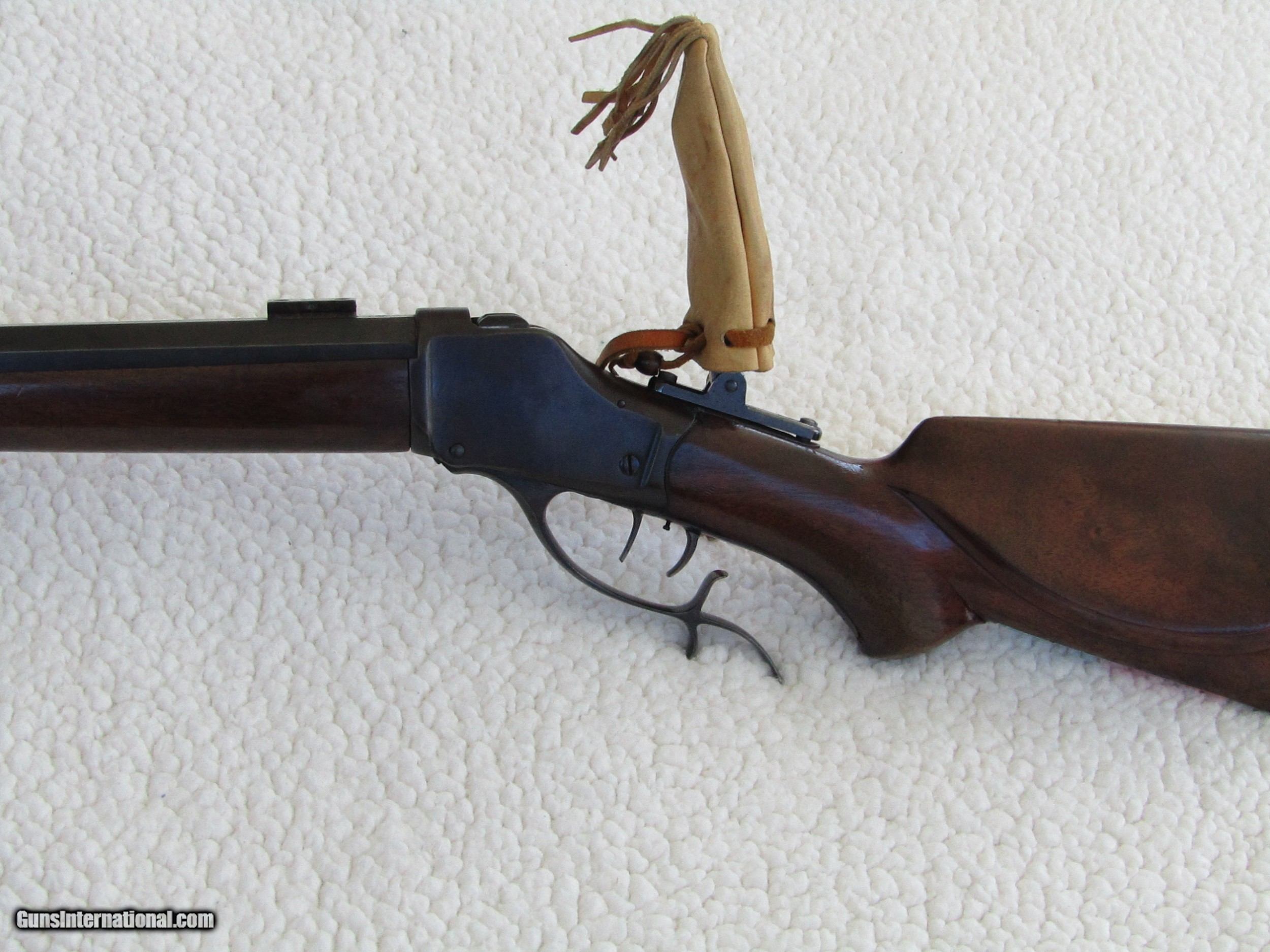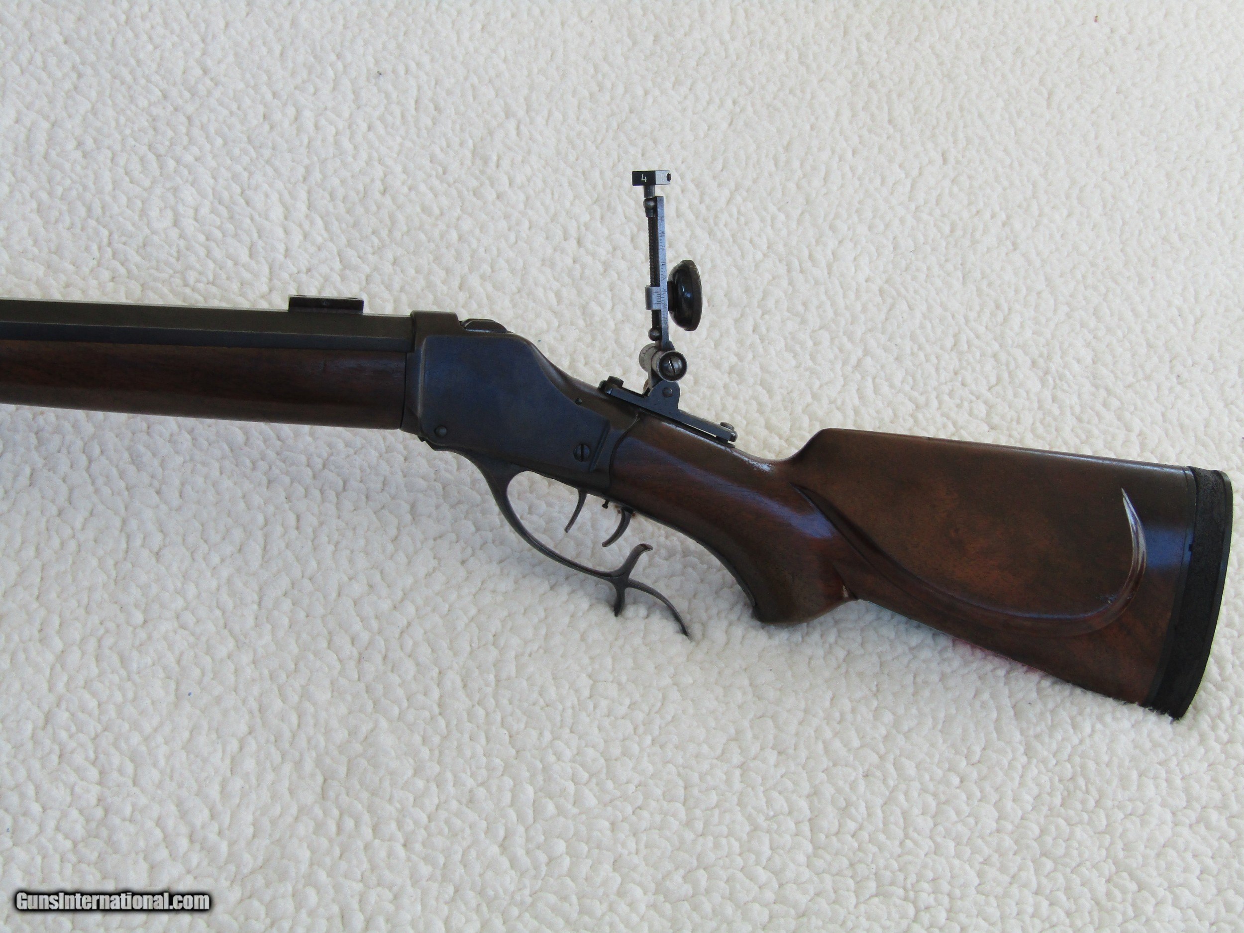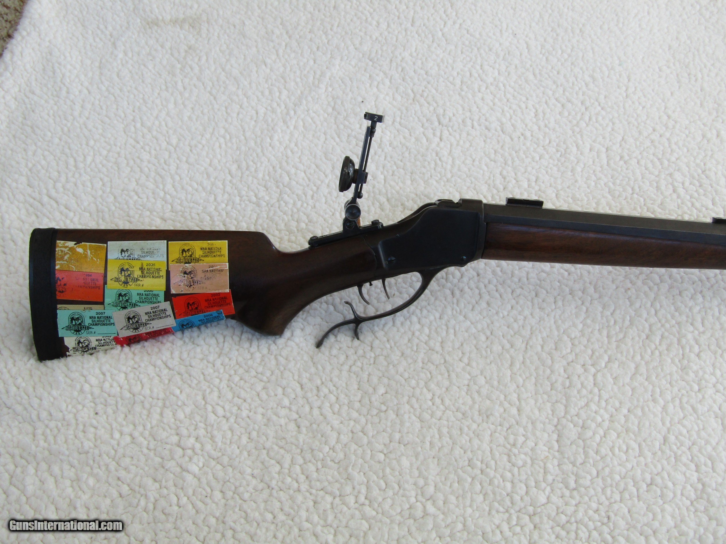 Description: This is an original 1885 high wall 40-65 target rifle. It has an Obermeyer 13.7 twist barrel. The barrel is made for long range target shooting.It shoots very accurate at all ranges.The trigger is a double set wide adjustable factory.It has an MVA tang sight with a marked elevation knob on the top.The front sight has a spirt leval and replaceable aperatures.The barrel is 32" and 1/2 octagon.The wood is walnut and polished with oil finish.The stock has a pistol grip and a cheek piece.It has 12.5 LOP.The butt plate is rubber for reducing recoil.The Obermeyer barrel is made by Mr.Obermeyer who I believe is the best maker in the country. He has taught most of the other makers how to make barrels.I am 87 years old and now shoot 22LR only.I have shot all over the country.I have 12 National records on the wall here. SOLD Curio/Relic: Yes Antique: Yes Rifle Caliber: .40-65 Winchester Manufacturer: Winchester Model: 1885 Barrel Length: 32 Bore: perfect Chambers: perfect Ejectors: good Condition: used Metal Condition: good Wood Condition: good Bore Condition: Very good Barrels: very good Barrel Type: 1/2 octagon Action: S.S pistol grip Triggers: double set Stock: Legal Butt Pad: rubber LOP: 12.5 Weight: 12# Sights: tang and barrel Item Location: Michigan |