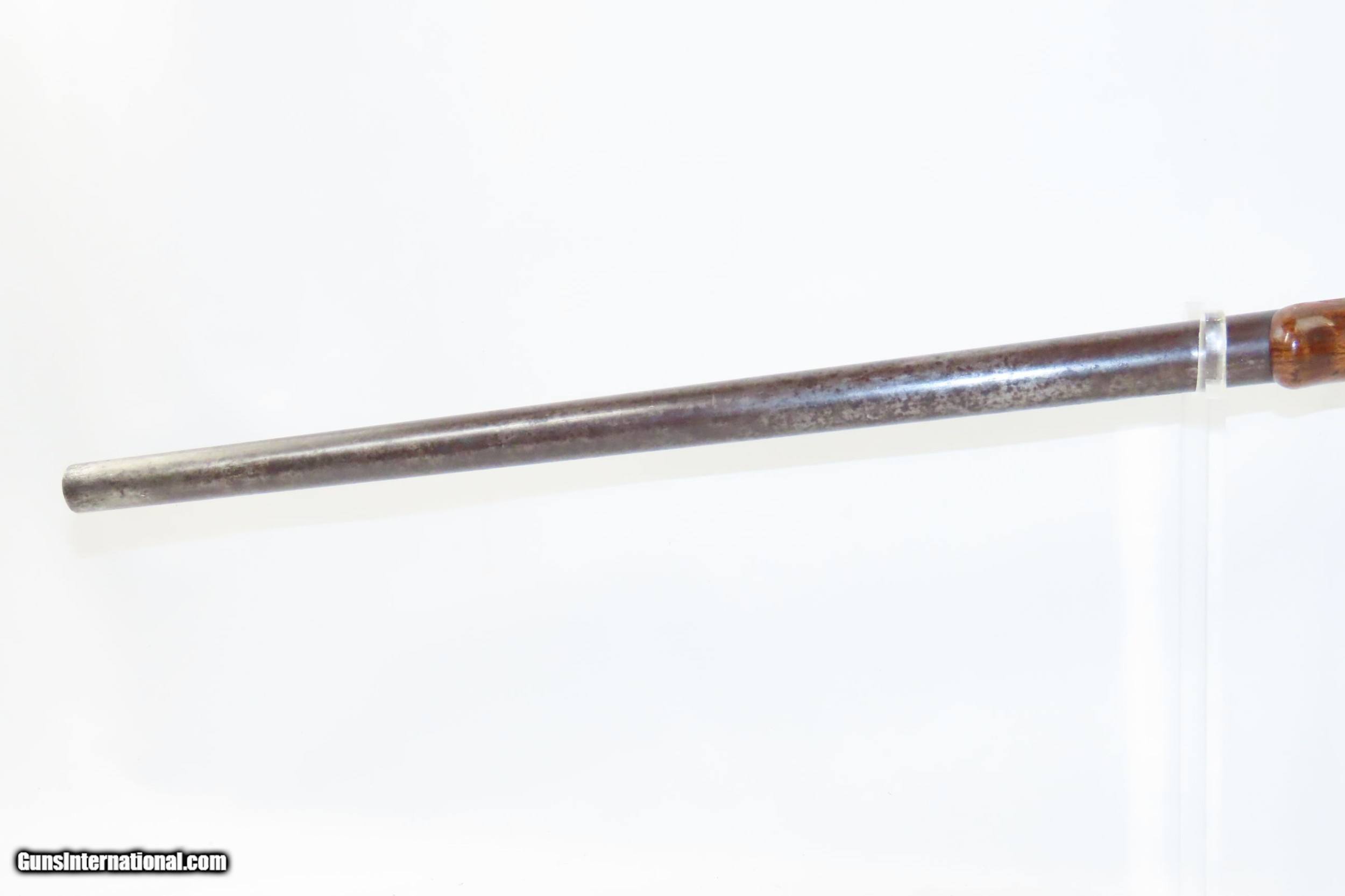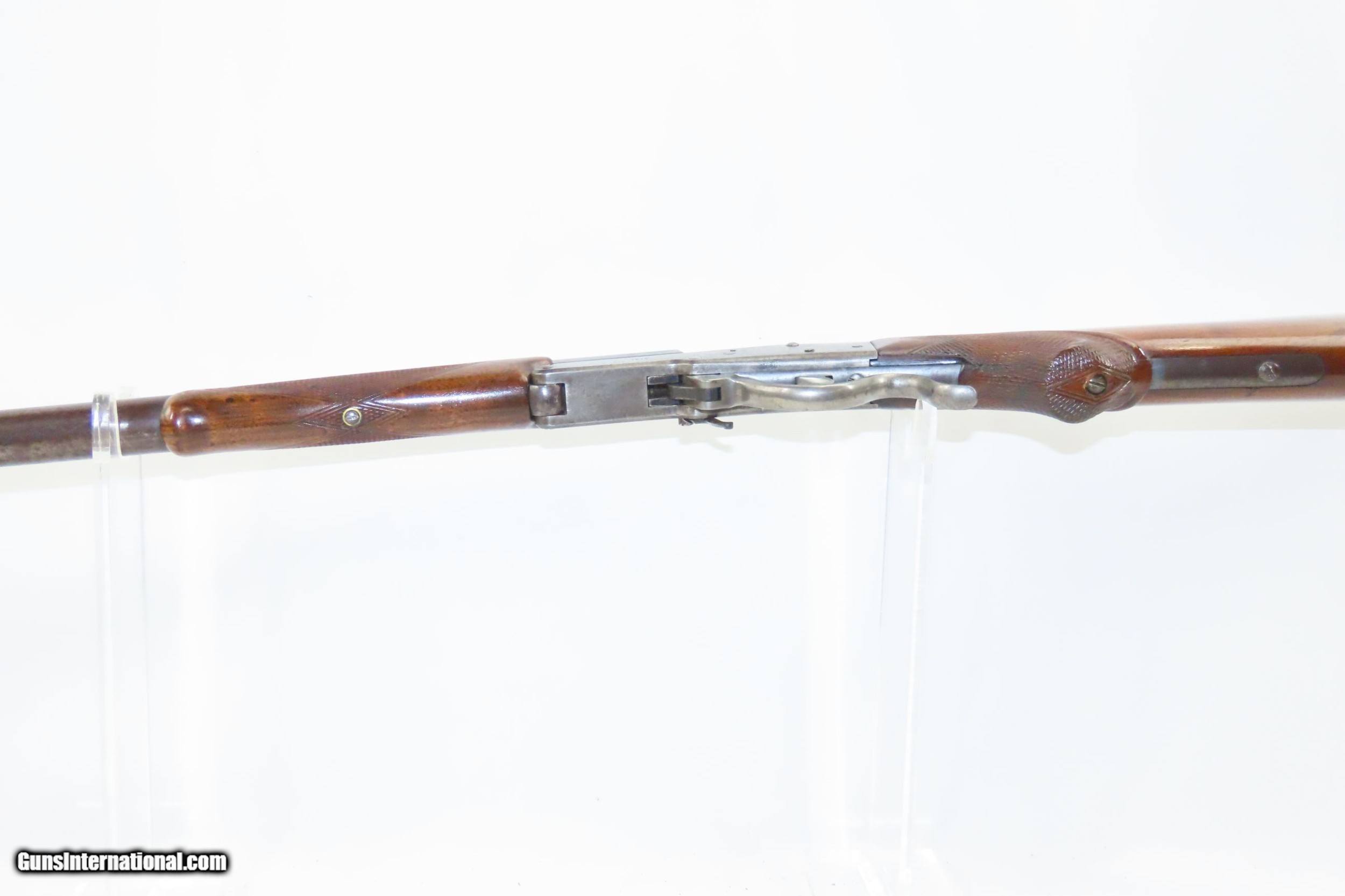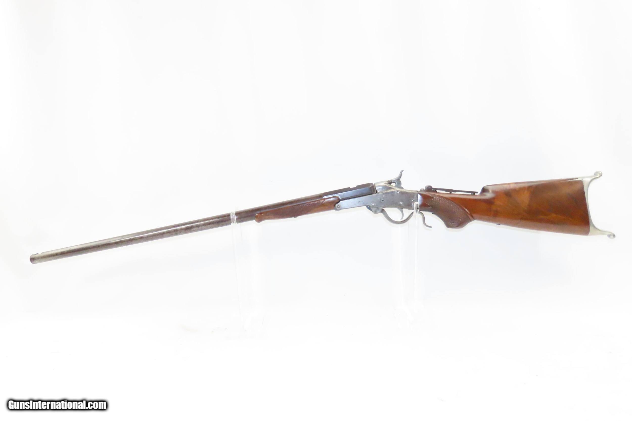 Description: .25-20 Single Shot Antique MASS ARM Model 1882 MAYNARD Hunting/TARGET Rifle With Fancy Walnut Stock & Swiss Butt Plate! Here we present an antique Massachusetts Arms Maynard Model 1882 Rifle in .25-20 Single Shot, made by Massachusetts Arms Co. of Chicopee Falls, Mass. The Maynard model 1882 hunting/target rifle was developed by Edward Maynard and produced during its eight-year production run between 1882 and the mid-1890s. It was one of the first rifles to use quickly interchangeable barrels of various calibers. Though many considered this rifle “ugly”, it was quite popular being both accurate and dependable. Maynard received his first patent in 1845 with the priming system which cycled a small mercury fulminate charge to a percussion cap. This invention turned out to be successful, and the United States Federal Government offered a dollar per weapon to produce them using his method. By 1855 all 1855 model .58 caliber military rifles and carbines were using Maynard's method. In 1851 Maynard patented a breech-loading rifle. The Confederacy during the Civil War took to this method particularly because it did not require the major manufacturing equipment used for most gun production. Maynard founded the Maynard Arms Company in 1857, contracting the Massachusetts Arms Company to manufacture the Maynard Carbines. The Maynard was one of the few patent breech-loaders to survive the Civil War. It continued to be produced for hunting and target shooting until the mid-1890s. The predecessor to this rifle, the Model 1873, was the first Maynard with standard chambering for centerfire metallic cartridges. This rifle features a fancy walnut stock with a pistol grip and checkering along with a Swiss butt plate. Adjustable tang-mounted rear sight. The barrel rear sight and front sight are absent but the front would likely have been a Beach. The overall condition is very good. Excellent action. The bore is in good shape and is nicely rifled. This example sports a solid stock with less than average wear and retains sharp checkering and fancy grain. Missing front and rear sights. The frame is marked “1873” on the left side while “1882” can be read on the right. Own the original! This is a legitimate antique and not a reproduction. Barrel is 25-3/4 inches. Caliber: .25-20 Single Shot Overall condition as seen in photos. Very Fast. Very Safe. FREE SHIPPING WORLDWIDE. Delivered directly to your door by express mail! Guaranteed AUTHENTIC & Includes CERTIFICATE OF AUTHENTICITY. ancestryguns $2425 #217023 SOLD Antique: Yes |