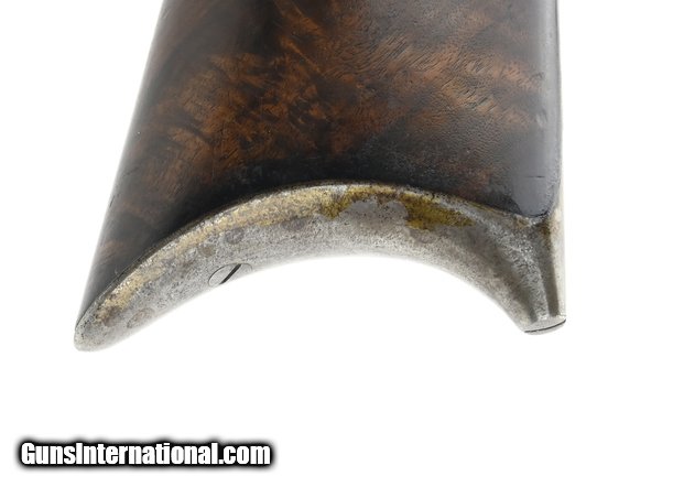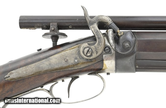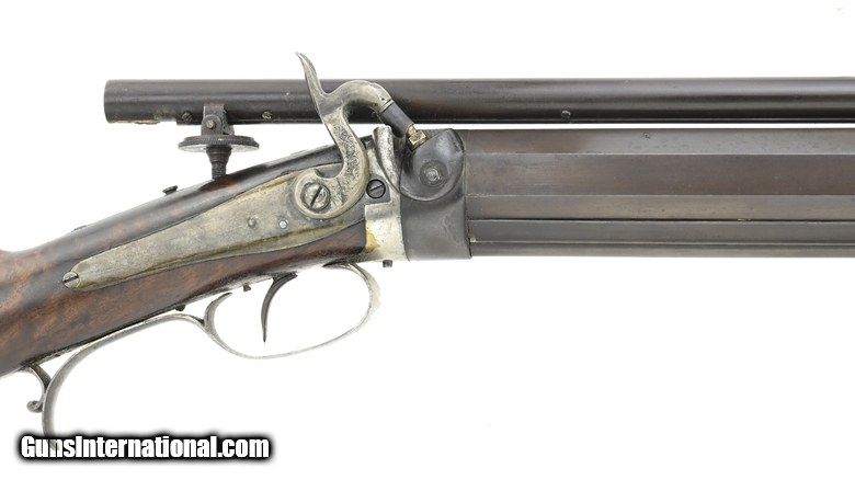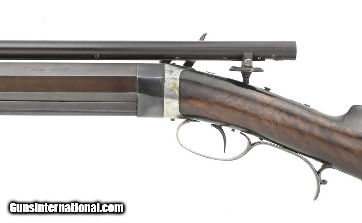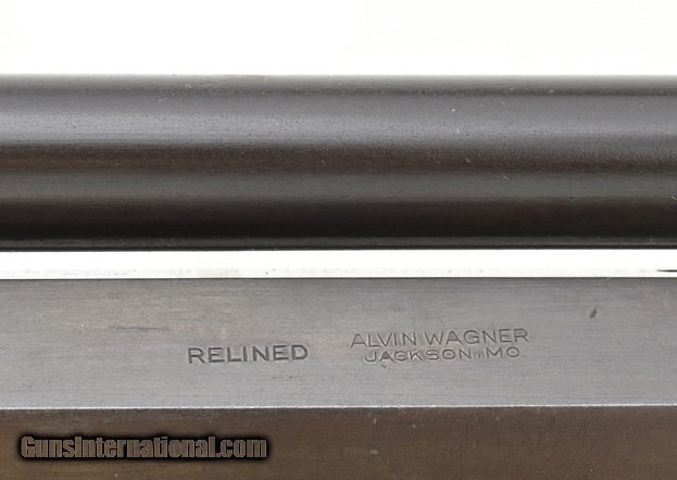Description: " Alvin Wagner Bench Rest Rifle. Scoped percussion bench rest rifle comes complete with false muzzle and bullet starter. The overall length is approx. 45.5”. The 29.25” octagon approx. .36 caliber barrel has an excellent bore. The barrel measures 1.4” across the flats. The rifle weighs 17.5 pounds. The barrel has several screw holes on the top flat under the scope. All metal has a smooth blue-brown finish. The barrel is marked “Alvin Wagner/Jackson. MO”. “Relined” is just forward of this marking. It is not clear whether Wagner is the original maker or the person who relined the barrel, or both. The scope is 34” long and is approx. .65” in diameter. The optics are good with some dirt on the lens and heavy crosshairs. The scope is externally adjustable for windage (by drifting the mount) and elevation (thumbwheel). The buttstock is high grade walnut with no cracks or chips. The false muzzle fits perfectly. Interestingly, the sight block on the false muzzle is an Indian Head penny. The bullet starter is approx. 7.5” long. It fits the bullet starter and barrel perfectly. The action functions correctly. This is a very high-quality percussion bench rest rifle that would be at home in any similar collection. SOLD Antique: Yes |