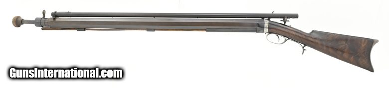Alvin Wagner Bench Rest Rifle. Scoped percussion bench rest rifle comes complete with false muzzle and bullet starter. The overall length is approx. 45.5”. The 29.25” octagon approx. .36 caliber barrel has an excellent bore. The barrel measures 1.4” across the flats. The rifle weighs 17.5 pounds. The barrel has several screw holes on the top flat under the scope. All metal has a smooth blue-brown finish. The barrel is marked “Alvin Wagner/Jackson. MO”. “Relined” is just forward of this marking. It is not clear whether Wagner is the original maker or the person who relined the barrel, or both. The scope is 34” long and is approx. .65” in diameter. The optics are good with some dirt on the lens and heavy crosshairs. The scope is externally adjustable for windage (by drifting the mount) and elevation (thumbwheel). The buttstock is high grade walnut with no cracks or chips. The false muzzle fits perfectly. Interestingly, the sight block on the false muzzle is an Indian Head penny. The bullet starter is approx. 7.5” long. It fits the bullet starter and barrel perfectly. The action functions correctly. This is a very high-quality percussion bench rest rifle that would be at home in any similar collection.