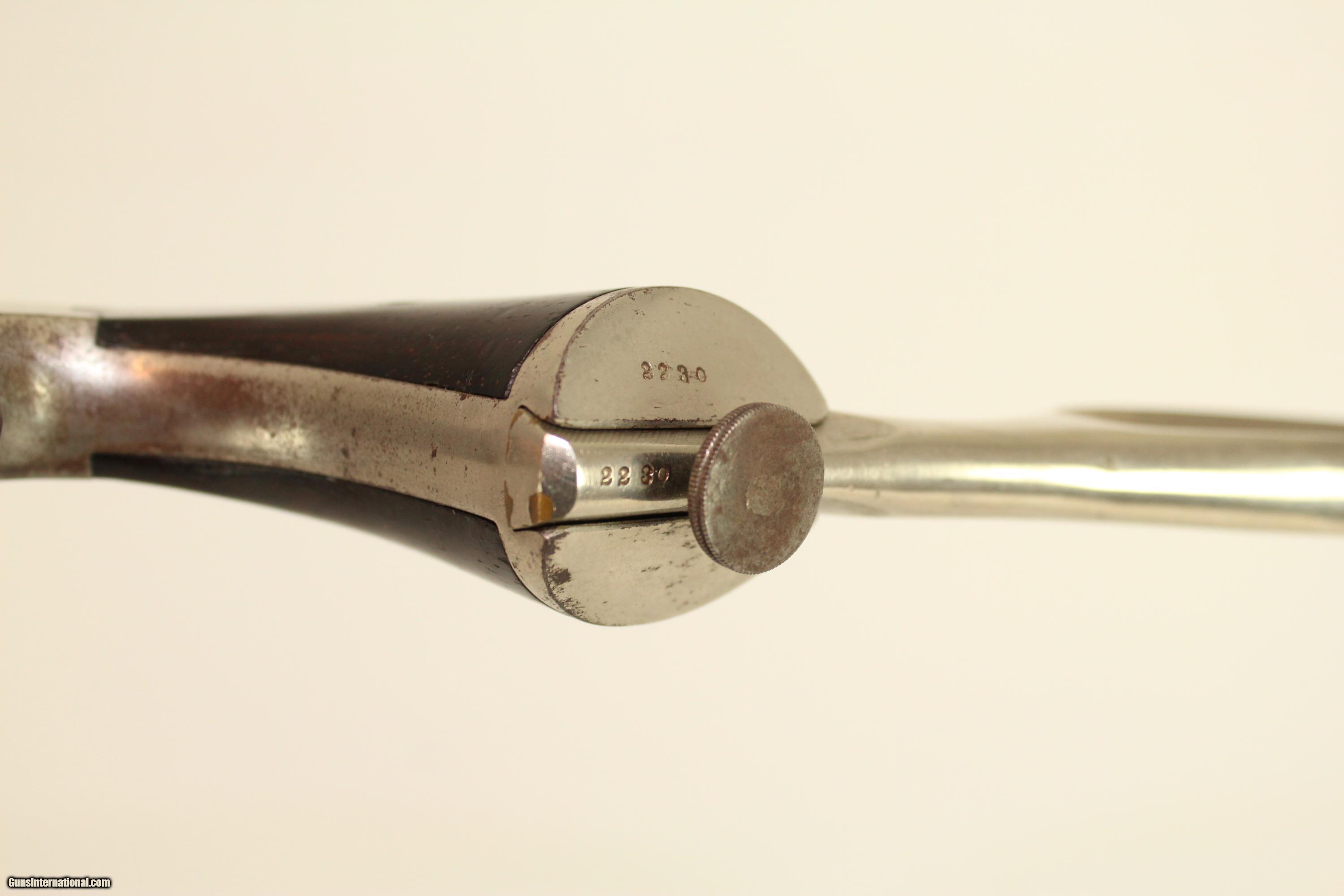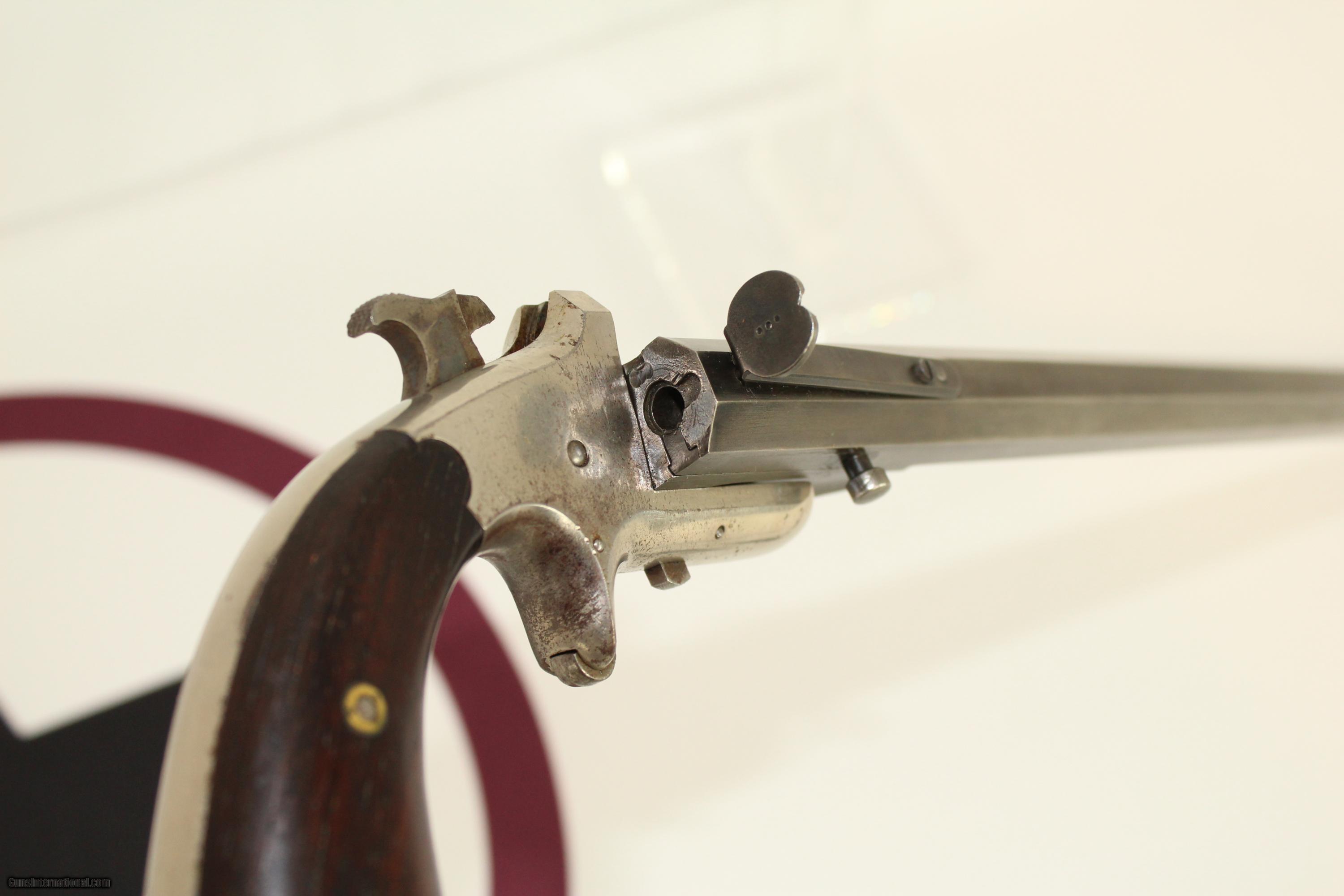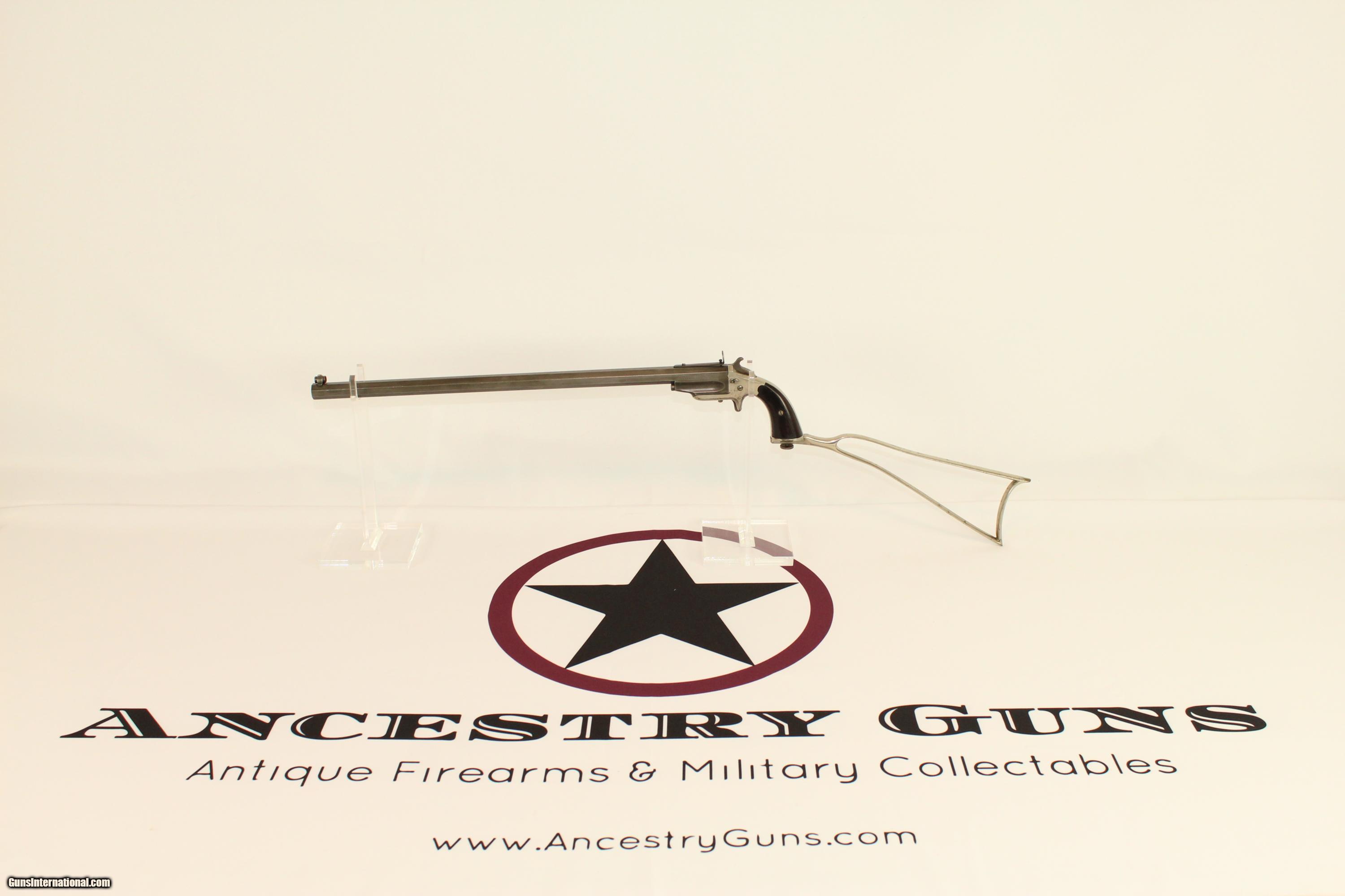 Description: Antique Frank Wesson 1870 Pocket Rifle with Case Scarce Matching Numbered Shoulder Stock and Case! Here is a Frank Wesson 1870 Pocket Rifle with matching numbered shoulder stock and case. Coined “The Sportsman’s Jewel”, this little .22 was a handy little gun for the outdoorsman. It is a single shot, and unlike similar designs, this barrel swivels on a horizontal axis for loading and unloading. The wire stock is numbered to the gun and attaches to the bottom of the grip via a machined groove, then tightens with a screw. The wood case is original and also numbered to the gun. This piece is quite the jewel indeed! It has been kept safe from harm all these years by the original wooden case. You certainly don’t see these every day! This is a legitimate antique and not a reproduction. No other cased examples available online, and very few besides. Barrel is octagonal and 18 inches in length. Caliber: .22 rimfire Bore is rifled and in good condition and the firearm is in good working order. Overall condition as seen in photos. Diversify your collection with this cased pocket rifle! Very Fast. Very Safe. FREE SHIPPING WORLDWIDE. Delivered directly to your door by express mail! Guaranteed AUTHENTIC & Includes CERTIFICATE OF AUTHENTICITY. ancestryguns #10131 SOLD Antique: Yes |