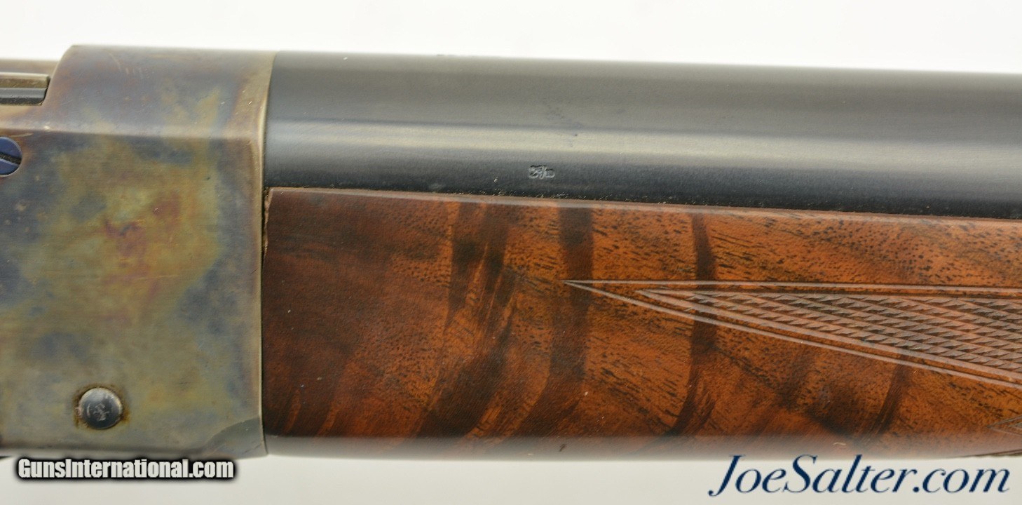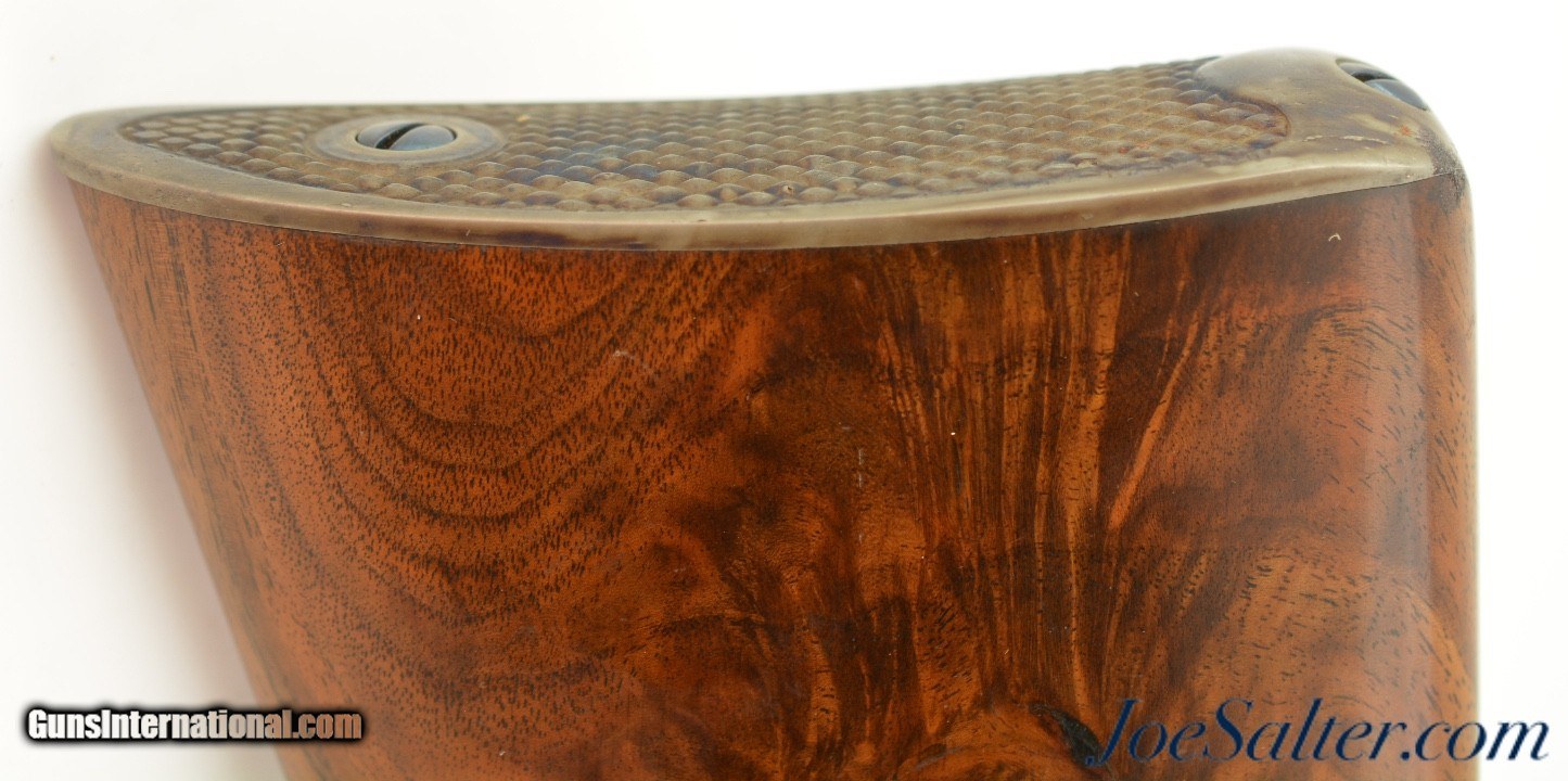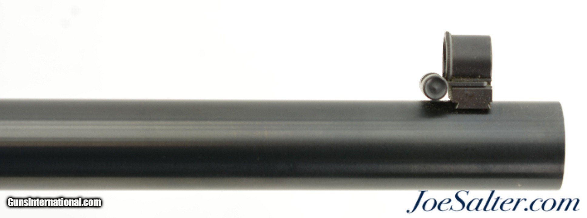 Description: Serial #6103, .45-100 Sharps (.45 Caliber with 2 6/10" case length), 34 inch extra heavy bull barrel with a bright, excellent bore marked on the top with "Old Reliable" trademark and "Sharps Rifle CO. BRIDGEPORT CONN." "Cal.45" with "2 6/10" on the side. This is a Custom built long range rifle featuring a beautifully restored original Sharps Borchardt Model 1878 dropping block action receiver, modern custom barrel and stock weighing in at 13.12 pounds. Though unmarked it certainly appears to be the work of master Gunsmith John P. King of Kila Montana. It features a spirit level windgauge front and long range Vernier tang mounted peepsight, and deluxe checkered Walnut forearm and stock along with a case hardened steel shotgun style butt plate. In excellent plus condition the barrel retains virtually all, 98-99% of the original high polish blue finish with some very light handling marks and several light scratches near the breech. The frame, lever, action and safety show vibrant case-colors with some of the original Sharps markings still visible and the trigger and screw heads show what look like a modern approximation of nitre blue and the top tang screw head has some distortion. The forearm shows some very light handling marks with a slight surface crack on the side of the black tip with the stock near excellent with very slight use and handling marks both with crisp checkering. The action functions properly with a tight lock up and very responsive lever. A beautiful custom Borchardt rifle in the original Sharps caliber that looks as great as it shoots! Antique Antique: Yes Price: $5,495.00 Contact Seller |