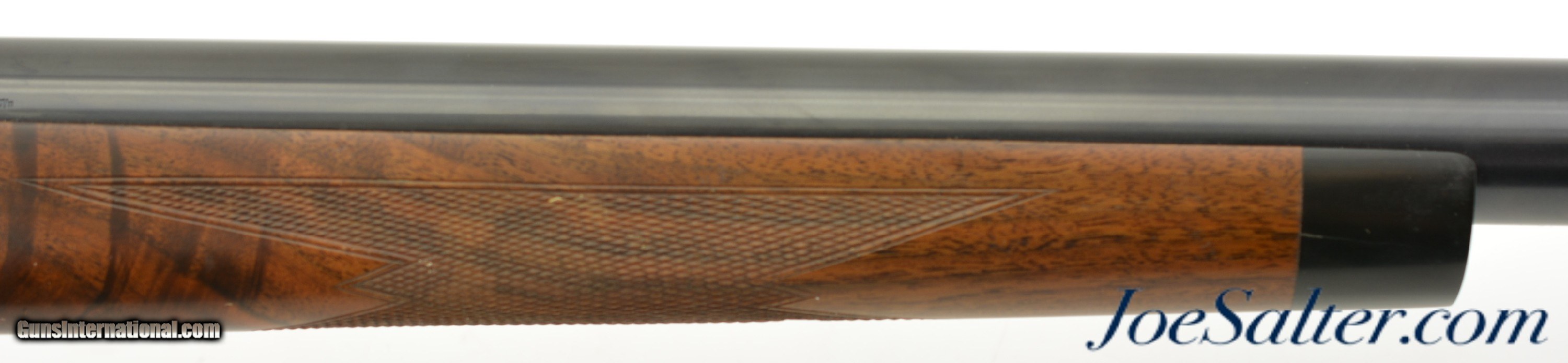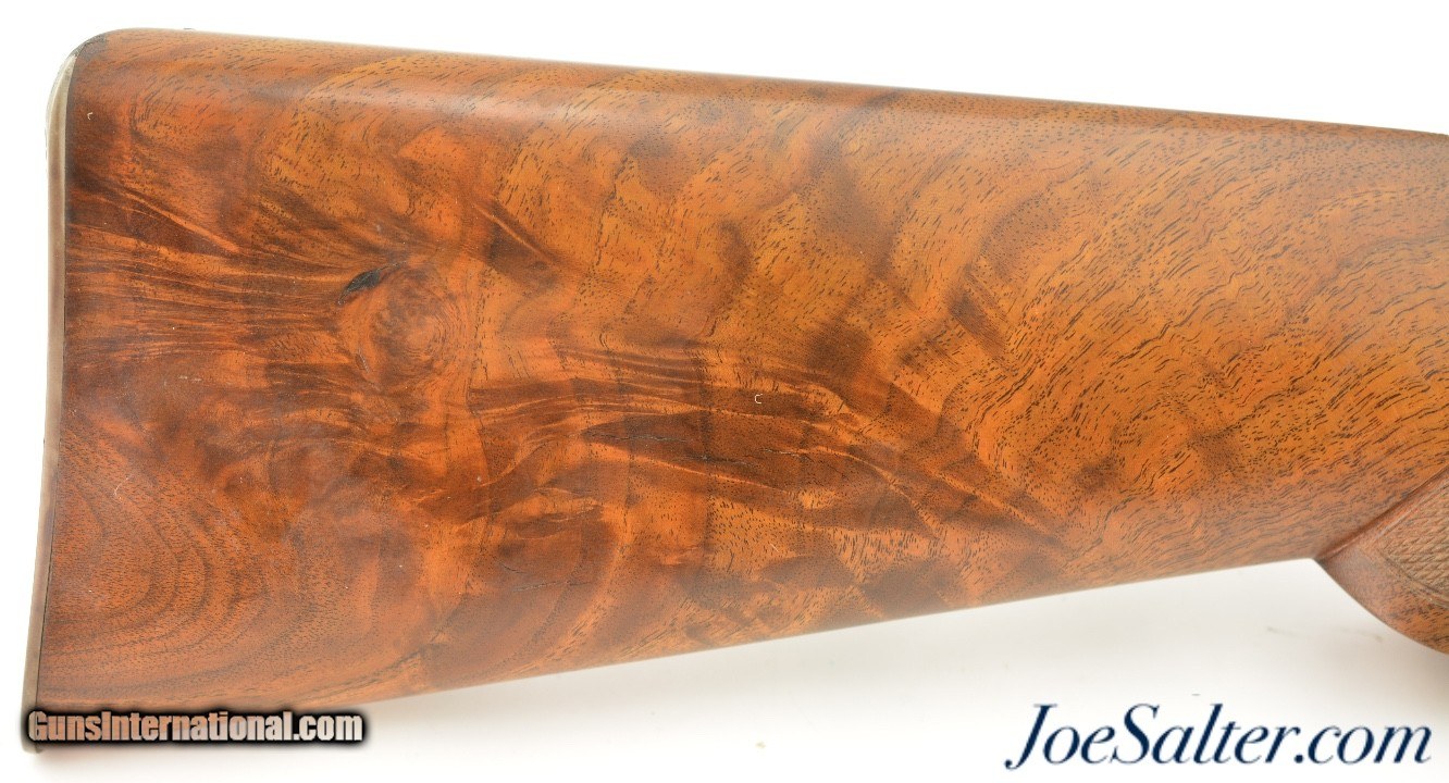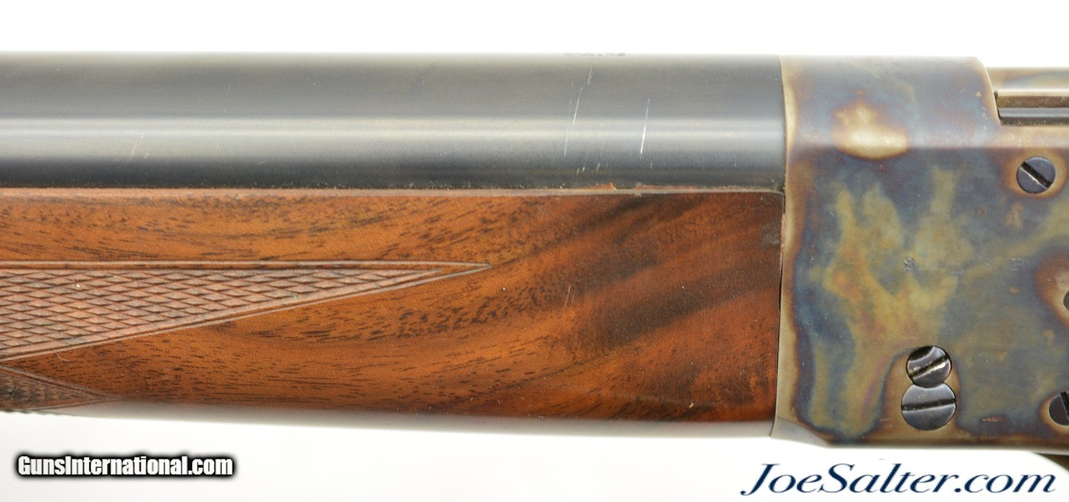 Description: Serial #6103, .45-100 Sharps (.45 Caliber with 2 6/10" case length), 34 inch extra heavy bull barrel with a bright, excellent bore marked on the top with "Old Reliable" trademark and "Sharps Rifle CO. BRIDGEPORT CONN." "Cal.45" with "2 6/10" on the side. This is a Custom built long range rifle featuring a beautifully restored original Sharps Borchardt Model 1878 dropping block action receiver, modern custom barrel and stock weighing in at 13.12 pounds. Though unmarked it certainly appears to be the work of master Gunsmith John P. King of Kila Montana. It features a spirit level windgauge front and long range Vernier tang mounted peepsight, and deluxe checkered Walnut forearm and stock along with a case hardened steel shotgun style butt plate. In excellent plus condition the barrel retains virtually all, 98-99% of the original high polish blue finish with some very light handling marks and several light scratches near the breech. The frame, lever, action and safety show vibrant case-colors with some of the original Sharps markings still visible and the trigger and screw heads show what look like a modern approximation of nitre blue and the top tang screw head has some distortion. The forearm shows some very light handling marks with a slight surface crack on the side of the black tip with the stock near excellent with very slight use and handling marks both with crisp checkering. The action functions properly with a tight lock up and very responsive lever. A beautiful custom Borchardt rifle in the original Sharps caliber that looks as great as it shoots! Antique Antique: Yes Price: $5,495.00 Contact Seller |