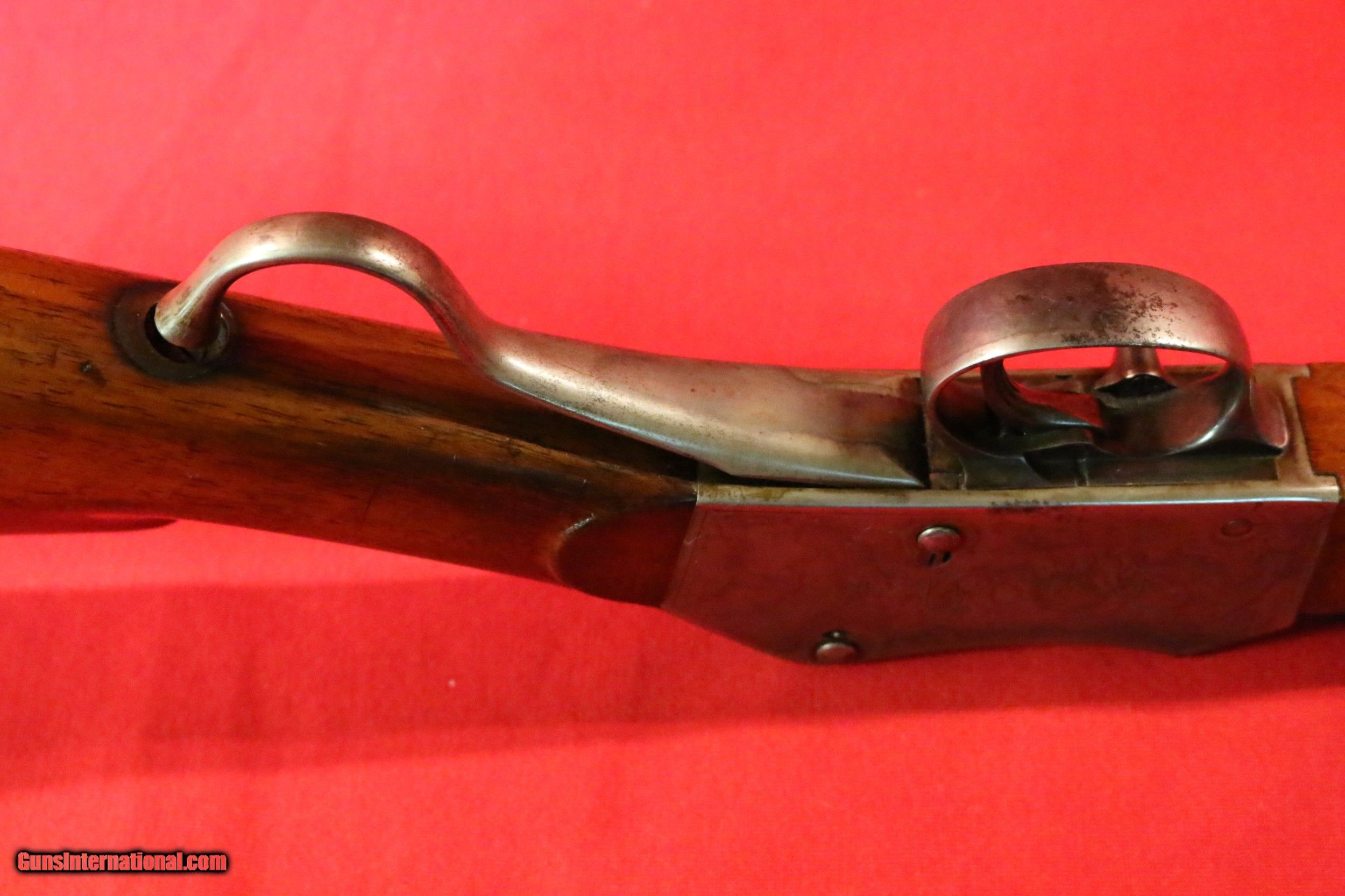 Description: Manufactured by Providence Tool Co in providence Rhode Island USA. S/N 404 matching on barrel, frame, and forend. The all original high condition Peabody-Martini action features very strong original finishes on the half octagon heavy weight 45-70 cal barrel, case color on the receiver which also features simple scraoll and border engraving. The wood finish appears original.The forend has a There is an area of pitting on the right side of the barrel near the muzzle as shown. Very good bore.Original pewter forend tip. Original butt plate. Globe hooded combination front sight. Rear ladder sight with no markings and has light engraving on the barrel at the front and back as shown. Cocking indicator, manual safety. Left side of the frame is marked "Kill Deer" right side of the frame carries Peabody and Martini pat's. Very rare in any condition and exceedingly uncommon is this high original condition. The barrel carries a smaller sized marking of 92 over the serial number. Antique. No Reserve Someone pointed out that the rear sight should be a sliding disc. They are available from Monata Vintage Arms we will credit thethe cost of a replacement sight SOLD Antique: Yes |