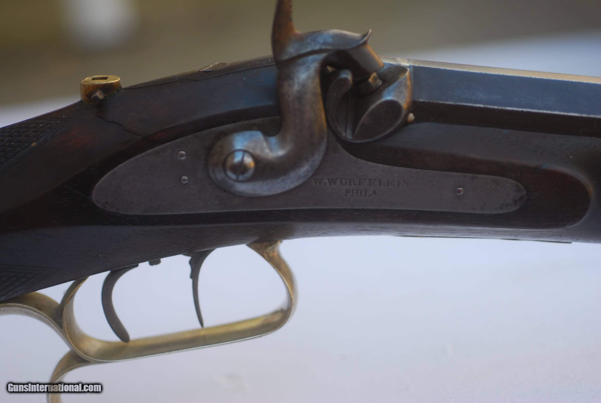 Description: W. WURFFLEIN PERCUSSION TARGET RIFLE. BARREL IS MARKED W WURFFLEIN PHILA STEEL. DOUBLE SET TRIGGERS AND PERCUSSION LOCK WORK PERFECTLY. BEAUTIFUL GERMAN SILVER TRIGGER GUARD AND FITTINGS. BARREL LENGTH IS 33 1/2 INCHES. SOLD Antique: Yes |