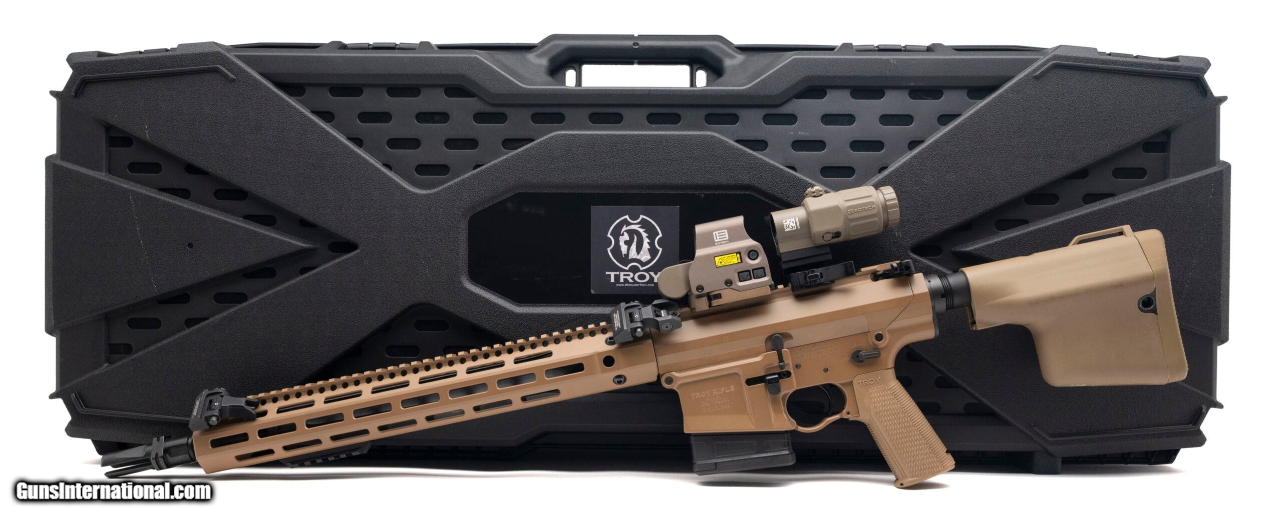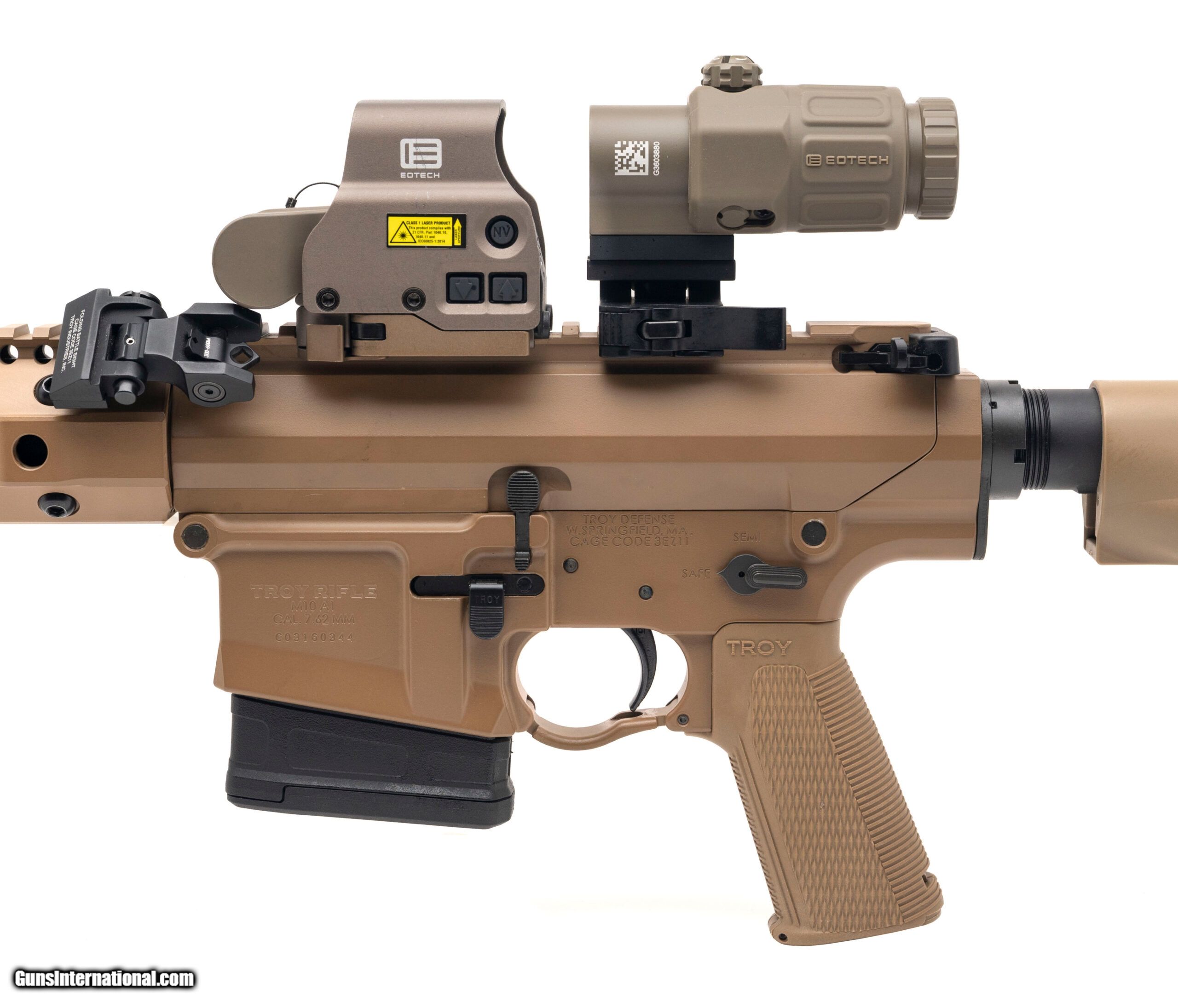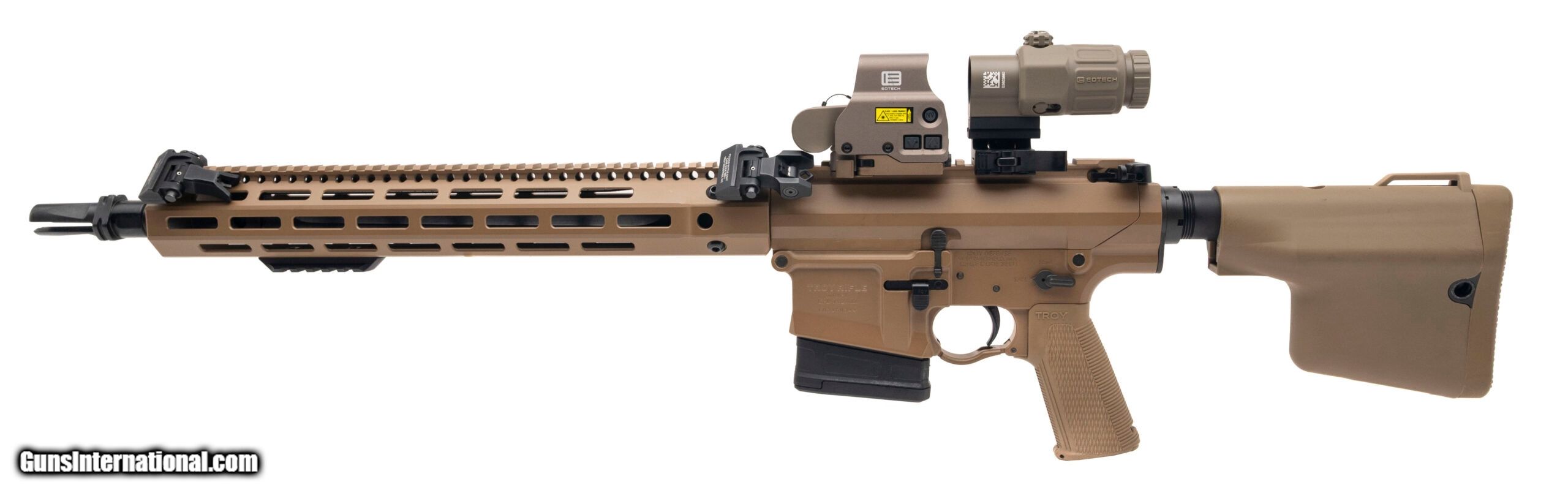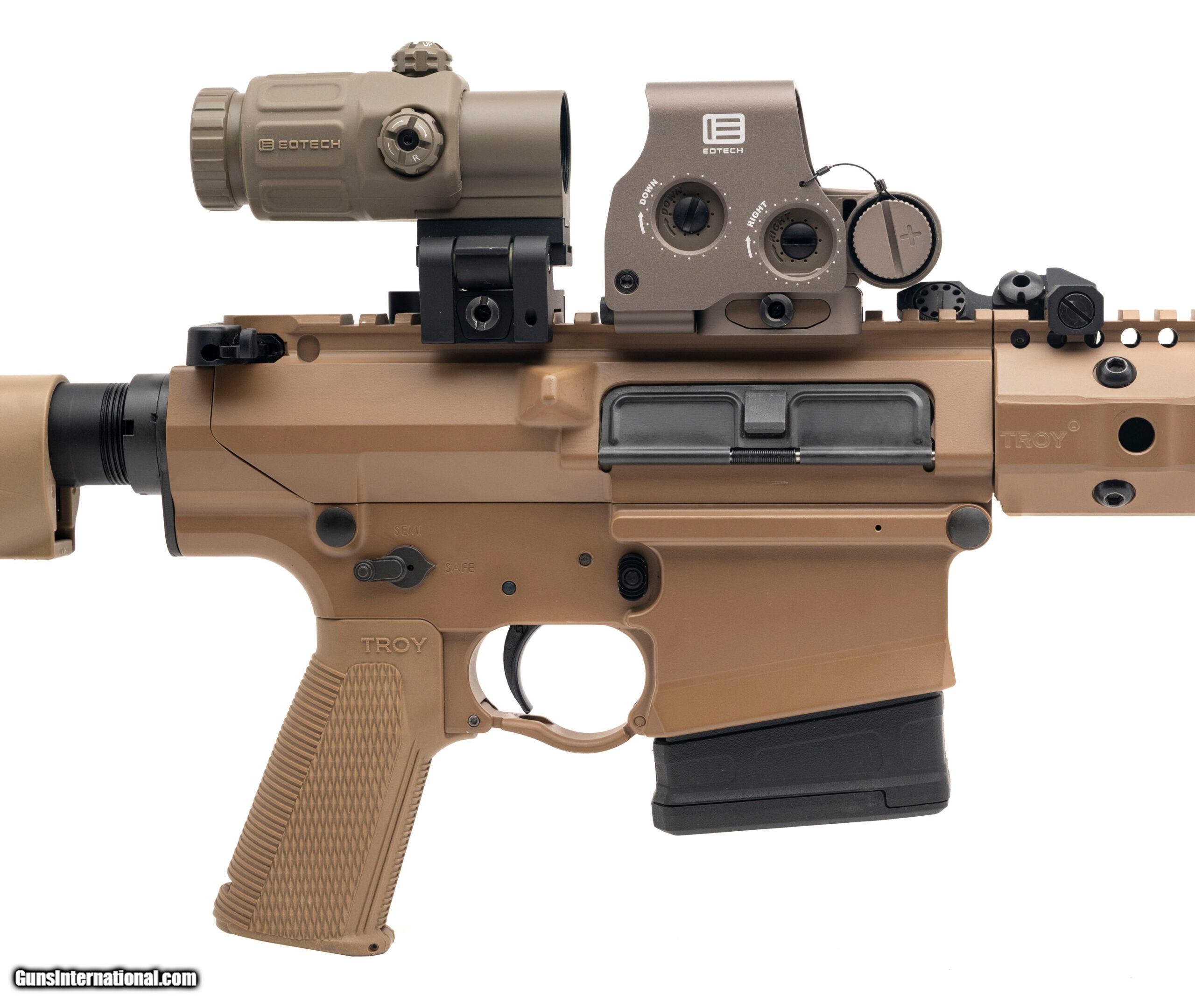 Description: "SN: C03160344. Modern production, 7.62 NATO with a 16"" barrel. Bore is bright with strong rifling. Semi-auto tactical rifle with an FDE Eotech EXPS 3.0 holographic weapon sight w/G36 magnifier combo, Troy flip-up sights w/45 degree offset, Geissele trigger, and FDE cerakote finish. Near excellent condition overall with case and sling. Price: $3,495.00 Contact Seller |