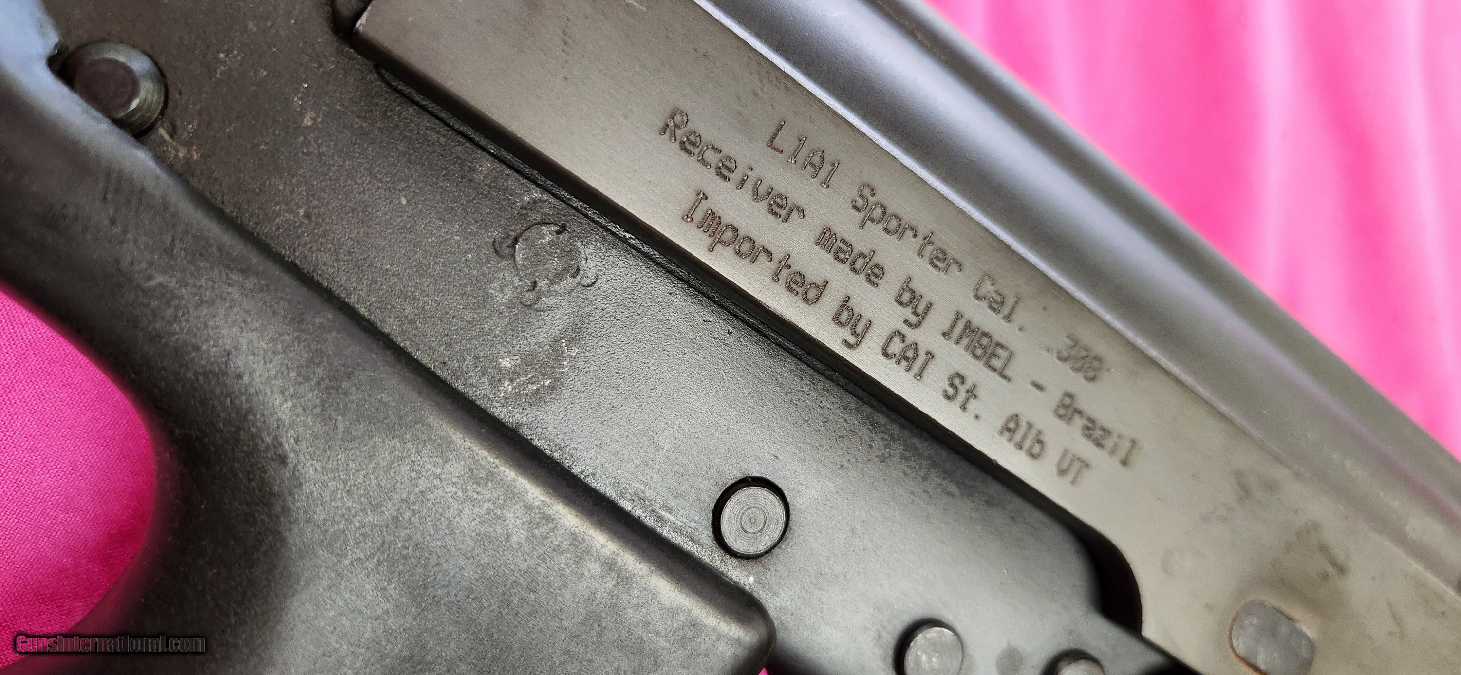 Description: IMBEL Brazil L1A1 Sporter 308. Imported by CAI. 20 1/2 inch barrel. Excellent overall condition, shows very littel use. Bore is perfect. 20 round magazine (one). $1150 includes shipping to FFL Only. E-MAIL PLEASE. SOLD Rifle Caliber: .308 Winchester Manufacturer: IMBEL Model: L1A1 Serial Number: A23873 Barrel Length: 20.5 INCH |