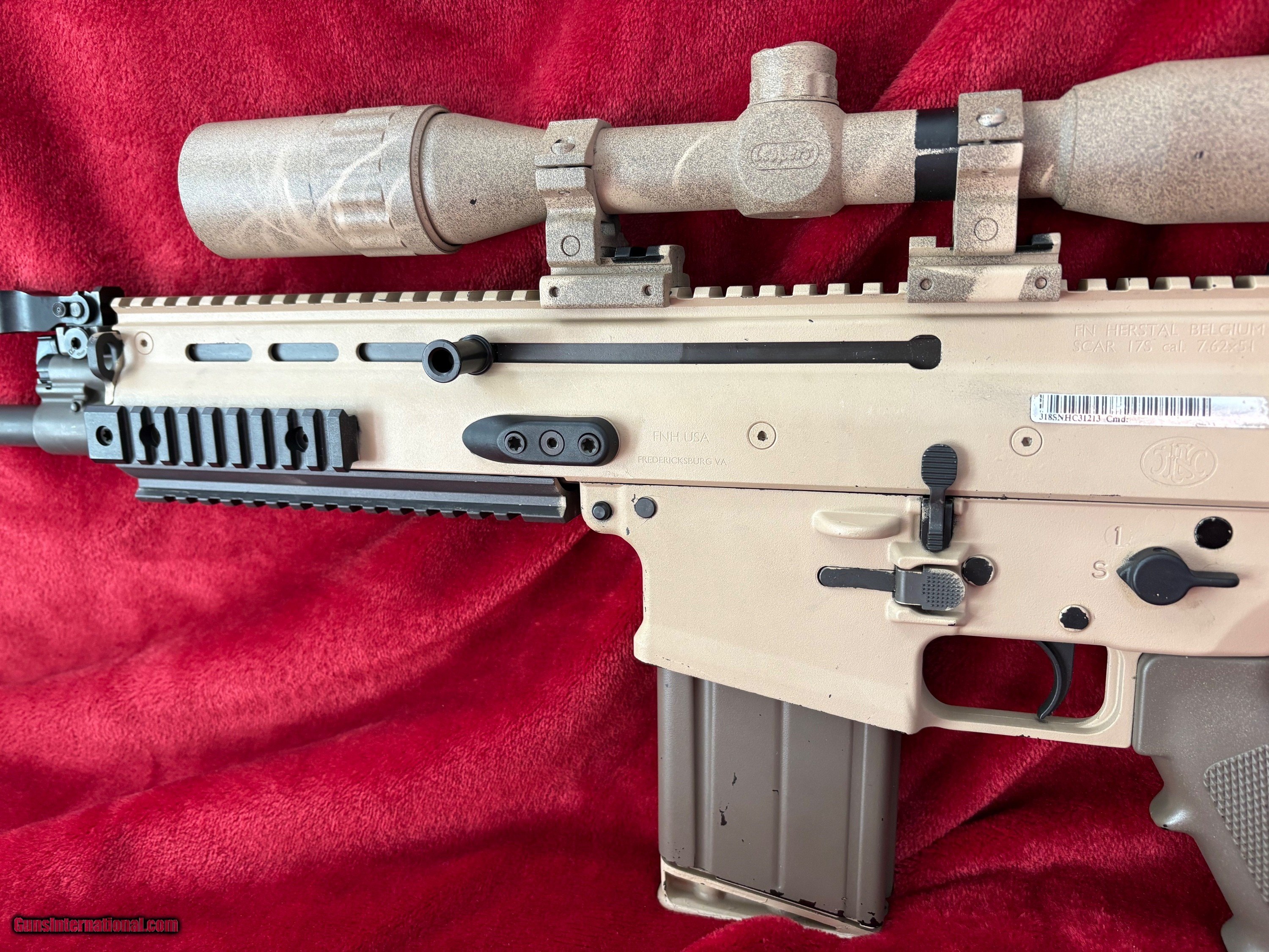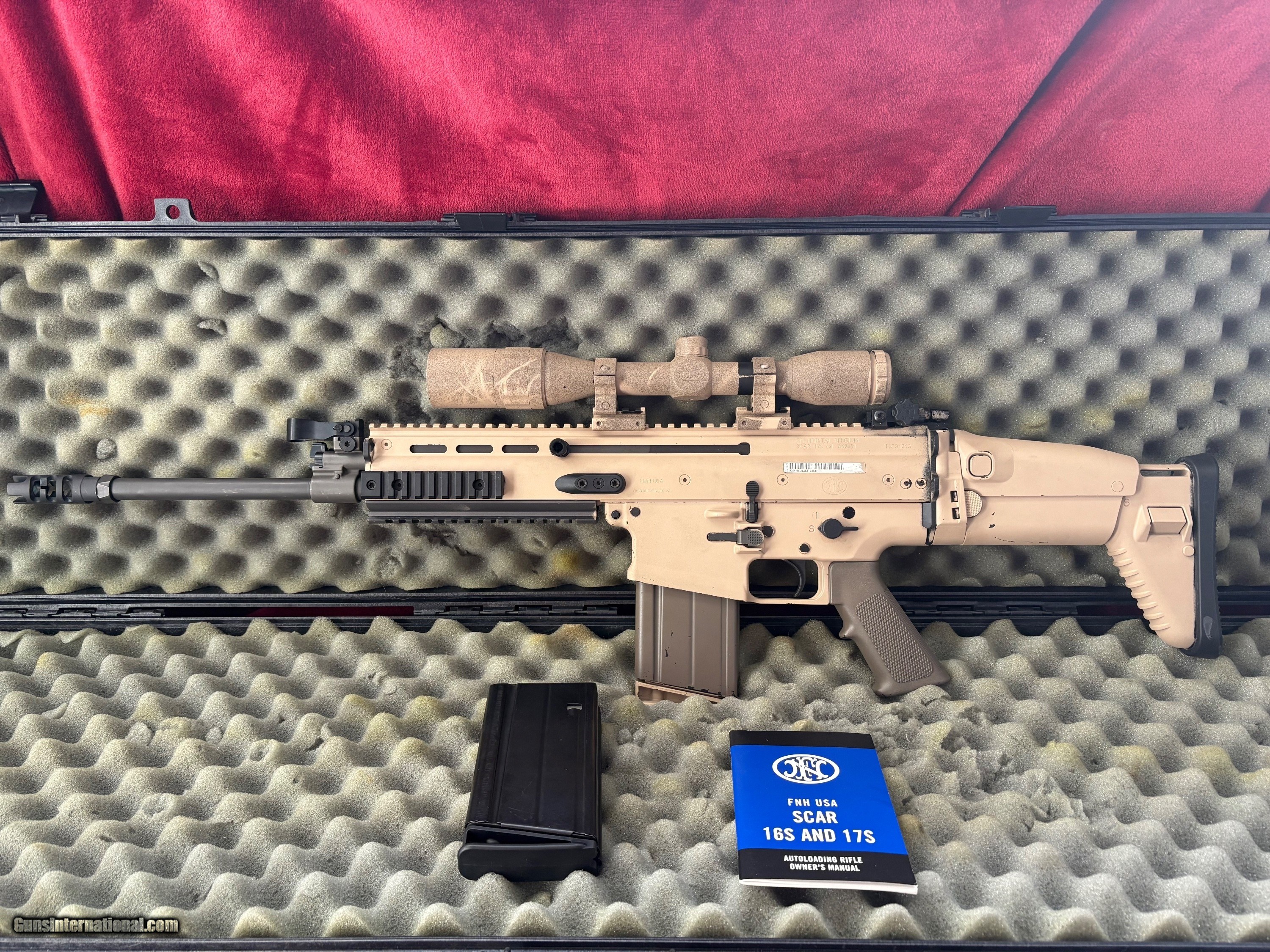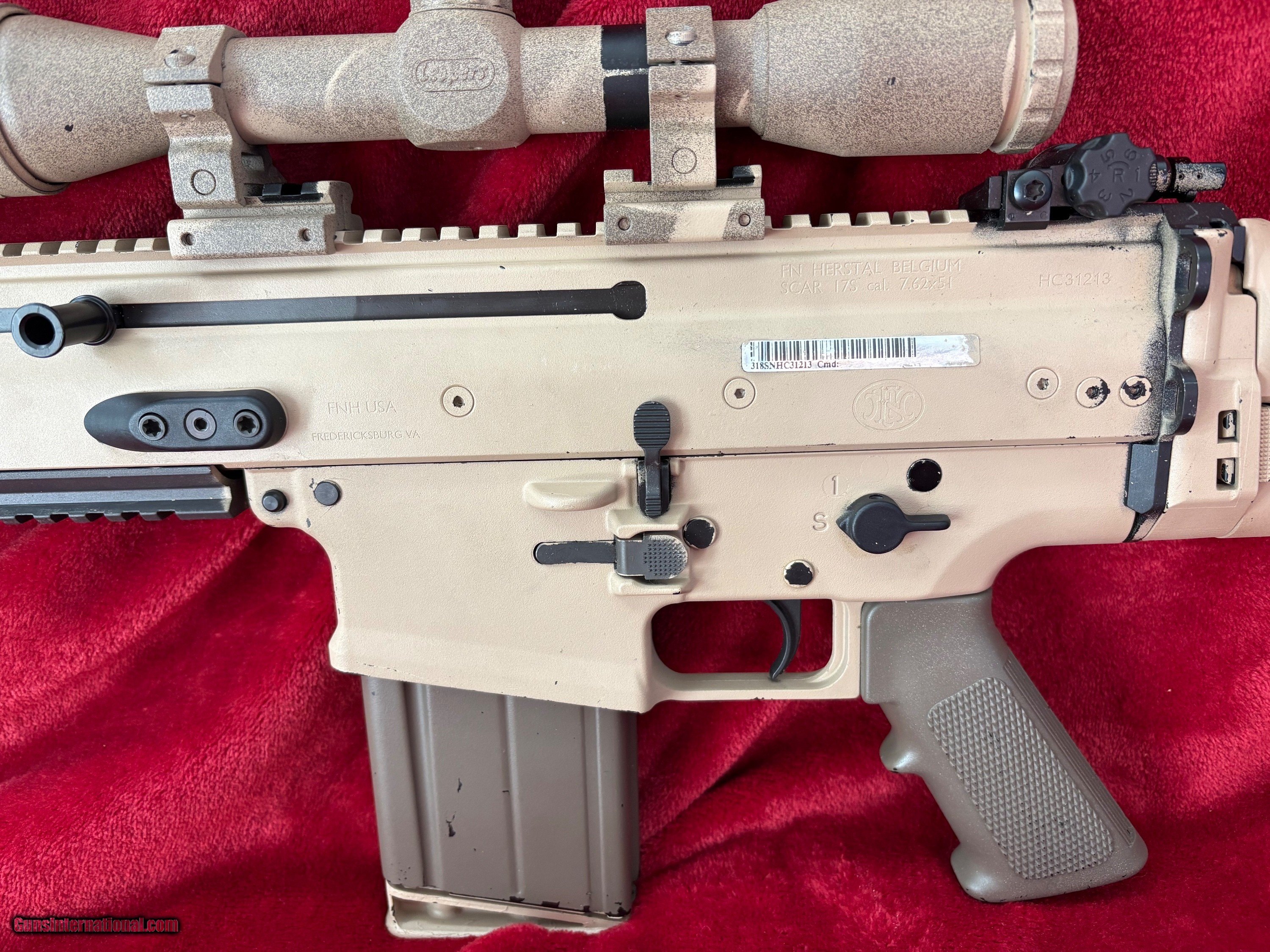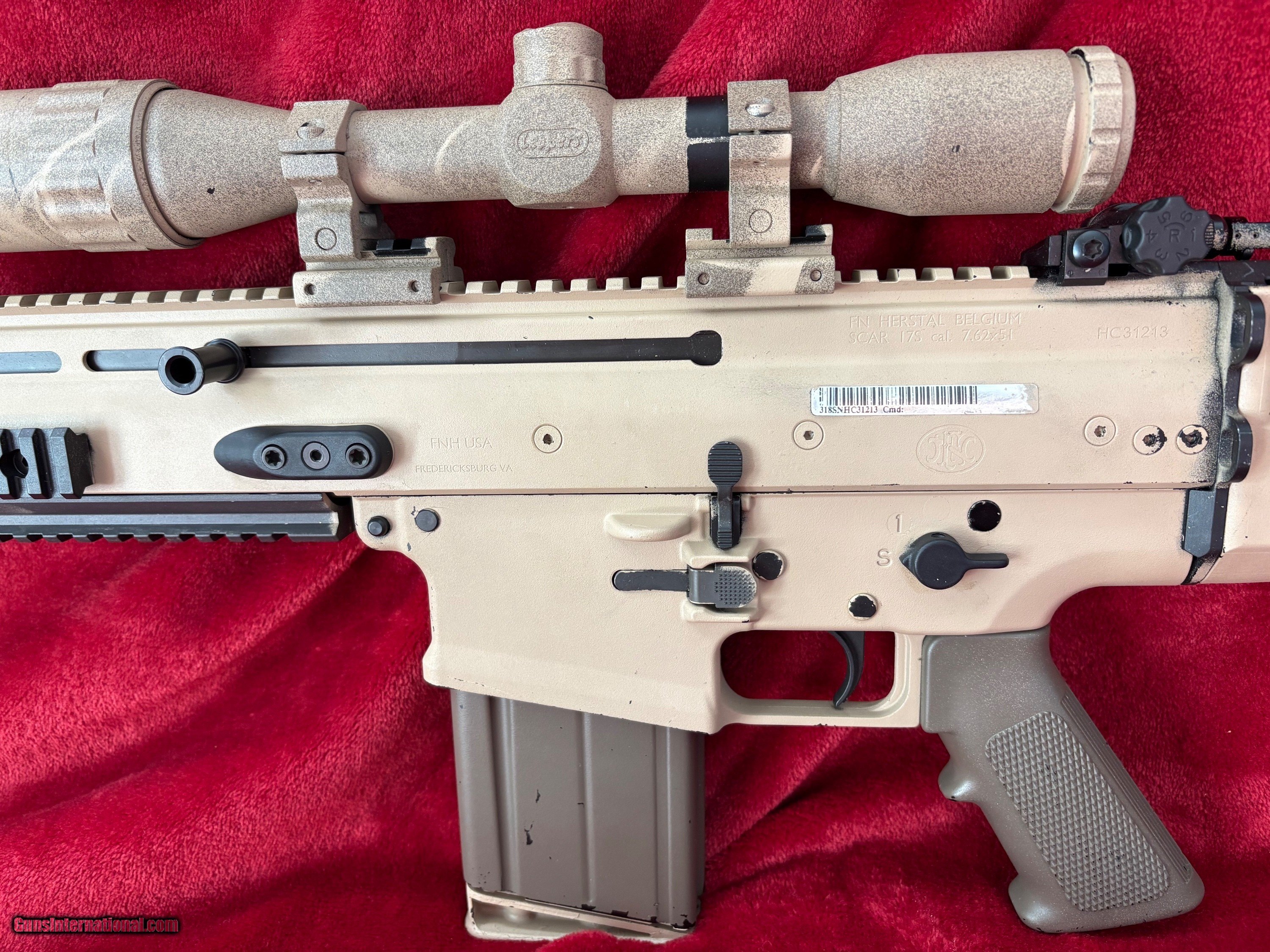 Description: This is an FN Scar 17 7.62x51/.308 that has less than 300 rounds through it. The rifle was originally black and then painted with the desert tan look. Some paint chips from use though it had minimal. All photos show its condition and the bore is 10/10. Mounted on the rifle is a 4/32 leapers scope great for range work well past 300 yards. I am a private seller and not a company. Rifle comes with two 20-round magazines as well as the original owners manual. Do not hesitate to reach out and ask any questions. You won't find a cheaper price! Please feel free to view any of my reviews from (username: nicardo8) SOLD Rifle Caliber: 7.62x51mm NATO |