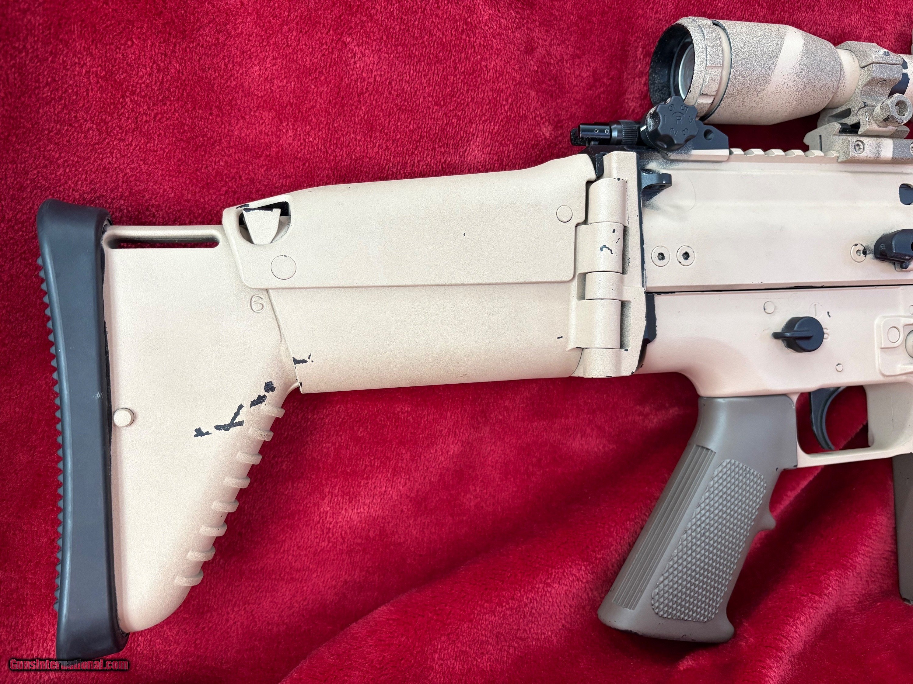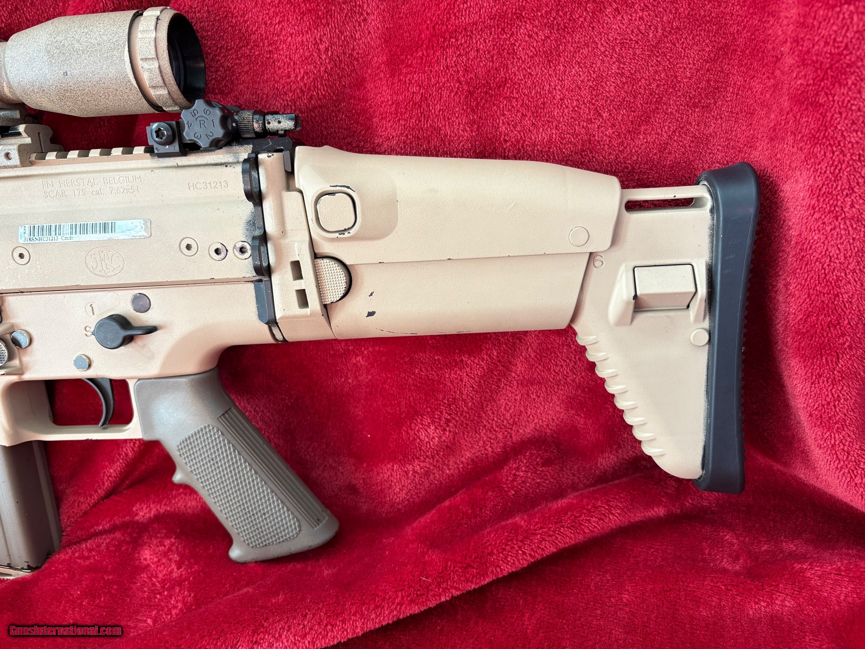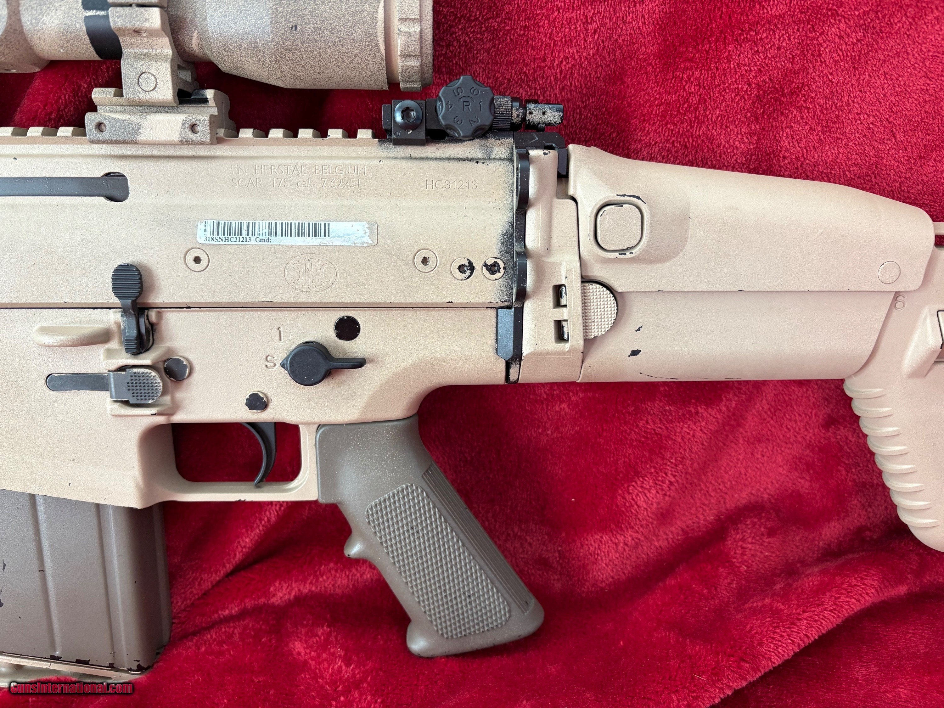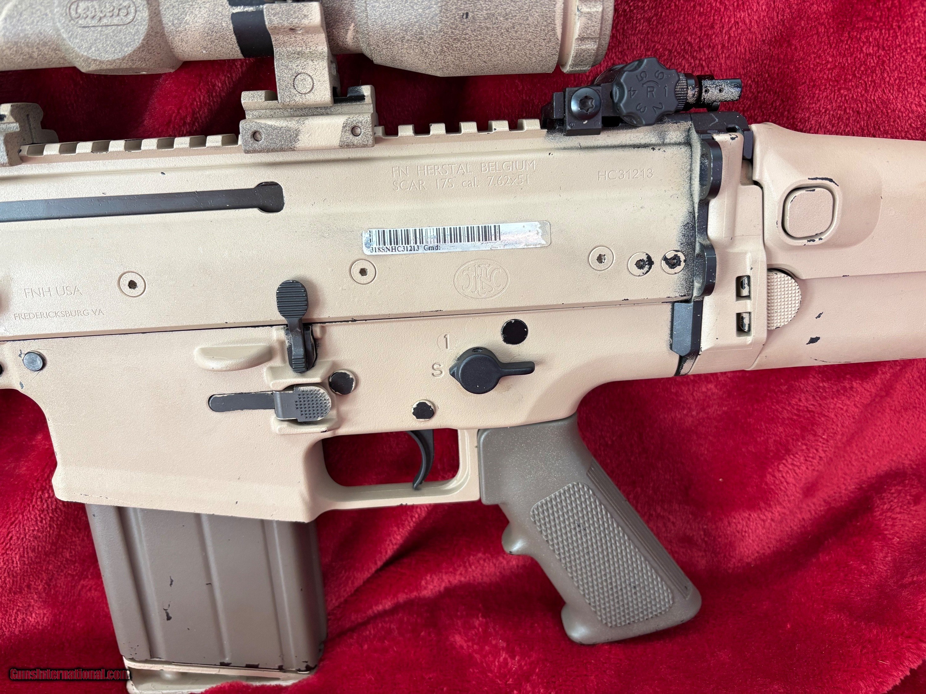 Description: This is an FN Scar 17 7.62x51/.308 that has less than 300 rounds through it. The rifle was originally black and then painted with the desert tan look. Some paint chips from use though it had minimal. All photos show its condition and the bore is 10/10. Mounted on the rifle is a 4/32 leapers scope great for range work well past 300 yards. I am a private seller and not a company. Rifle comes with two 20-round magazines as well as the original owners manual. Do not hesitate to reach out and ask any questions. You won't find a cheaper price! Please feel free to view any of my reviews from (username: nicardo8) SOLD Rifle Caliber: 7.62x51mm NATO |
