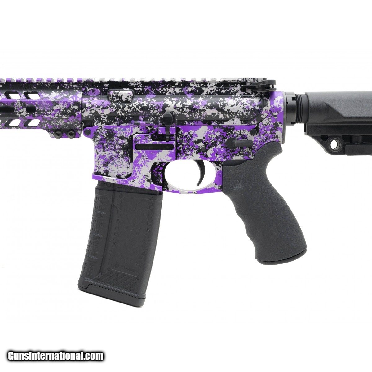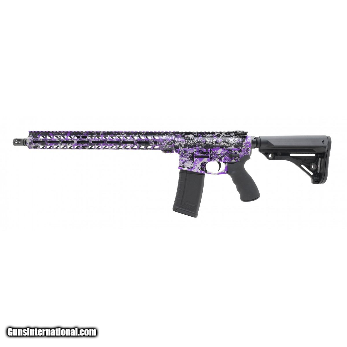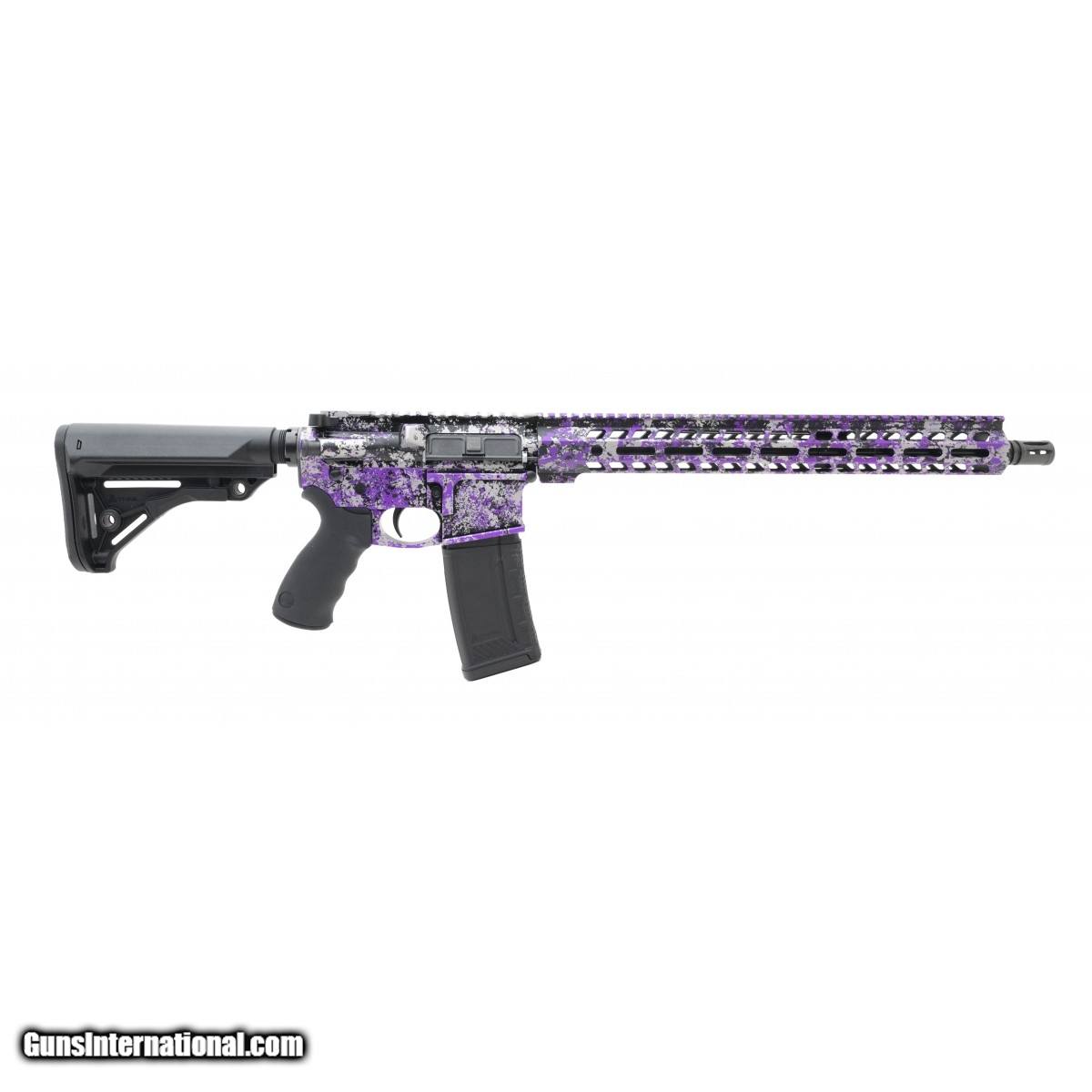 Special edition purple and grey splatter anodized finished Bird Dog rifle with flash hider, lightweight M-Lok handguard, Thril buttstock, and Ergo pistol grip. Come with magazine. New. UPC:23528Disclaimer: The anodization process is difficult to get consistent matching patterns. Therefore, there will be slight variations in anodized patterns from the display photos.