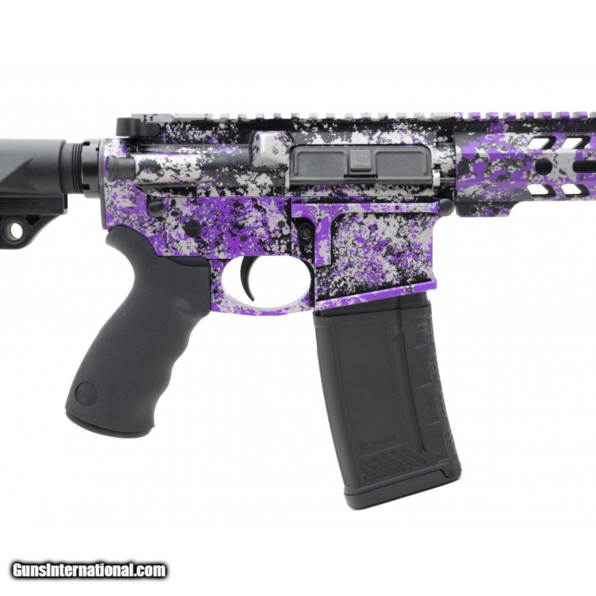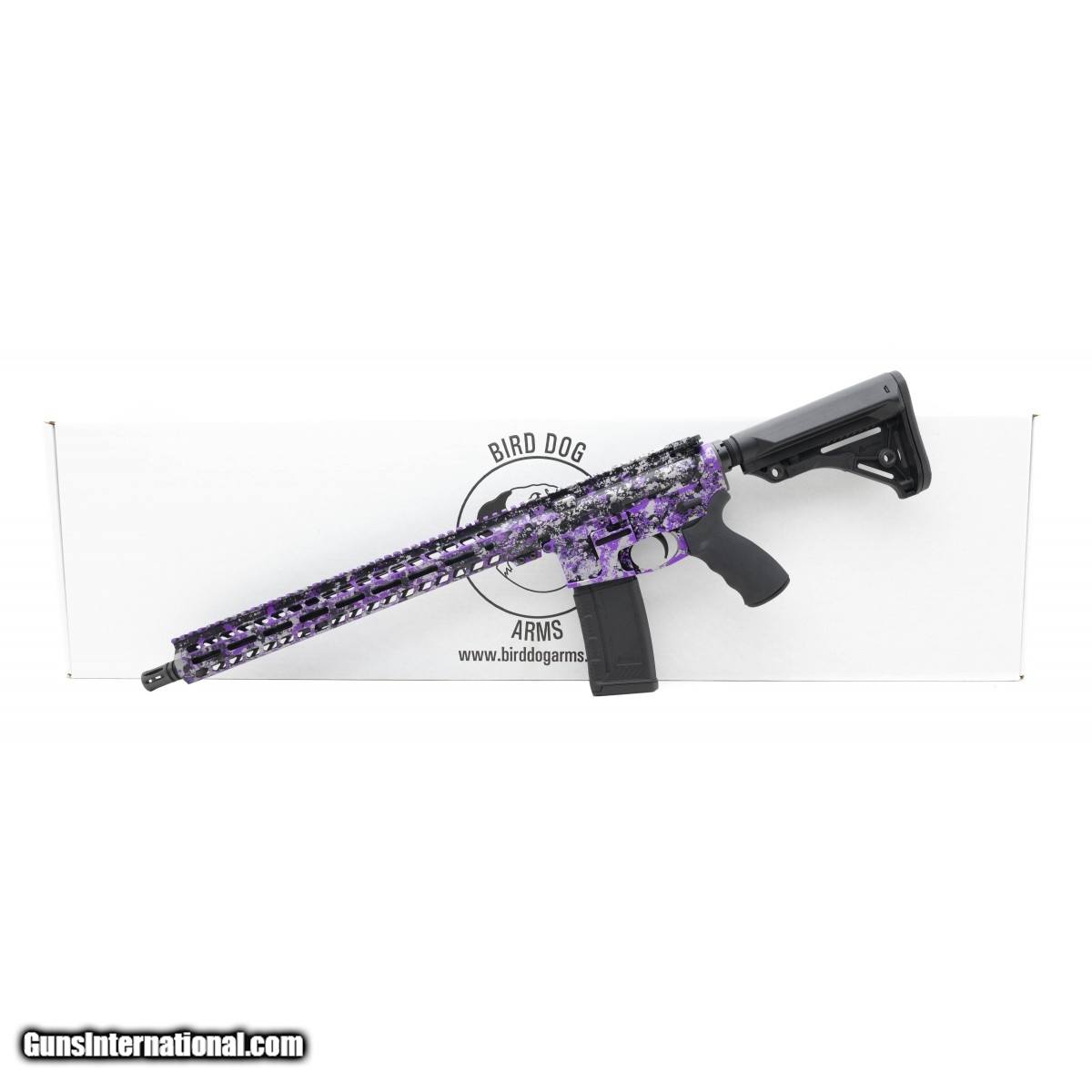Special edition purple and grey splatter anodized finished Bird Dog rifle with flash hider, lightweight M-Lok handguard, Thril buttstock, and Ergo pistol grip. Come with magazine. NEW. UPC:23528Disclaimer: The anodization process is difficult to get consistent matching patterns. Therefore, there will be slight variations in anodized patterns from the display photos.