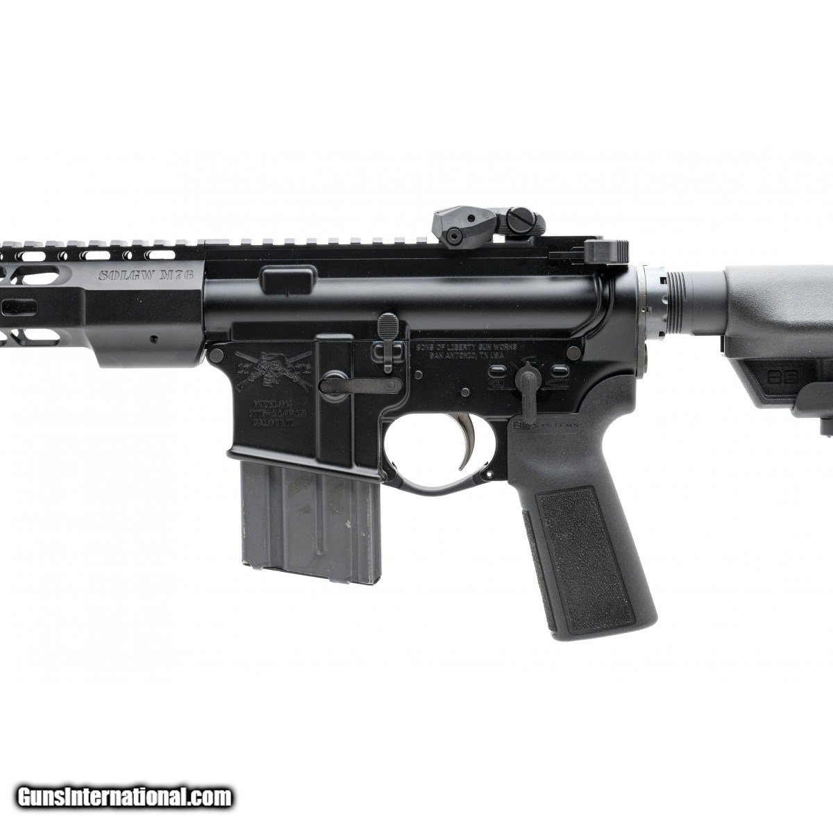 Description: " SN:1776-114819. Semi-automatic 16"" M4 made in San Antonio with an M-Lok handguard, B5 furniture, and a set of flip-up FAB Defense iron sights. In excellent condition. Comes in a range bag with a lifetime warranty, pocket constitution, lock, test cartridge, & SOLGW patch. SOLD |