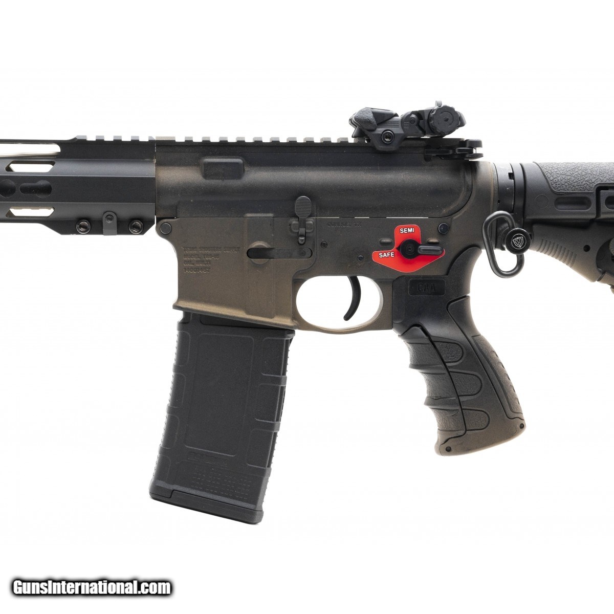 AR-15 with distressed bronze finish, forward blast can, freefloat rail, and Franklin Armory binary trigger. Very good condition.