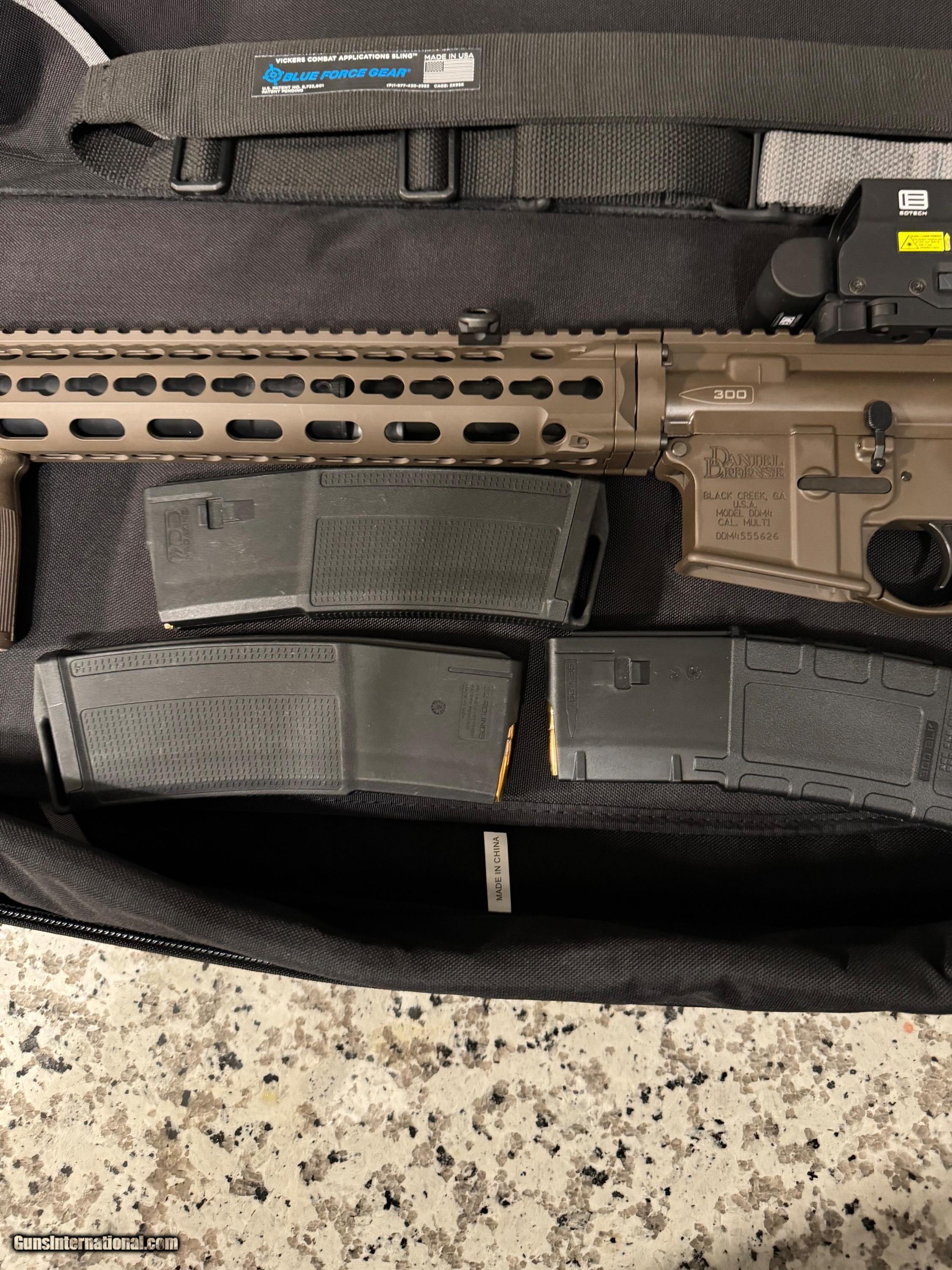 Description: NOTE: your purchase includes the eotech EXPS3 $789 Value and the premium Strap $90 as well as 3 30 shot mags! Bank certified check or bank wire. The DDM4|SR is our Integrally Suppressed AR15 style firearm optimized for the 300 Blackout cartridge. Built around a 9 inch Cold Hammer Forged barrel that is fluted along with a target crown and a standard pistol length gas system, this versatile, high-performance rifle is the complete package, accurately delivering both subsonic and supersonic projectiles downrange with unrelenting reliability. Because the suppressor is an integral part of the barrel, this firearm is ready for service right out of the box. There's no attaching a suppressor and wondering if it's mounted correctly and/or properly aligned. There's no re-zeroing for suppressed vs. unsuppressed fire. The DDM4|SR's integral suppressor extends the barrel to an NFA-required 16 inches in length, so this platform is not classified as a Short Barreled Rifle (SBR) and therefore only requires a single tax stamp (for the suppressor). The suppressor's lightweight outer tube is constructed of durable, heat-resistant metal alloys and coated with a protective high-temperature Cerakote-C finish, which is able of withstanding extreme temperatures and harsh environments. The suppressor is also user-serviceable, so its baffle core can be easily removed for periodic cleaning in order to maintain peak performance. The DDM4ISR comes standard with the MFR XL 15.0 handguard, which features a continuous 1913 Picatinny rail on its top, for the mounting of iron sights or optics, and Keymod attachment points on the sides and bottom. The independently ambi GRIP-N-RIP Charging Handle accommodates left- and right-handed shooters. This rifle also comes with the ergonomic Daniel Defense Buttstock and Pistol Grip. SOLD Rifle Caliber: .300 AAC Blackout Handgun Caliber: 4.6x30mm, .300 AAC Blackout Manufacturer: Daniel Defense Model: DDR M4 ISR Condition: New never fired |