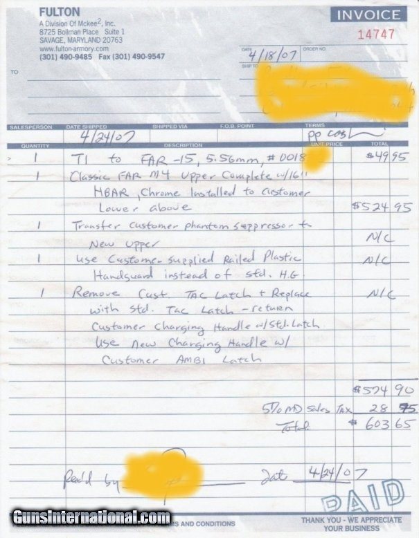Description: Condition: Excellent, a couple hundred rounds through it. Never a malfunction. BBL: 1:9, chrome bore, full HBAR, stated on receipt. Mods: Ambi charging handle, safety selector, and magazine release. ACT mil-spec trigger. Elzetta 1" light mount ( I keep the torch). ARMS rear flip buis, iron, not plastic. SOG butt pad. Bushnell AR Optics TRS-25 red dot w/UTG hi-riser. Will co-witness. NOTE: Fulton does not stake their gas screws; they Loc-Tite them. Never fail. Includes: Extra complete mil-spec carpenter steel bolt group and spare bolt. Extra mil-spec charging handle, Delta ring, spring/pin kit, firing pins,gas tubes, buffer springs, grip, etc. All original parts are included if you would like to retrofit. If you need more images or have any questions please email me. I will ship to your FFL via FedEX or UPS Ground, your choice, tracked and insured, after receiving his signed FFL copy and your MD driver's license. Price: $1,400.00 + $40.00 shipping. We can do cashier's check or USPS MO. I will ship after clearance. Cannot ship to: CA, WA, IL, NY, MA, CT, NJ, DE, MD, DC, HI. PS: I have a good variety of mags if you live in a free state. Thanks! Rifle Caliber: 5.56x45mm NATO Manufacturer: Fulton Armory Model: FAR15 Serial Number: 00** Barrel Length: 16 Condition: Excellent Metal Condition: Excellent Bore Condition: Perfect Barrel Type: Chrome lined heavy HBAR Manufacture Date: 2007 Extras: See description Item Location: SC Price: $1,400.00 Shipping: $40.00 Buy Now Contact Seller |