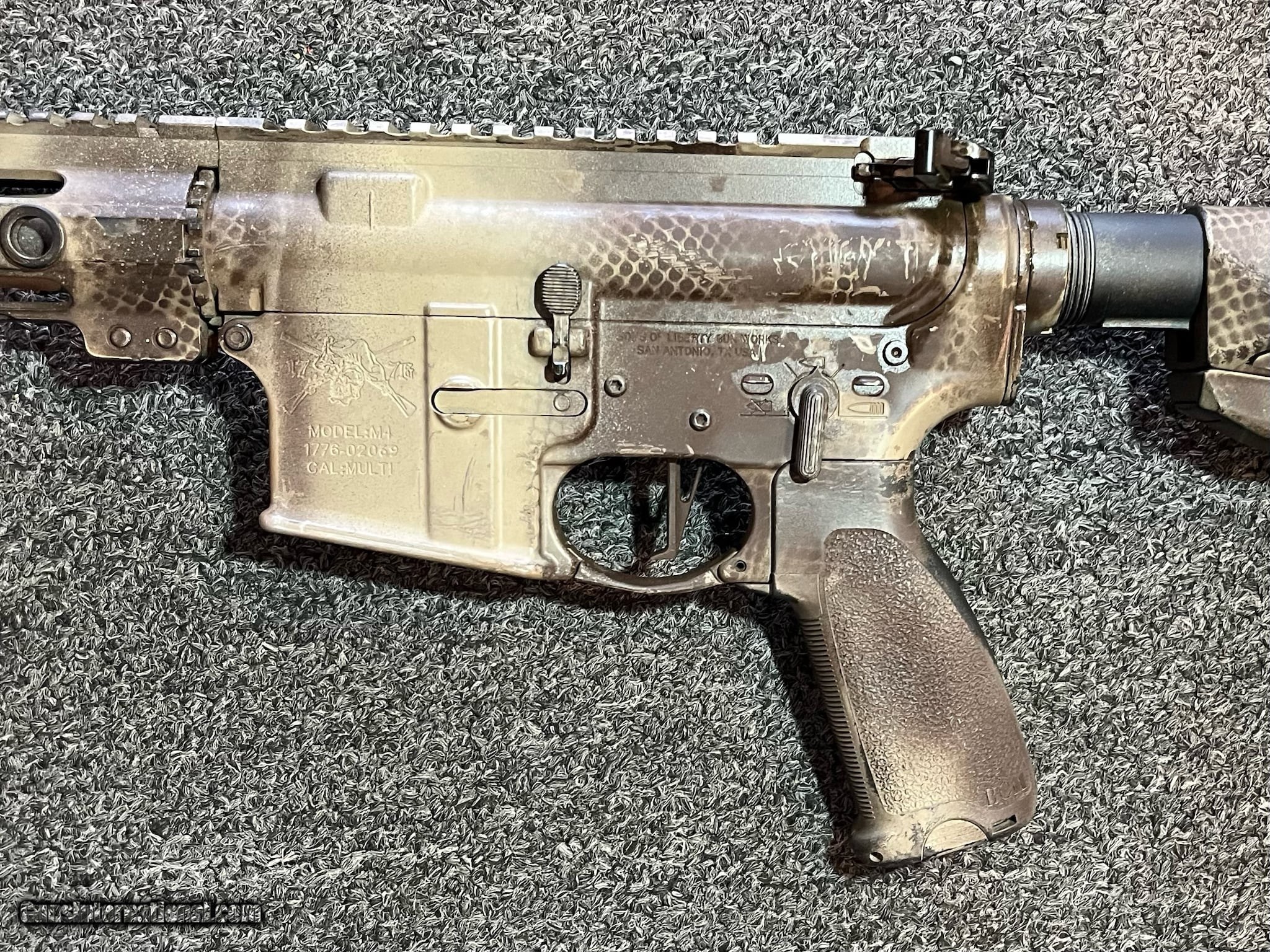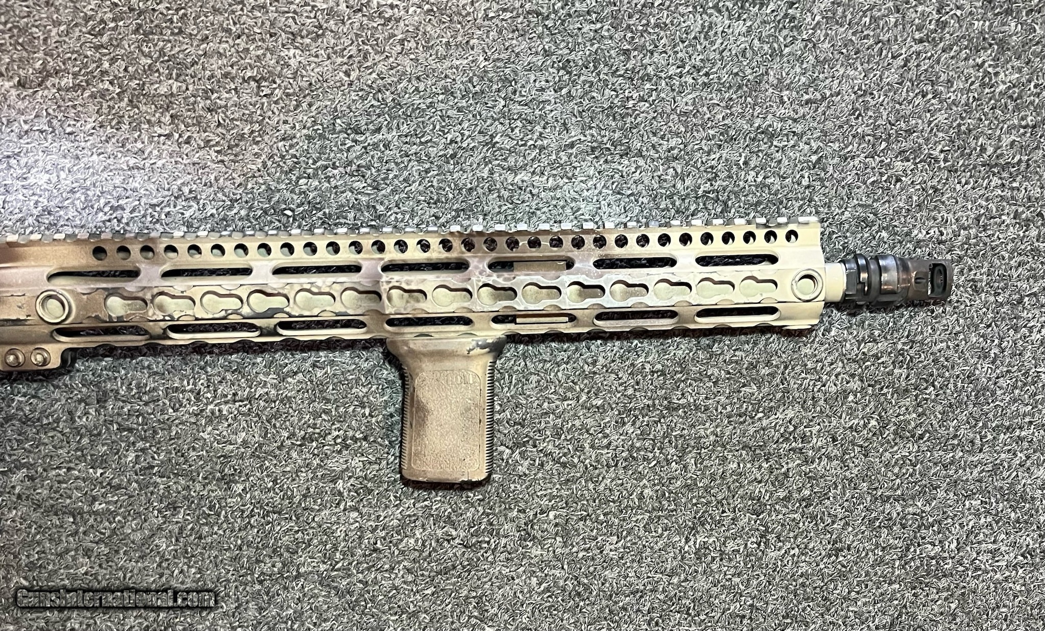Description: Guns Listing ID: 711479 Used Sons of Liberty Gun Works Build 16\" Wilson Combat Barrel mid length gas system and Bolt carrier group CMC single stage flat face trigger Midwest Industries Handguard Dead air Keymo micro brake BCM Stock, grip, foregrip, and Charging handle. 1-30 RD magazine. Finish is spray painted on. SOLD Manufacturer: SONS OF LIBERTY GUN WORKS Model: M4 Caliber Info: 5.56X45MM NATO Condition: Used - Non-Certified Barrels: 1.6 BARREL Finish: FDE |