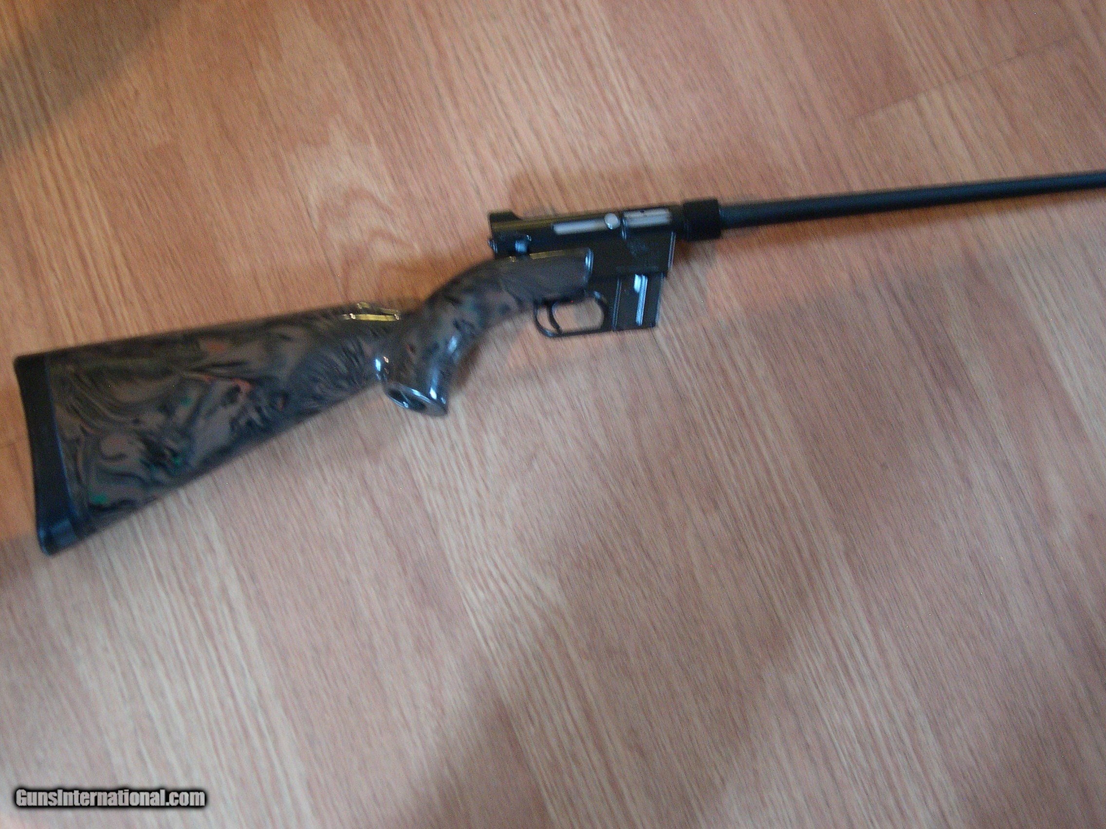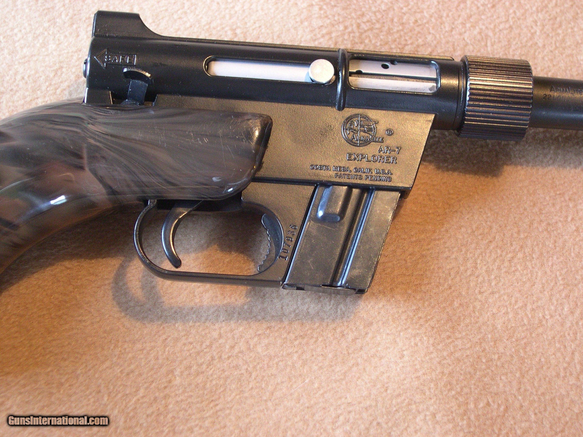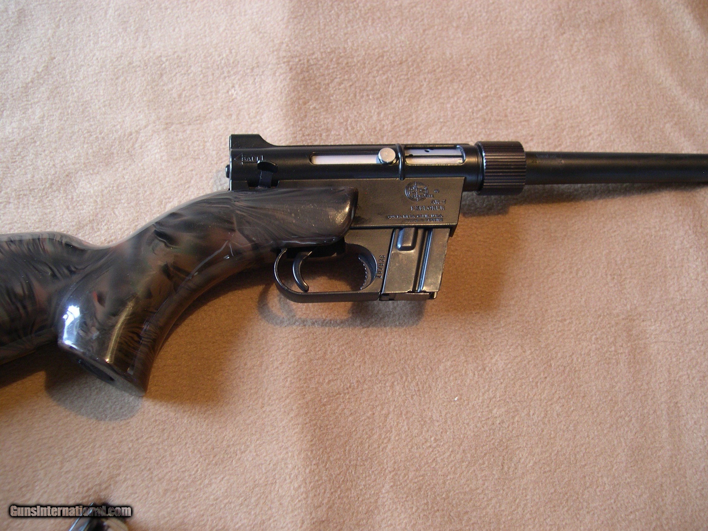 Description: Invented by Gene Stoner, this is the original AR-7 made in 59 to 73 by Armalite, this one in Brown - black camo pattern, Near mint original condition, I have had it for over ten years, never fired it, They do not come any better than this one, absolutely no cracks or dents anywhgere on gun, hard to get better !! An important collector for Stoner collectors, I would think !! SOLD |