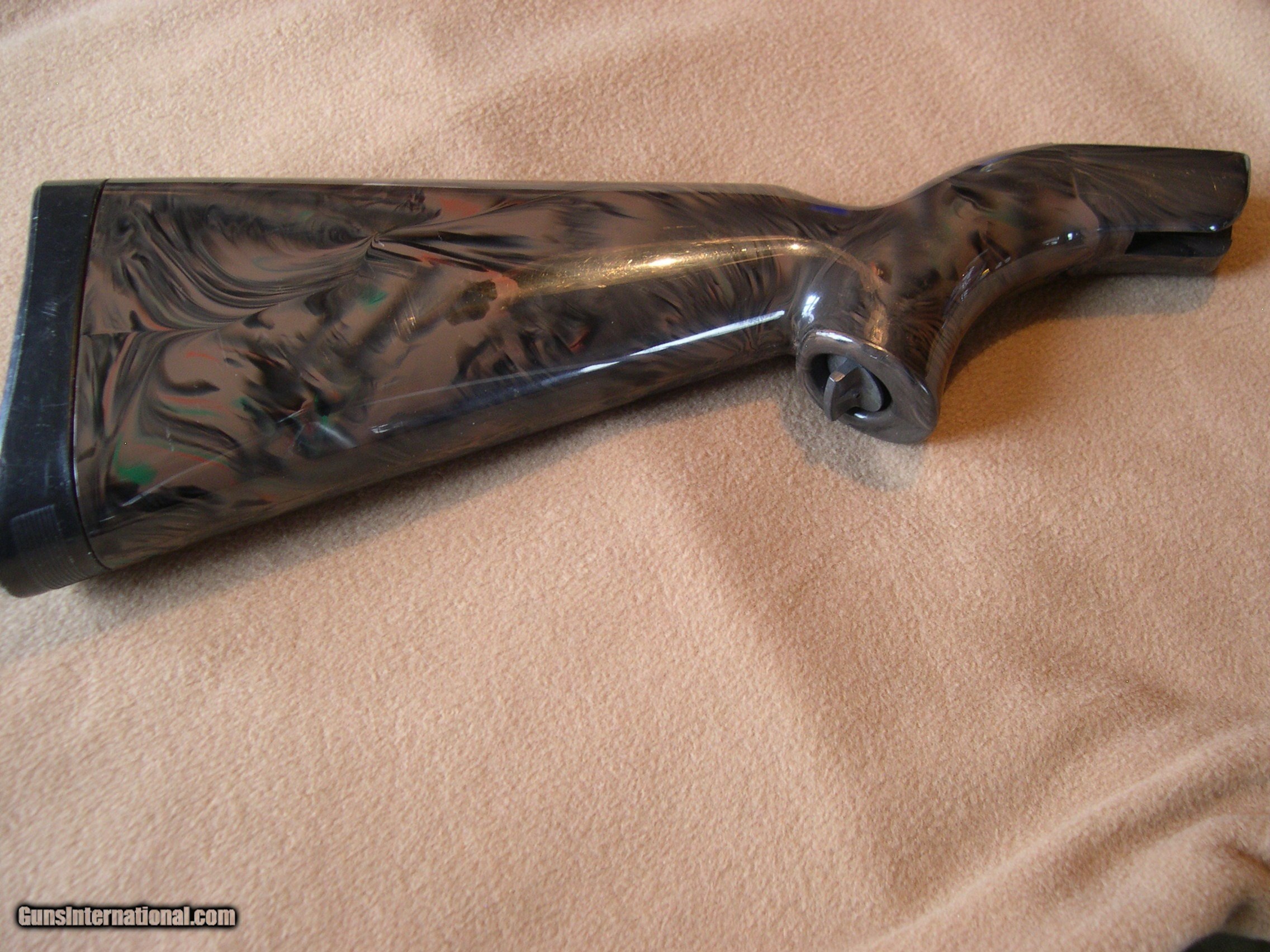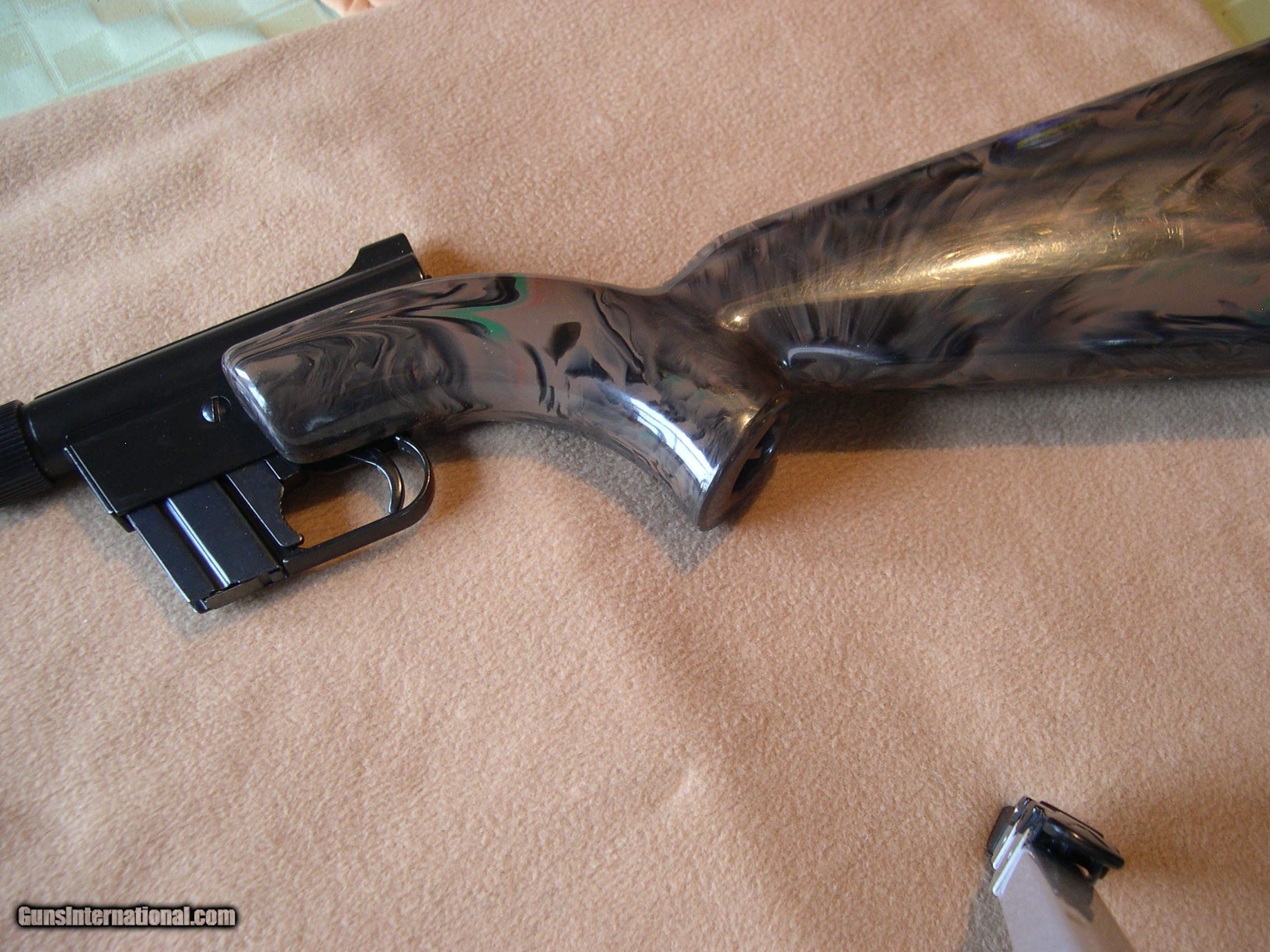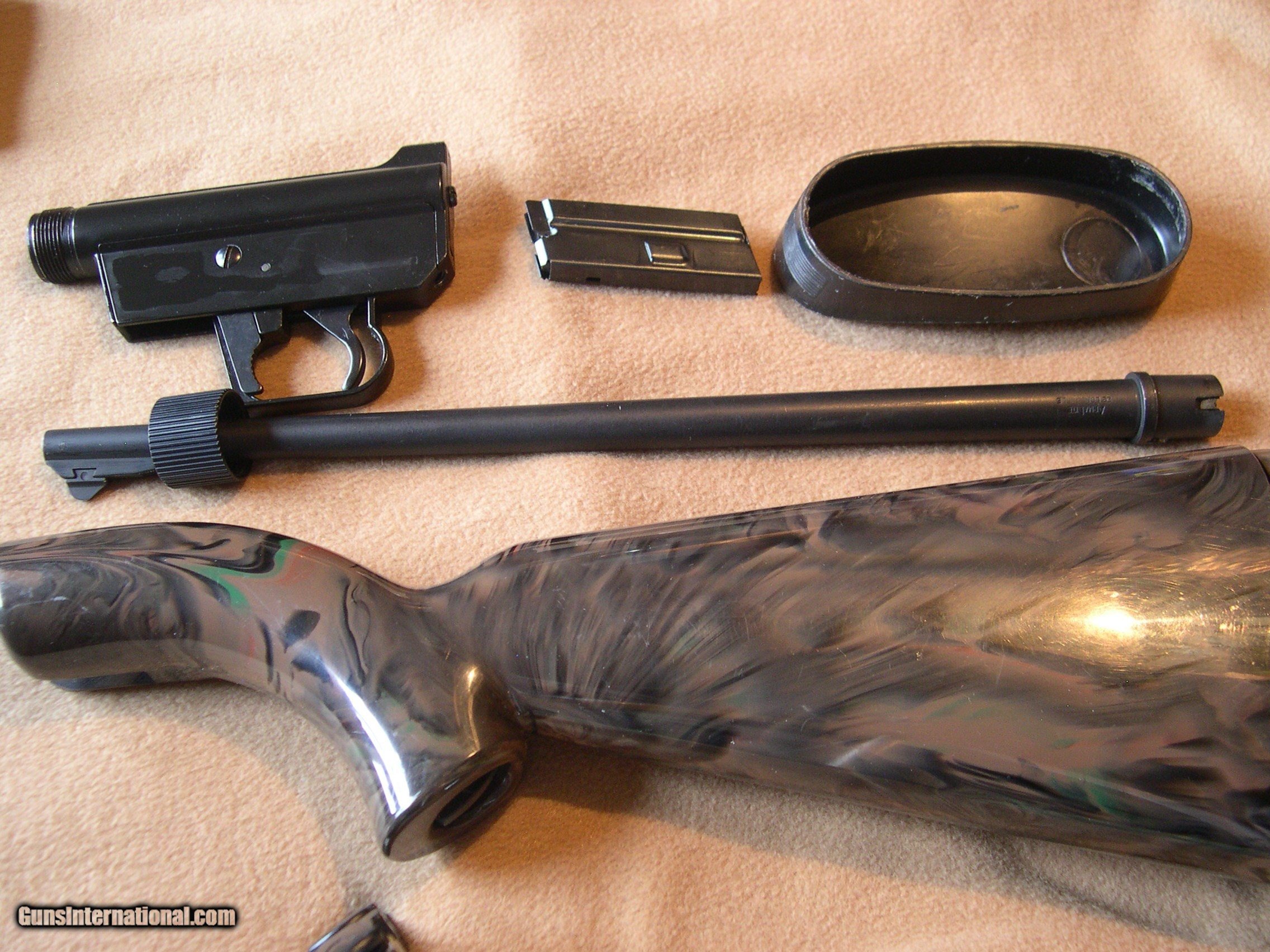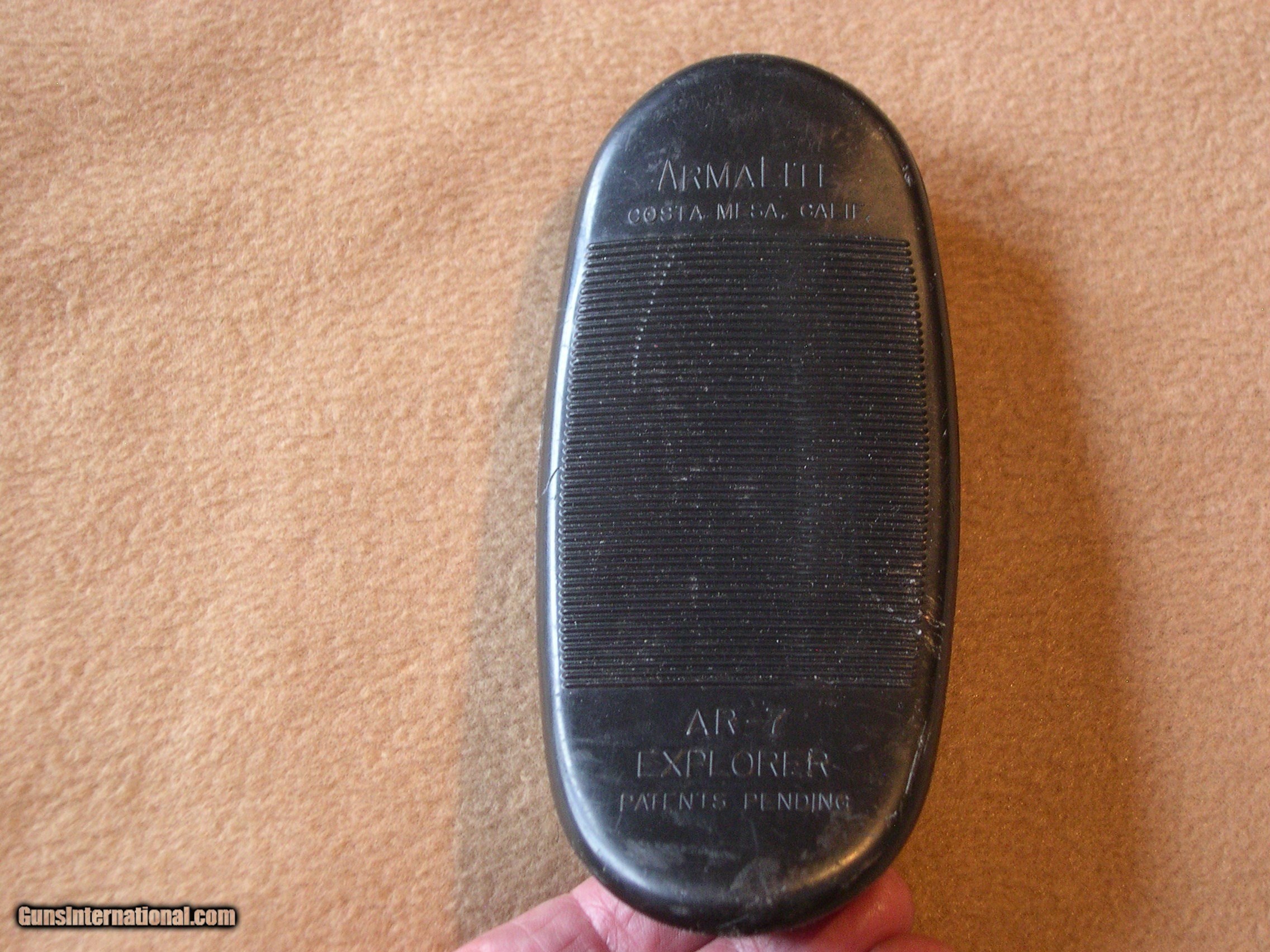 Description: Invented by Gene Stoner, this is the original AR-7 made in 59 to 73 by Armalite, this one in Brown - black camo pattern, Near mint original condition, I have had it for over ten years, never fired it, They do not come any better than this one, absolutely no cracks or dents anywhgere on gun, hard to get better !! An important collector for Stoner collectors, I would think !! SOLD |
