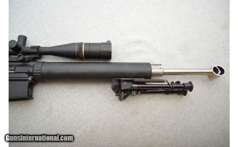 Description: Great shape overall. Metal and furniture have some light handling marks but none are worthy of individual note. Comes with the scope, bipod, and a single magazine. 7.62mm SOLD Chambers: Semiautomatic fed from detachable magazines. Metal Condition: Very good. Wood Condition: Furniture is in excellent condition. Bore Condition: Excellent with bright shine and sharp rifling. Barrels: 20" Heavy profile stainless steel with JP Enterprises Recoil Eliminator. Triggers: Matte black with smooth surface. Stock Dimensions: Fixed A2 style with 14½" LOP. Fore End: Free float carbon fiber hand guard. Butt Pad: Textured black plastic plate integrated into the stock. Weight: 13lbs Sights: No iron sights. Comes with a Leupold Vari-X III 6.5-20x scope in an Armalite 1" cantilever mount. Chokes: N/A Item Location: Green Bay |