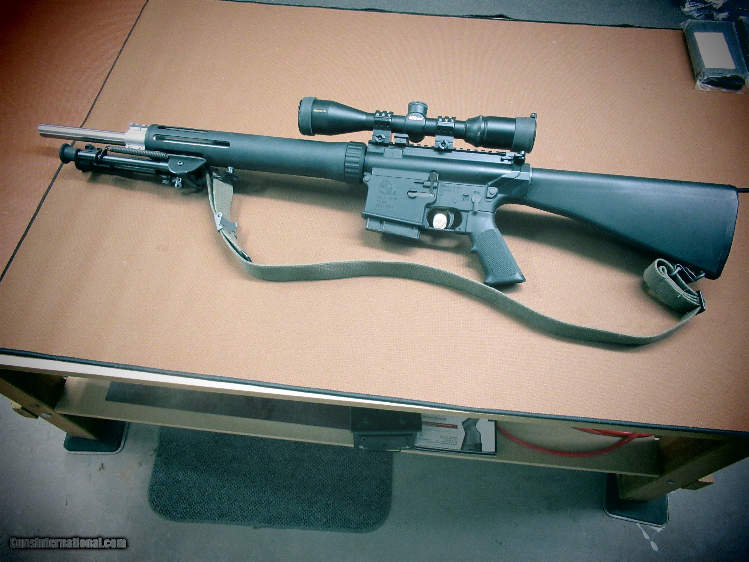 Description: This AR-10B Target features a triple lapped stainless steel match grade heavy bull barrel. Forged flat to reciever, a National Match two stage trigger, a Picatinney gas block, free floatng aluminum handguard that attaches to only to the reciever and does not put an stress of the barrel. Build quality is 100%, super tight fit between upper and lower (no shimmy shake). Wt. is 10.3 lbs (before scope,bipod,sling). Extra's include a Nikon Monarch 2.5X10 mil-dot scope with Bushwacker Lens caps, Harris bipod, 1 3/4" cotton sling, 2-10 rd. magazines, 6-.20 rd. magazines. Please note these are the newer Armalight magazines and not the older ones that were some what problamatic. This set-up is a true joy to shoot! Excellent trigger control, clear camera quality optics, smooth feeding, producing 3/4 to 1' groups--the limit being this shooter , not the rifle. Again, low round count (40-60), with proper break in procedure. I am the orginal owner. I am sorry, no sales to Ca. or New York city. Buyer is responsible for knowing the ownership legality in their state. I will ship to an FFL of your choice. Buyer pays actual shipping. SOLD Rifle Caliber: .308 Winchester Manufacturer: Armalite Model: AR-10B Target Barrel Length: 20 Condition: Excellent |
