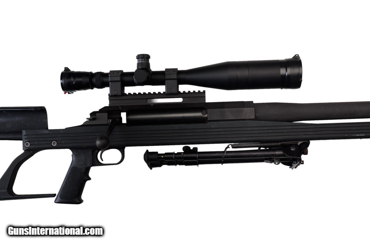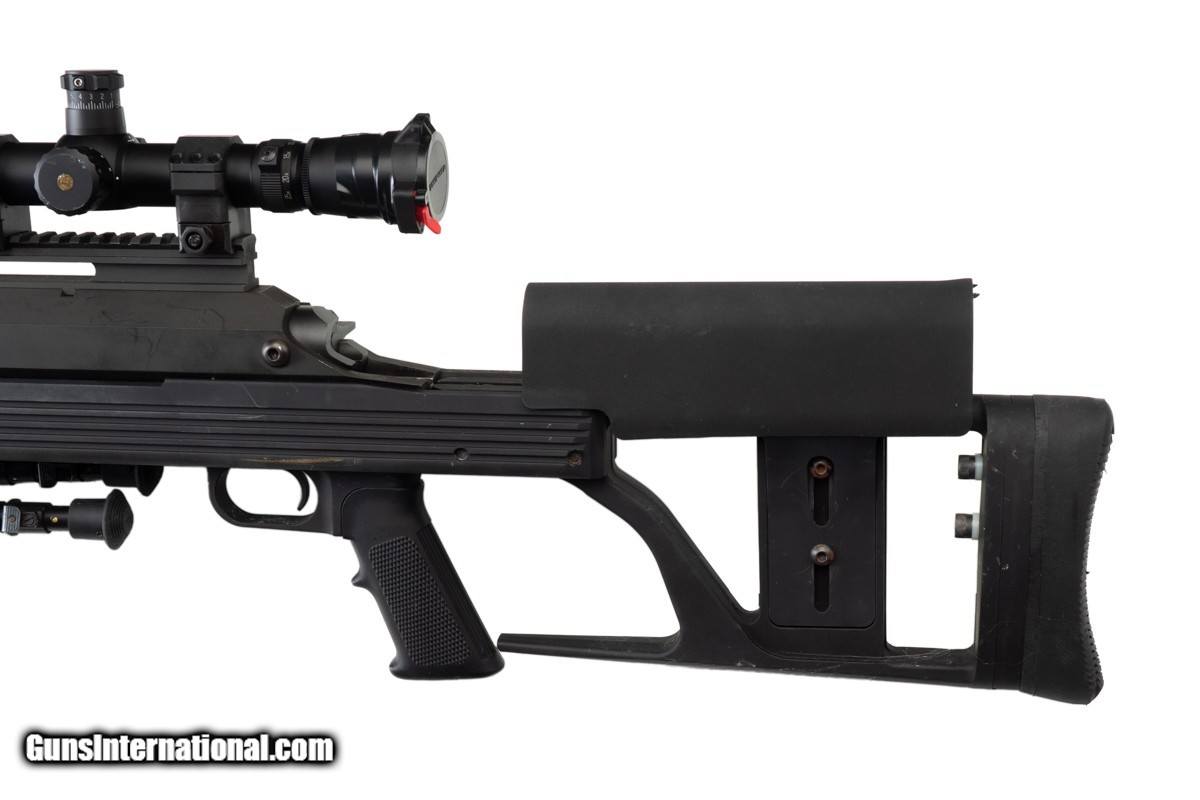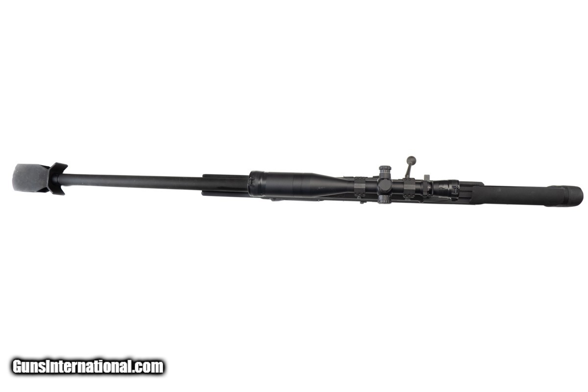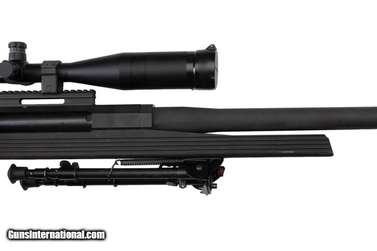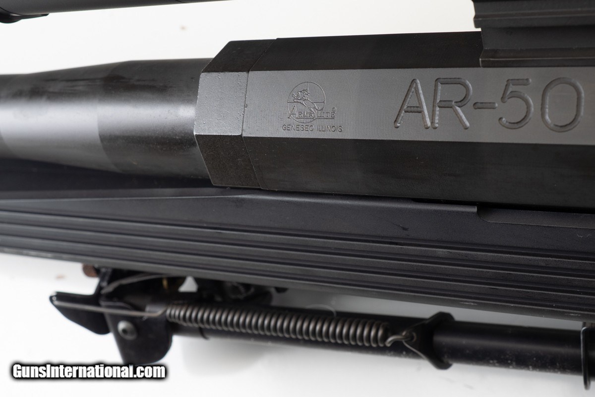 Description: 30" BARREL, MUZZLE BREAK, LEUPOLD MARK 4 8.5-25x50MM LR/T M1 SCOPE, PISTOL HAND GRIP, 15" LOP, RECOIL PAD, 37 LBS 3 OZ WITH SCOPE/MOUNTS The ArmaLite AR-50 A1 is a single shot bolt action rifle chambered in .50 BMG. The rifle features a unique octagonal receiver and utilizes ArmaLite’s proprietary V-Channel Chassis. Designed for the challenges of long-range shooting, the AR-50A1 is exceptionally accurate and highly effective with a large muzzle brake. The heart of the rifle is its metallic stock-to-action interface. The patented V-Lock™ Bedding Wedge and V-Block Stock assure absolute strength and repeatability for superb accuracy. The aluminum stock reinforces the receiver like a bench-rest sleeve. It’s not just the bedding that improves accuracy. Independent testing has proven the AR-50A1 muzzle brake to be the best in the industry for both recoil control and accuracy. It scrapes away turbulent muzzle gasses and lets the bullet break into clean air for amazing accuracy. This example is fitted with a Leupold Mark 4 8.5-25x50mm LR/T M1 rifle scope.