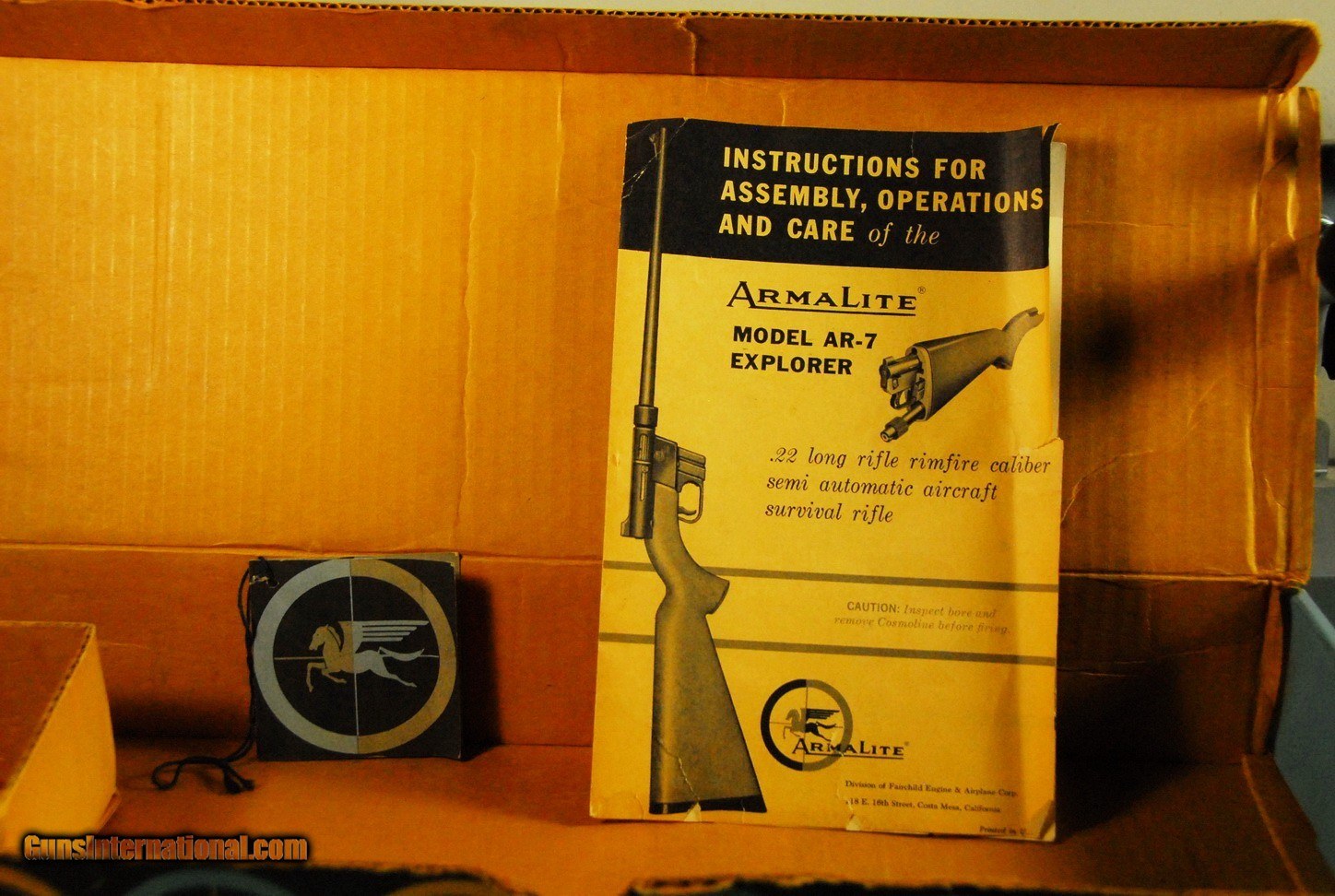 Description: EARLY - ORIGINAL ARMALITE AR-7 EXPLORER Costa Mesa, CA With box and “manual” Mfr: ARMALITE Model: EXPLORER Grips: PLASTIC Calibre: .22 LR Capacity: 8 rounds SN: 50311 Shipping Is $40 in the lower 48 only This is an EARLY ORIGINAL piece which is marked Patent Pending, before granting of the patent – this early piece uses the steel lined aluminum barrel and has been very lightly used. The original box and “instructions” (see photo) are included – box is a bit shopworn (see pix) but is solid. The Armaite AR-7 Explorer is a semi-automatic blowback operated firearm in .22 Long Rifle caliber and was developed by Gene Stoner in 1959 from the AR-5 that was adopted by the U.S. Air Force as a pilot and aircrew survival weapon.[1] The AR-7 was adopted and modified by the Israeli Air Force as an aircrew survival weapon in the 1980s. This piece has a honey brown plastic stock and of course floats (though we didn’t test that capability with this particular piece) – this item has the original magazine. The steel bolt uses dual recoil springs that are heavy compared to most other .22 semiautomatics and the AR-7 requires high velocity ammunition for reliable functioning. 40 grain round nose bullets in high velocity loadings were recommended by the manufacturer - you can manually load a single round into the firing chamber, allowing use of flat nosed bullets or low velocity or subsonic ammunition. ArmaLite sold the design to Charter Arms in 1973 (1973-1990) and the gun is now produced by Henry Repeating Arms (1997-present) - several other iterations occurred between Charter and Henry. We DO combine shipping if you see something else you might like) - we can hold for a bit before shipping in case you can find some of our other items for combined shipping rather than have to pay high shipping per item - MINIMUM shipping cost via UPS ground likely around $15-$16 unless you're right next door so might think about getting multiples - 2-3 boxes/tins won't cost much more than a single. Personal/business checks are fine but have to clear (2 weeks) before shipment NOTE: All items subject to prior sale as listed elsewhere as well SOLD Rifle Caliber: .22 Long Rifle Manufacturer: ARMALITE Model: AR-7 EXPLORER Serial Number: 50311 Condition: EXCELLENT + Metal Condition: EXCELLENT + Wood Condition: N/A |