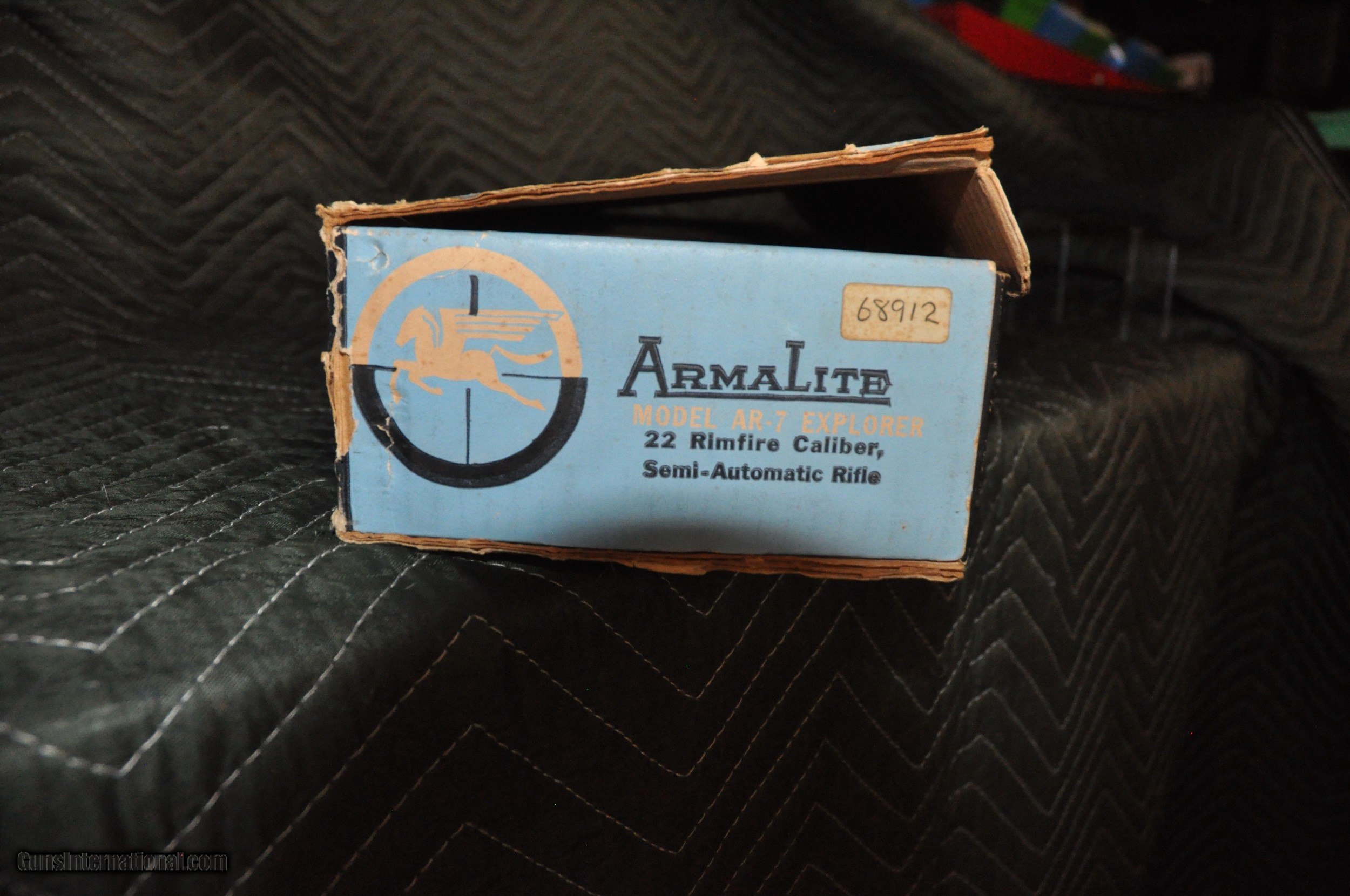 Description: An original Armalite AR-7 Explorer in its original box. The mechanics are good. There is some muzzle wear and light scratches on the stock: check the high resolution photos. The bore is very good. I have shot this rifle and found it is quite accurate at 25 and 50 yards. It is a fun rifle and if you have kids to take out to shoot, this will make it more fun. SOLD Rifle Caliber: .22 Long Rifle |