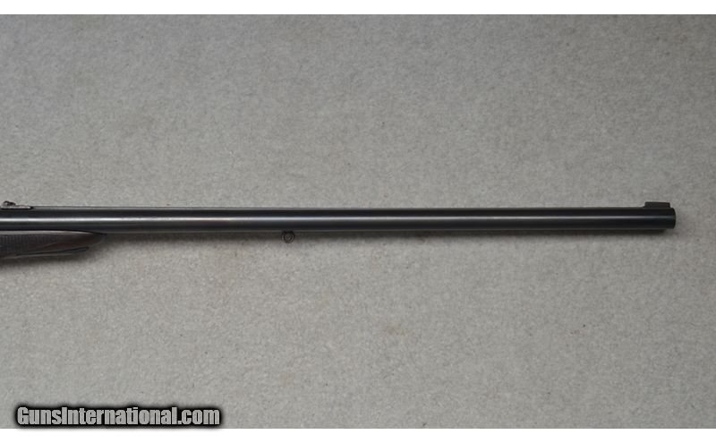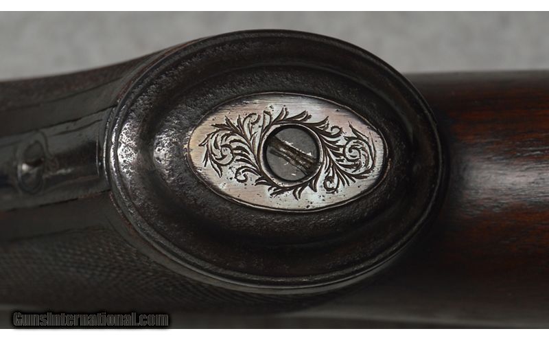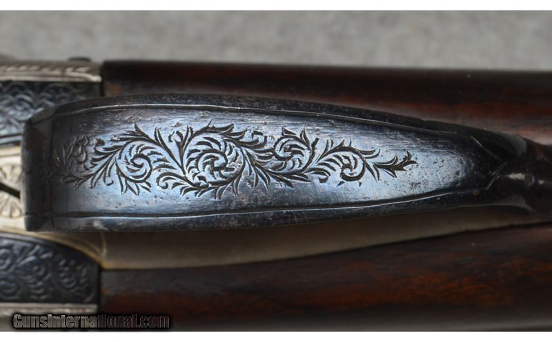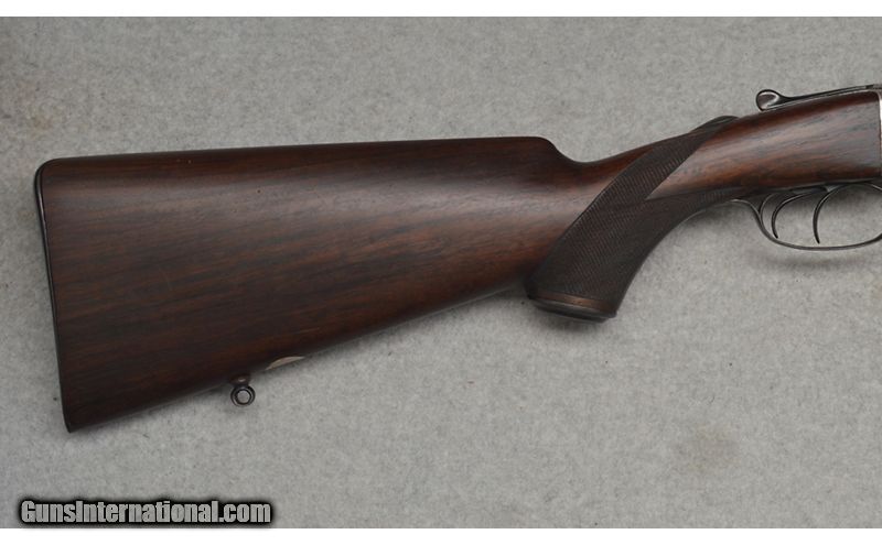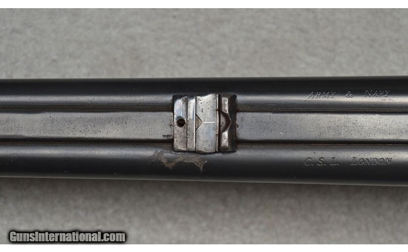 Description: Engraved Army & Navy CSL Boxlock Double Rifle in excellent condition. This rifle features London Blackpowder proofs on the flats with caliber marked "450EX". Bright polished boxlock action with near full coverage floral scroll surrounding "ARMY & NAVY CSL" on either side. Nicely figured, multi-point checkered walnut splinter forend with engraved fittings and rotary latch release and pistol grip stock with blued grip cap, blank inscription oval, smooth steel buttplate. Includes takedown case with gun data sheet. Finish in excellent shape with reapplied bluing, the replacement wood is in very good condition with minor handling marks. SN: 5649 None SOLD Chambers: 3 1/4" CASE Metal Condition: Excellent Wood Condition: Excellent Bore Condition: Clean Barrels: 27" Solid Rib Stock Dimensions: 14 9/16" LOP Weight: 9 Lb 1 oz Item Location: Fort Worth, TX |