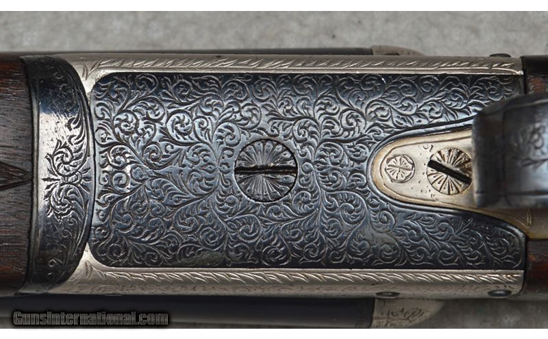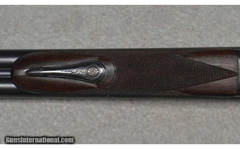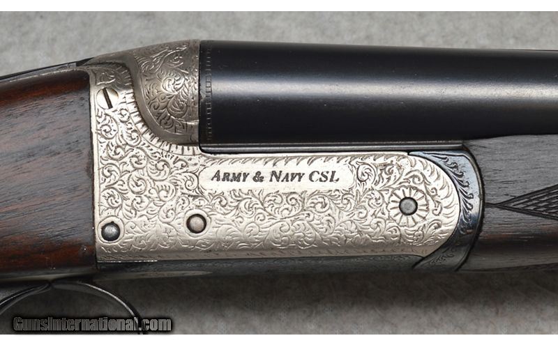 Description: Engraved Army & Navy CSL Boxlock Double Rifle in excellent condition. This rifle features London Blackpowder proofs on the flats with caliber marked "450EX". Bright polished boxlock action with near full coverage floral scroll surrounding "ARMY & NAVY CSL" on either side. Nicely figured, multi-point checkered walnut splinter forend with engraved fittings and rotary latch release and pistol grip stock with blued grip cap, blank inscription oval, smooth steel buttplate. Includes takedown case with gun data sheet. Finish in excellent shape with reapplied bluing, the replacement wood is in very good condition with minor handling marks. SN: 5649 None SOLD Chambers: 3 1/4" CASE Metal Condition: Excellent Wood Condition: Excellent Bore Condition: Clean Barrels: 27" Solid Rib Stock Dimensions: 14 9/16" LOP Weight: 9 Lb 1 oz Item Location: Fort Worth, TX |